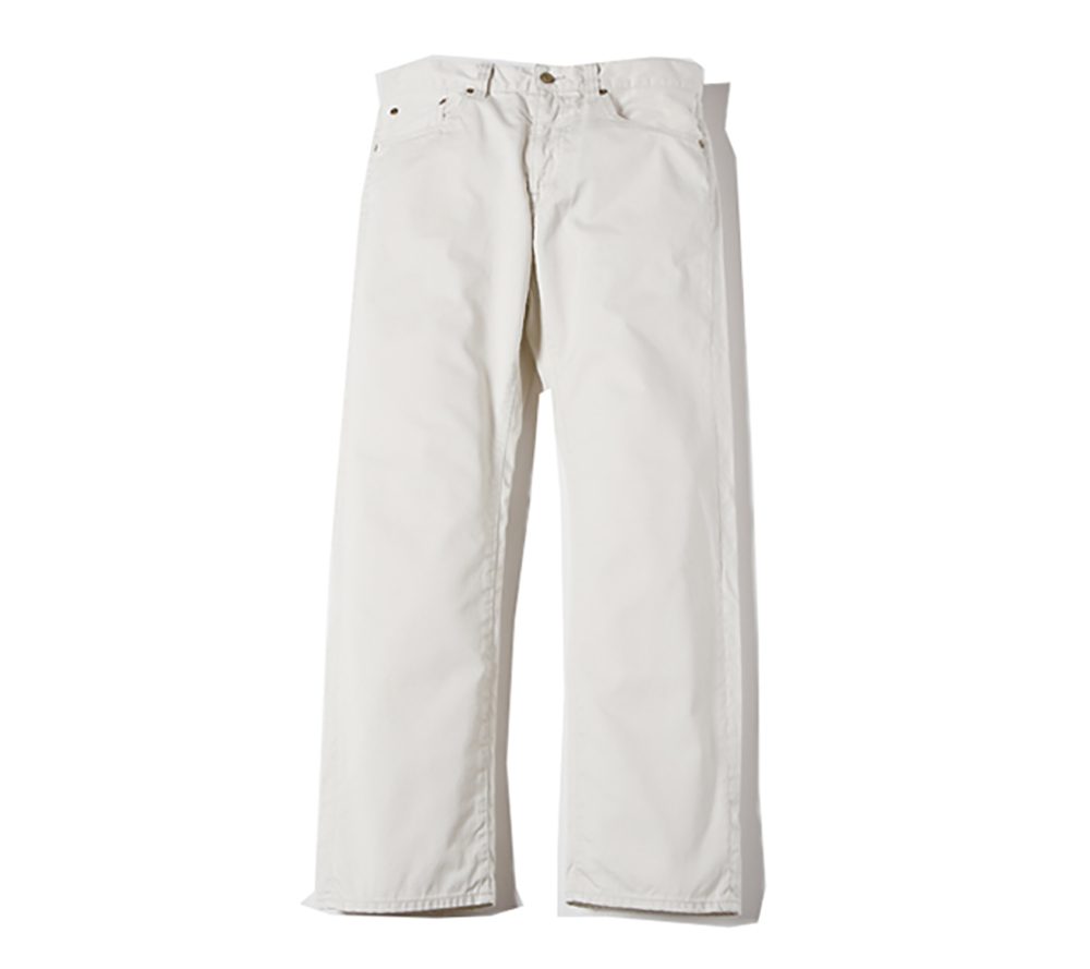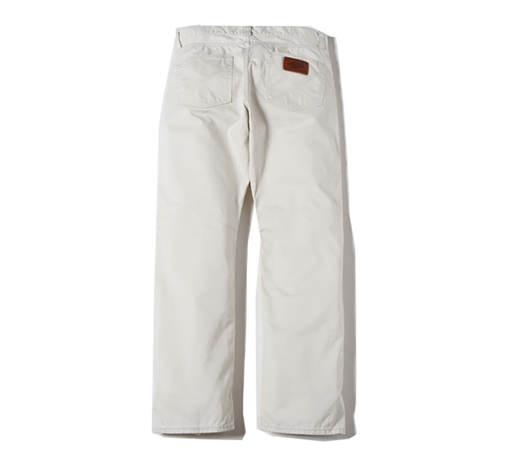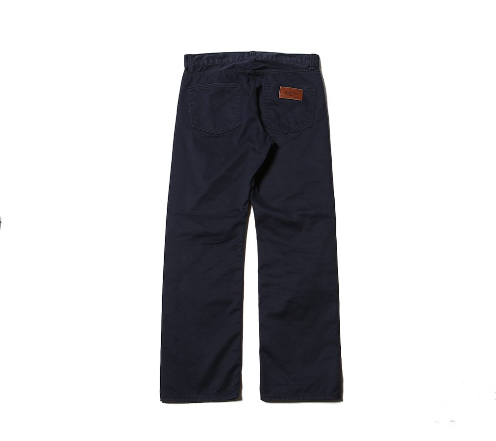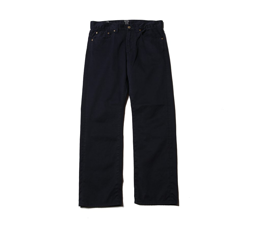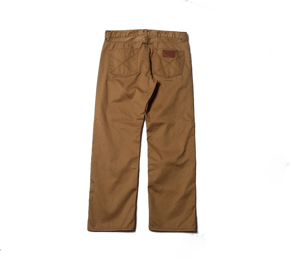 ウエストポイントチノクロスを使用した5ポケットスリムタイプチノーズになります。股上を浅めに設定しており、ワタリ部分からのテーパードを強めにかけた細身で綺麗なシルエットのチノーズとなっております。また、ボールバイオウォッシュを施しておりますのでヴィンテージライクな雰囲気のある1本に仕上がっております。