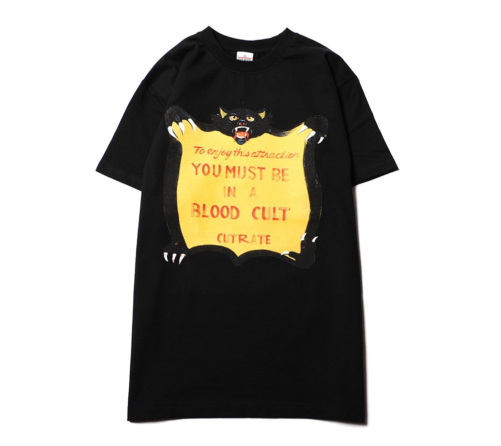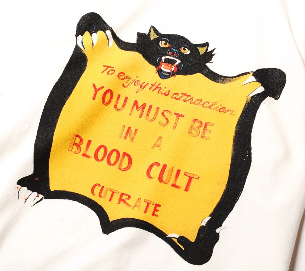 コットン100%の程よい肉厚感で製作したオリジナルTシャツ。アトラクションのCAUTIONマークをサンプリングしたデザインがフロントに入ります。CUTRATEのブランドアイデンティティーを、上手く落とし込んだ一枚。