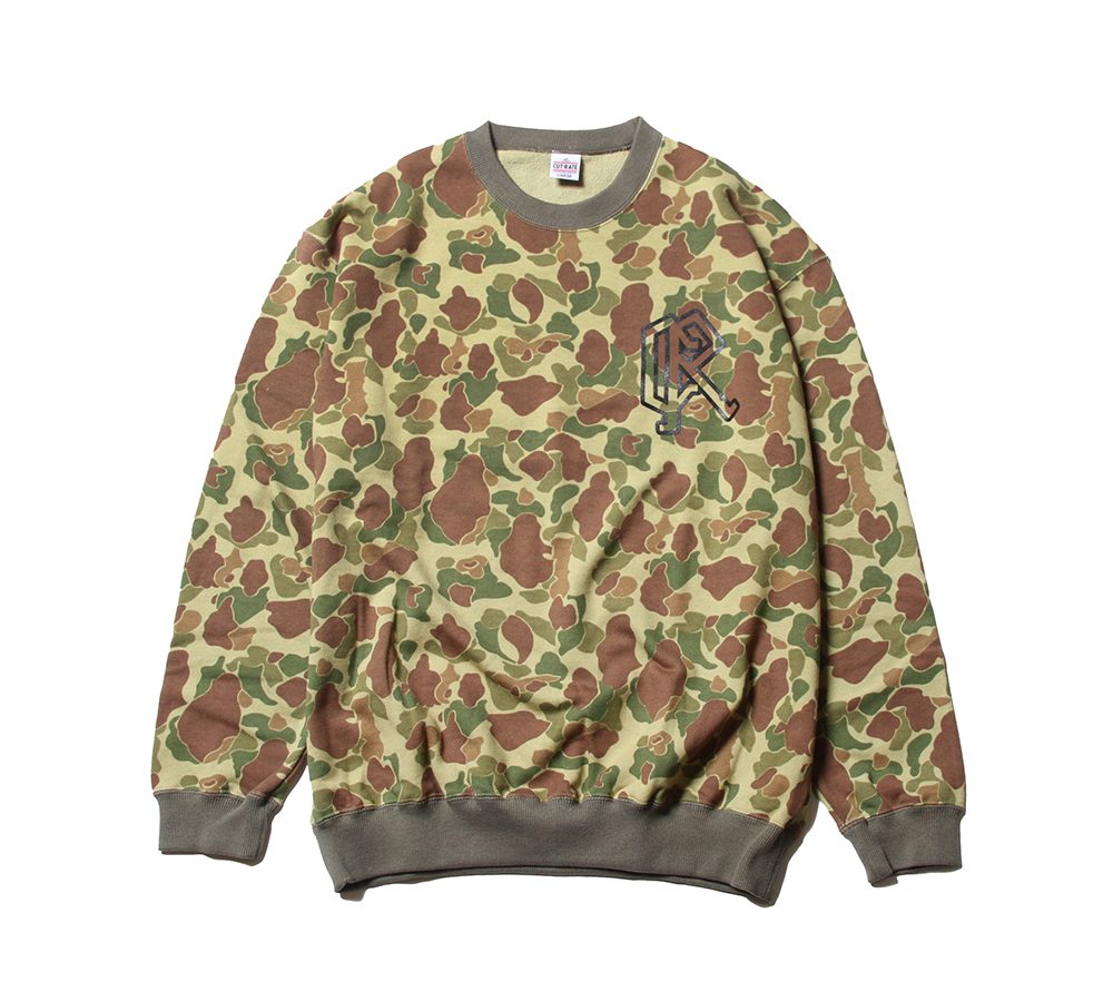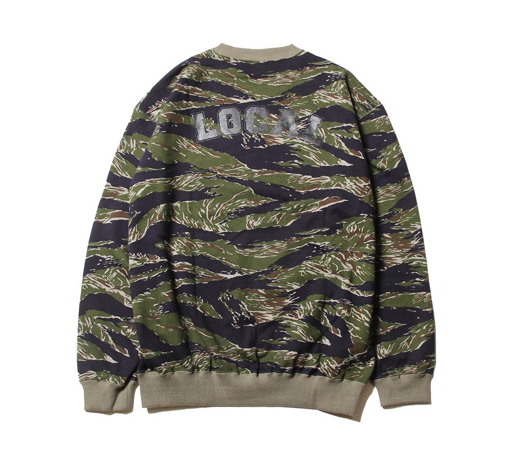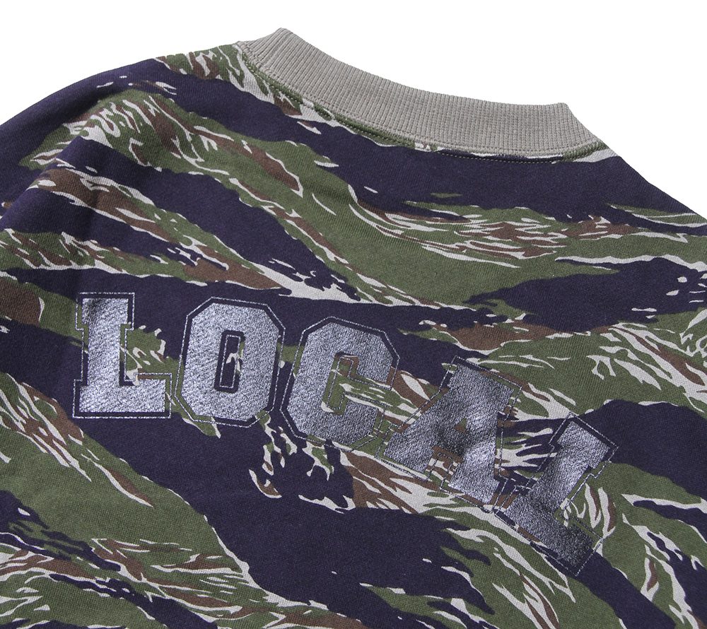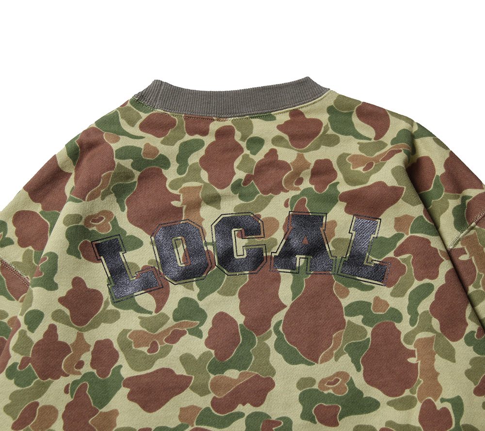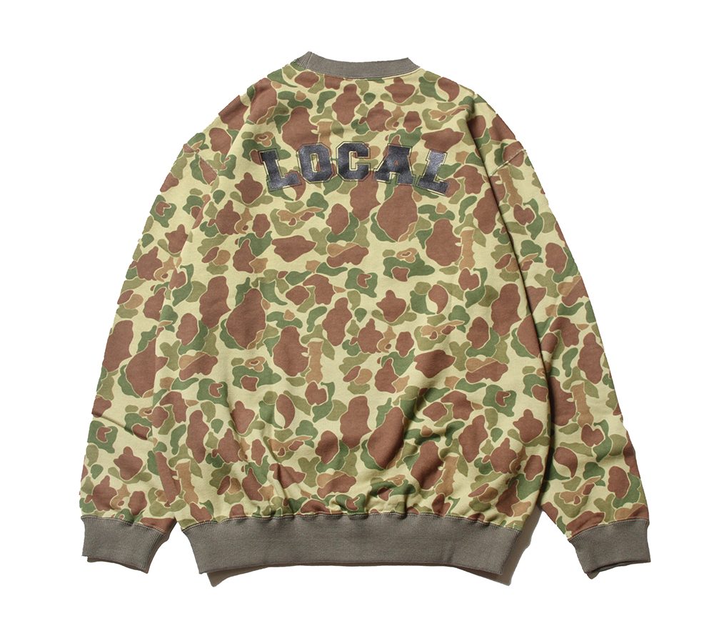 タイガーカモ、ダッグハンターカモで作製されたクルーネックスウェット。シンプルにフロント左胸にはロゴ、バックには”LOCAL"とプリント。