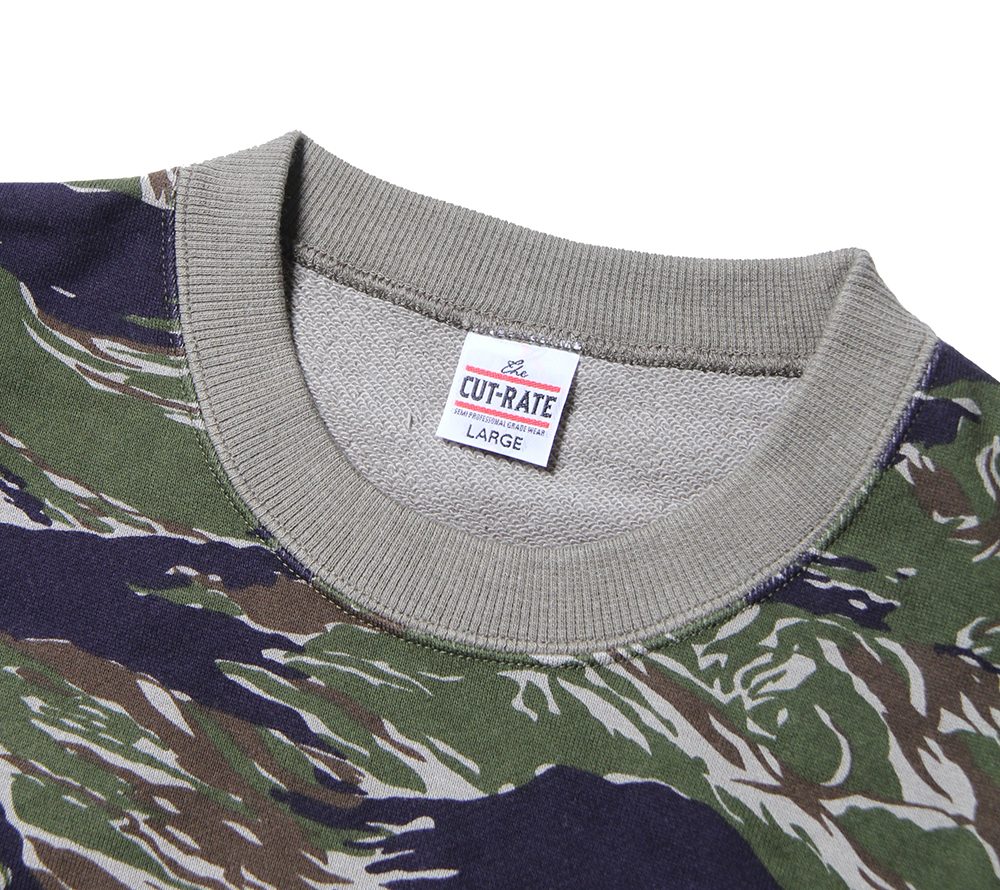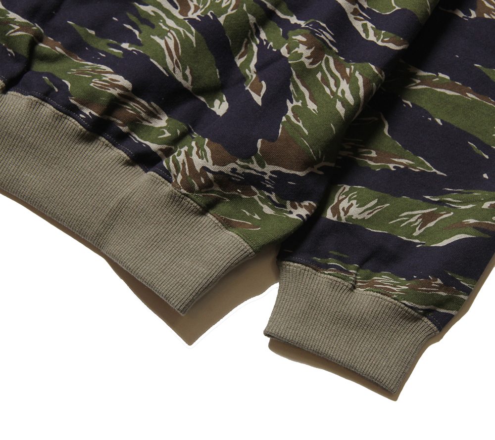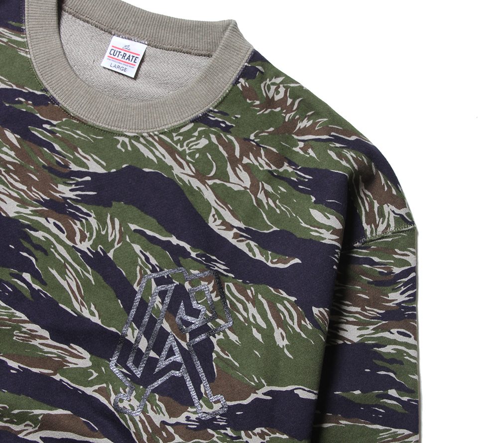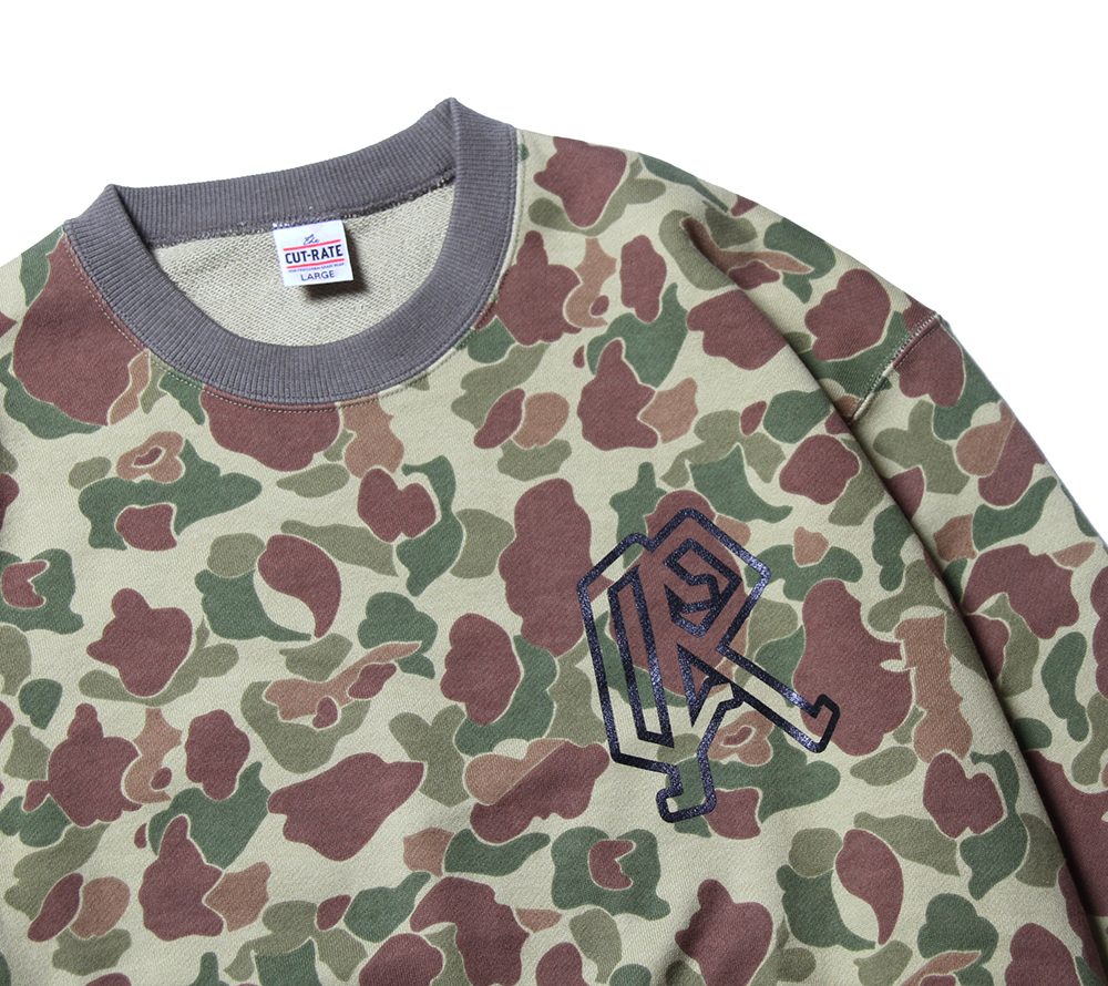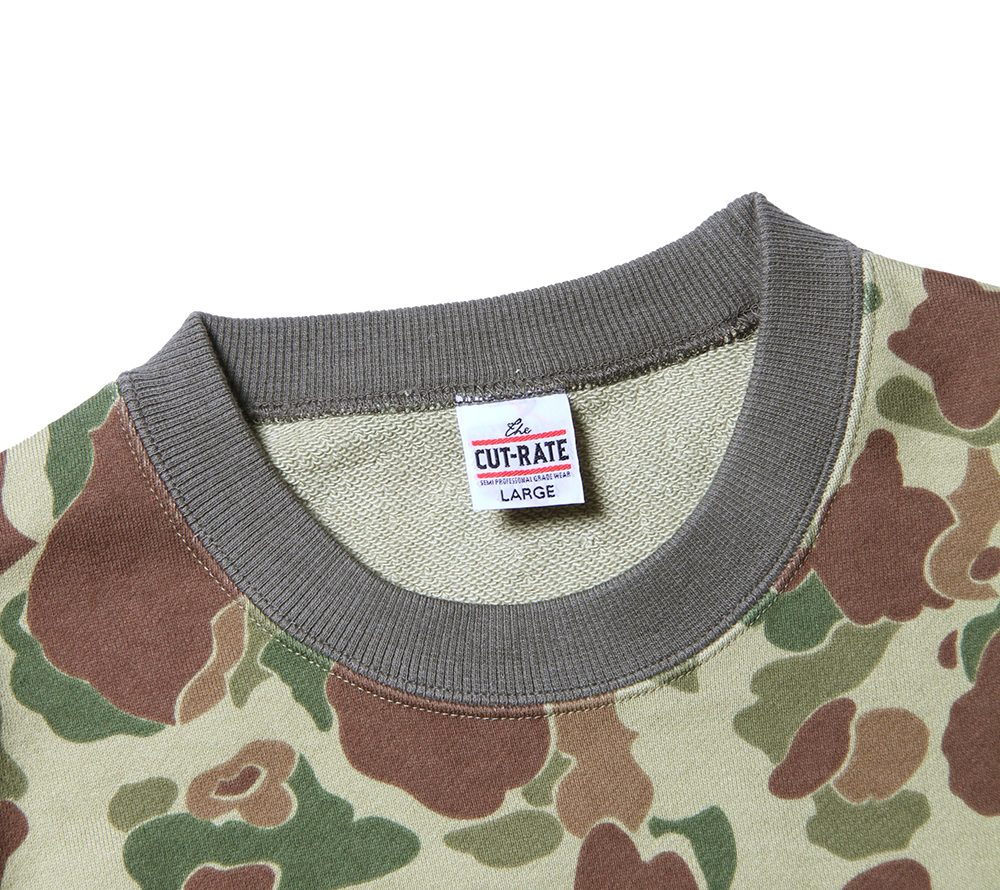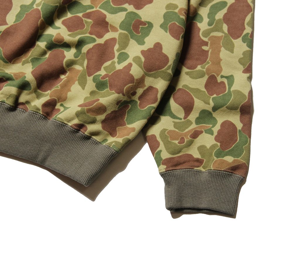タイガーカモ、ダッグハンターカモで作製されたクルーネックスウェット。シンプルにフロント左胸にはロゴ、バックには”LOCAL"とプリント。