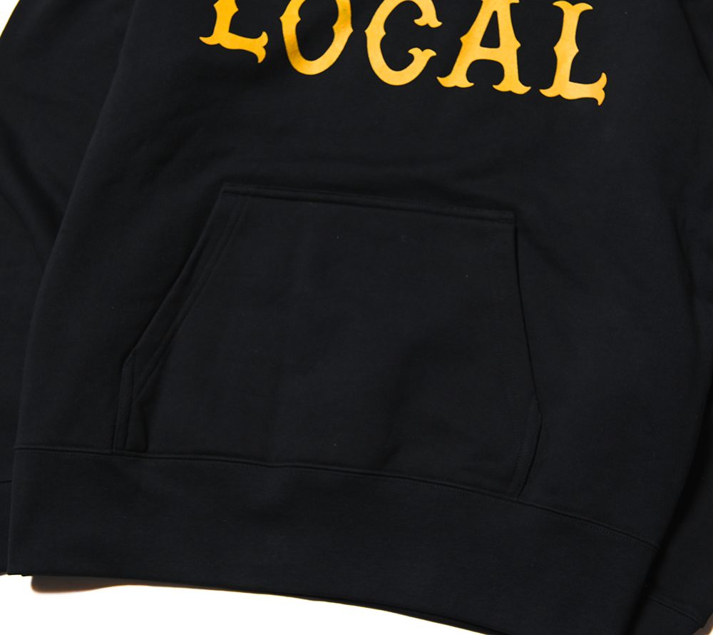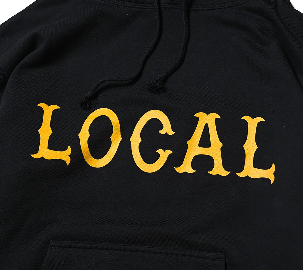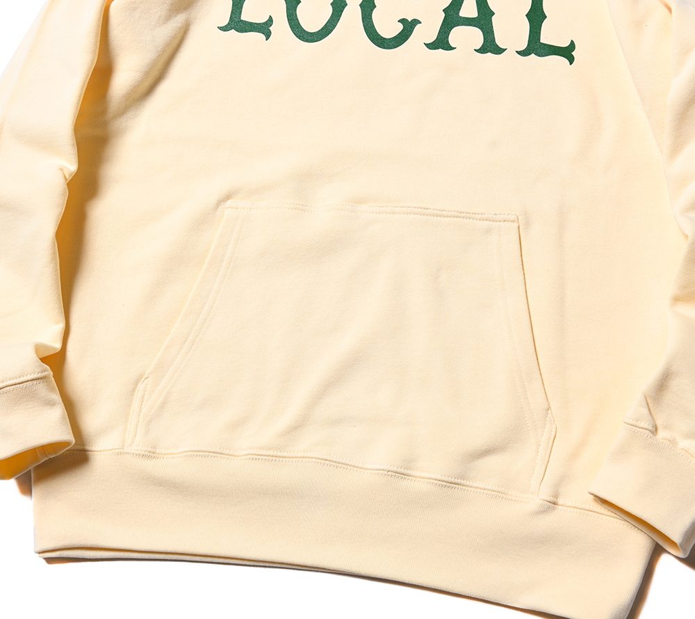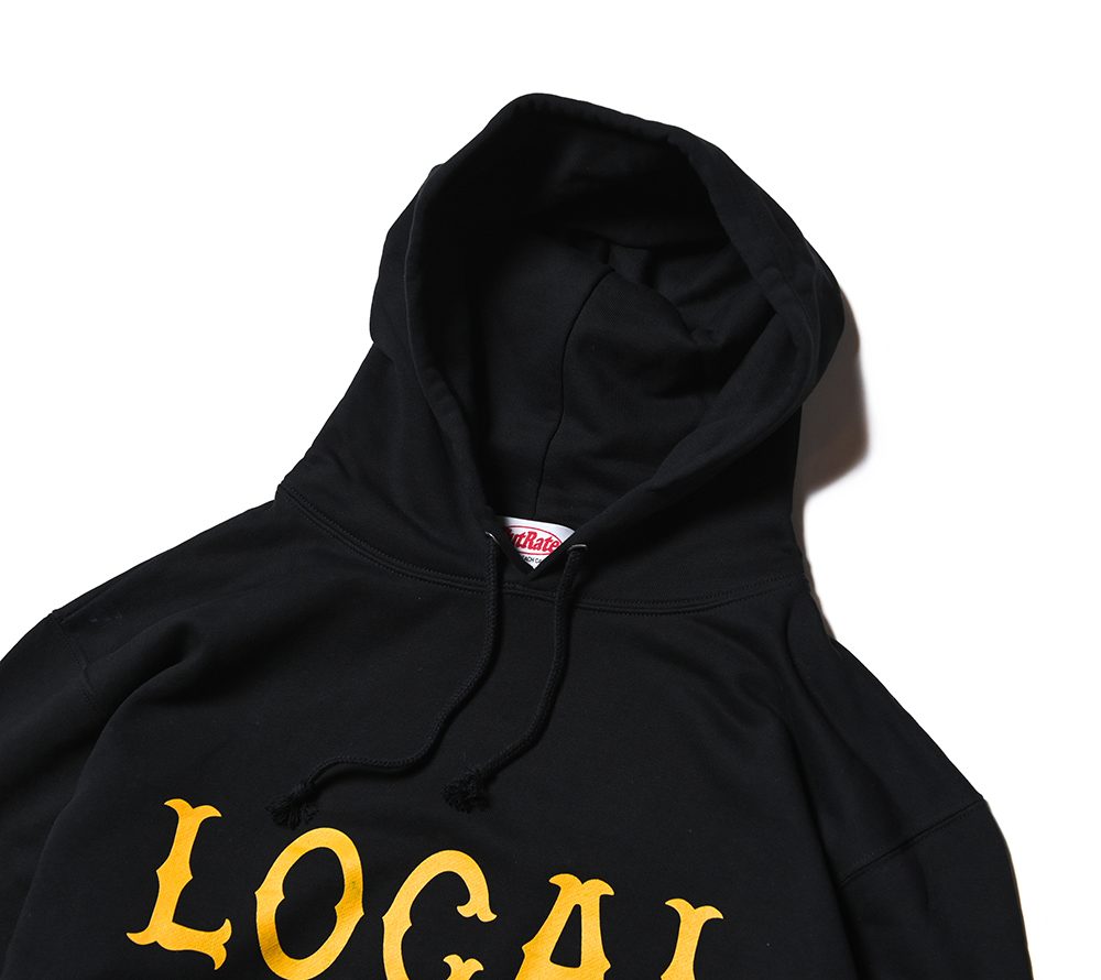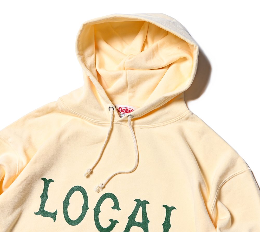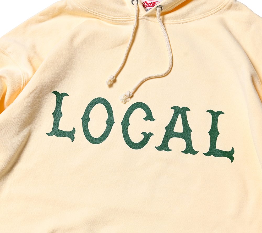 フロントにCUTRATEのアイコンでもある”LOCAL”ロゴをプリントで落とし込んだデザイン。シルエットはレギュラーシルエットのプルオーバーフーディーで製作。