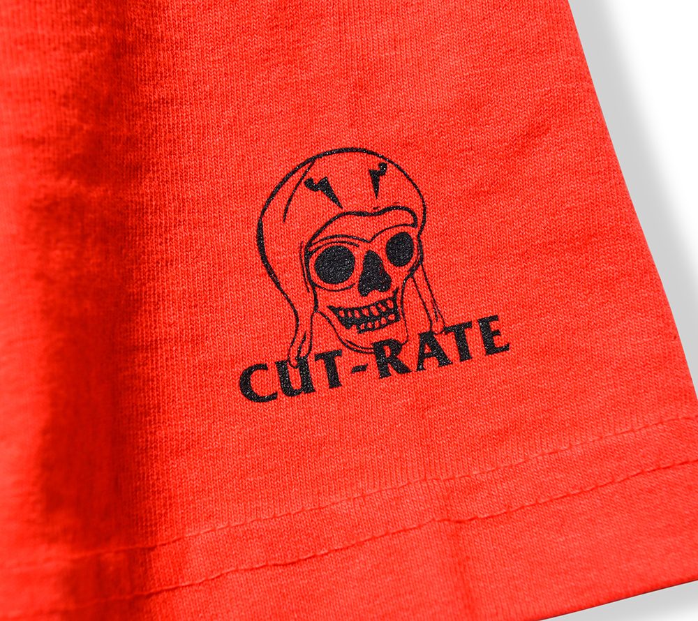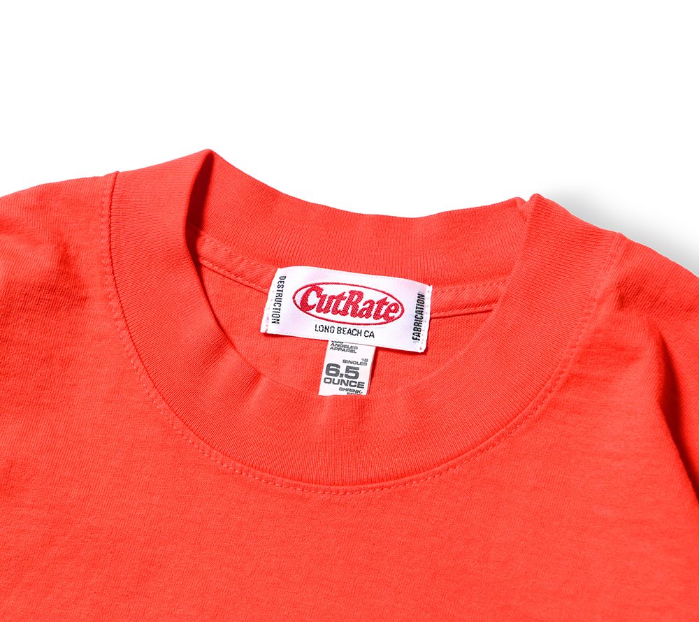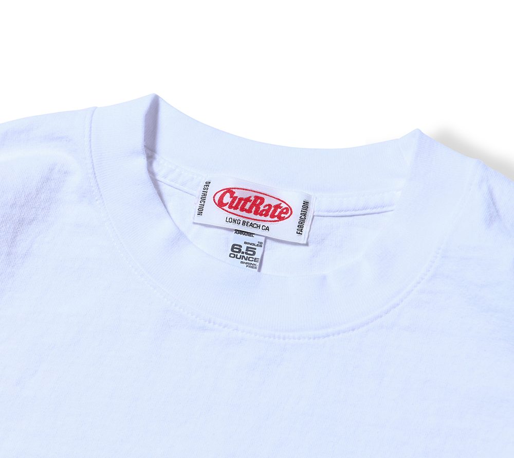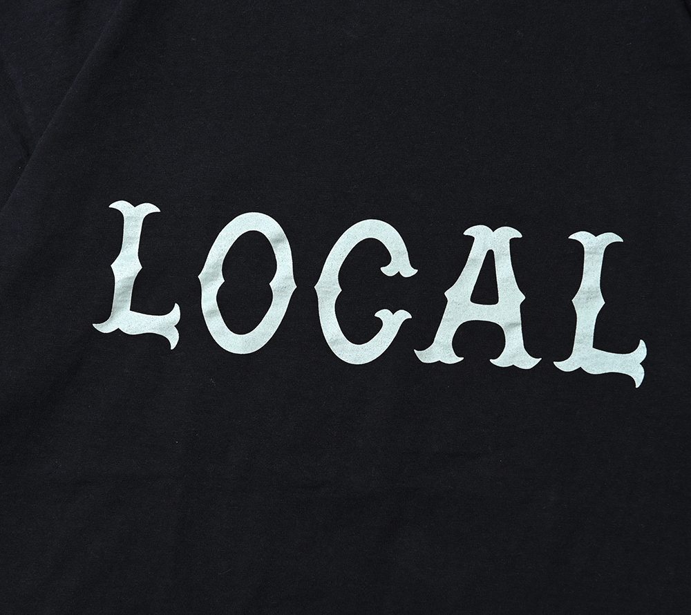 袖口にワンポイントでスカルロゴを落とし込んだデザイン。フロントにCUTRATEのアイコンでもある"LOCAL"ロゴが入る。ボディーは6.5オンスの重量感と丈夫さが特徴のMADE IN USAのLOS ANGELES APPARELボディーのガーメントダイ(後染の)半袖Tシャツで製作。