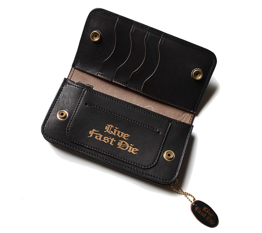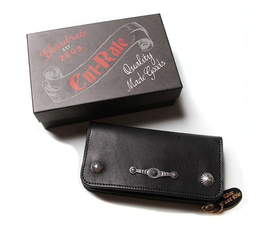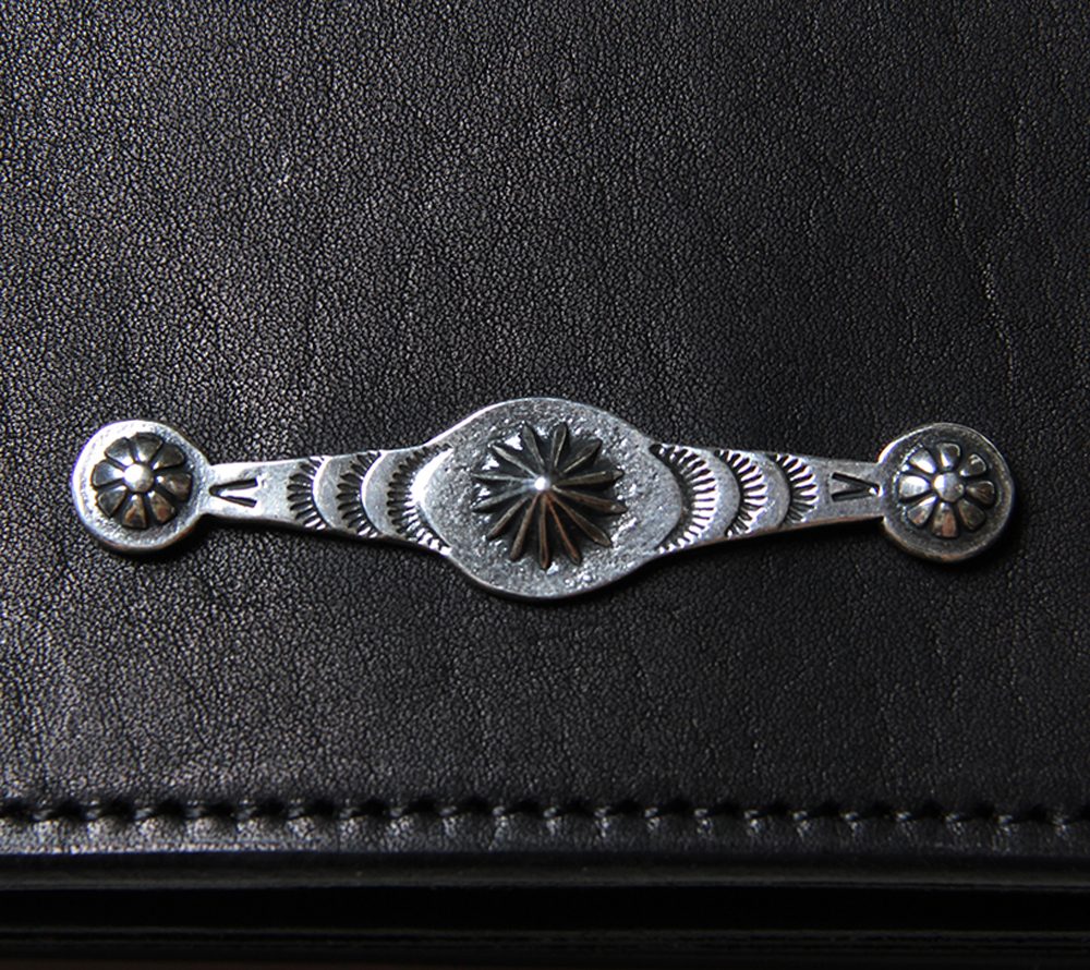 カウレザーを使用したロングタイプのウォレットになります。フロントの両サイドにシルバーコンチョ、センターにはシルバーのプレートが施されております。インサイドにはカードの仕切りを多く取ったカッティング仕様となっておりますので、使い勝手も良いウォレットに仕上がっております。