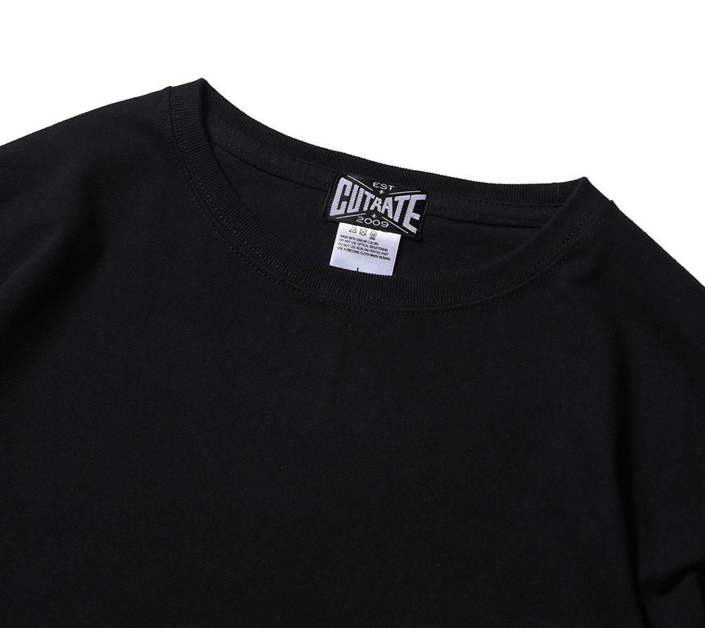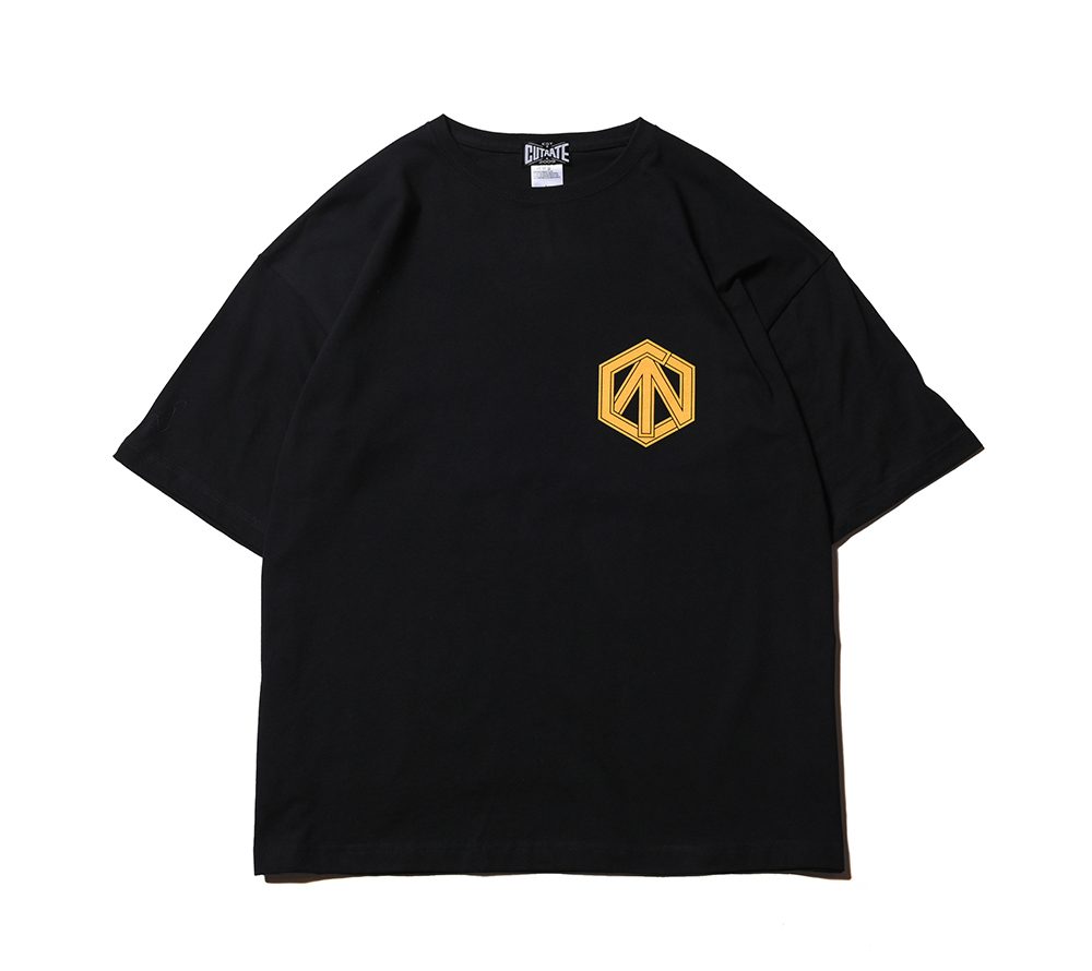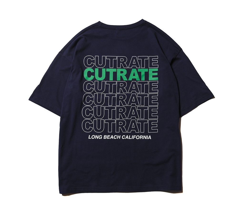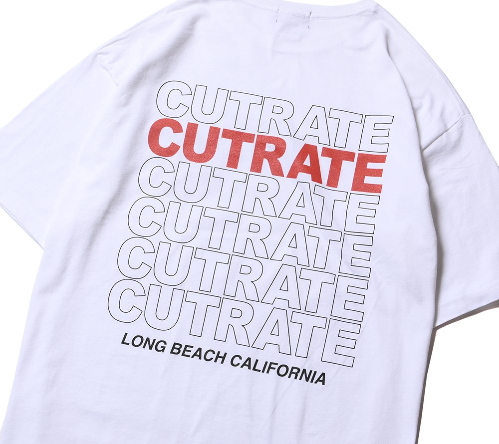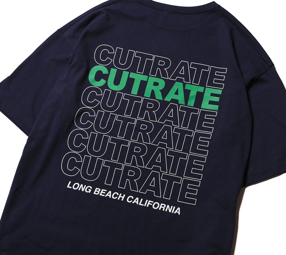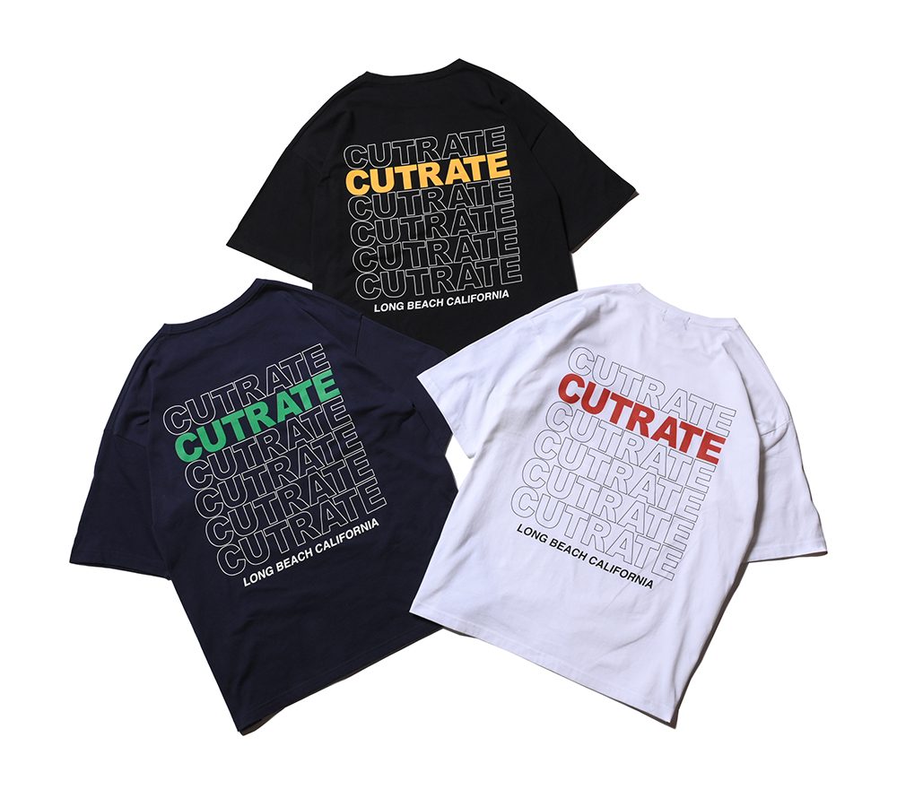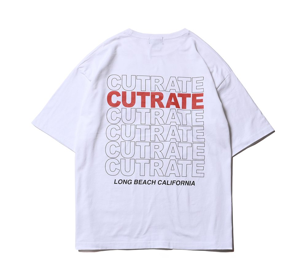 フロントバッグにCUTRATEのイニシャルCRを掛け合わせたロゴを落とし込んだデザイン。バックにはCUTRATEロゴが配列でプリントが入る。シルエットはドロップショルダーで製作。