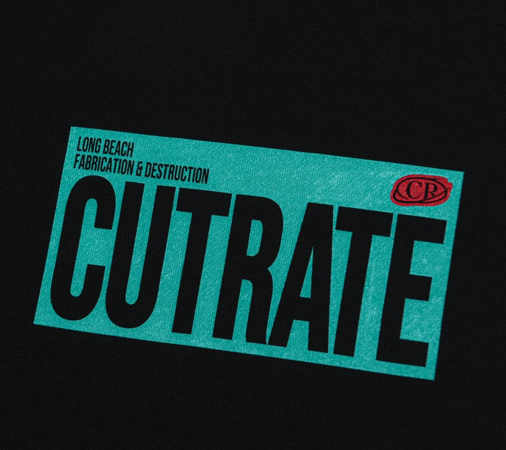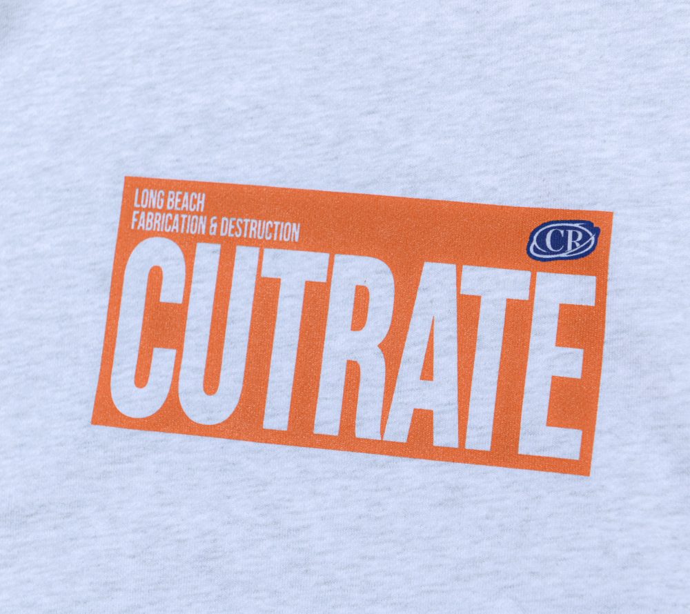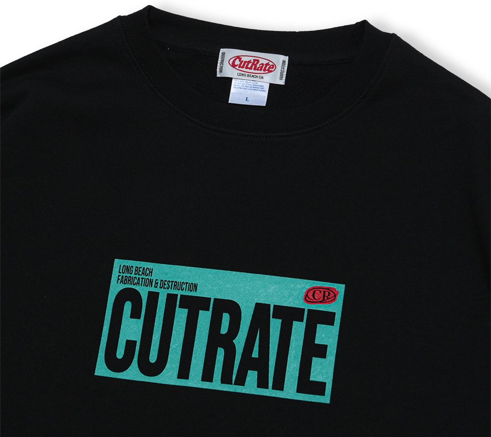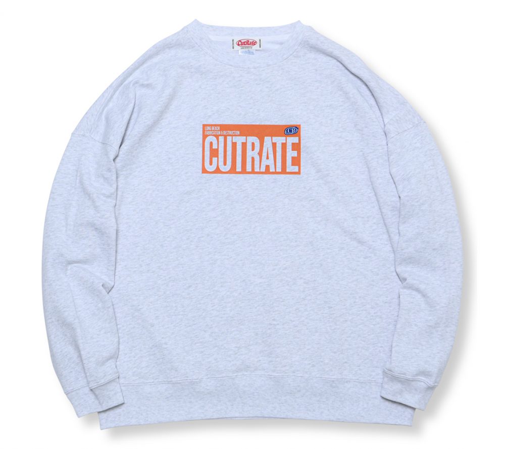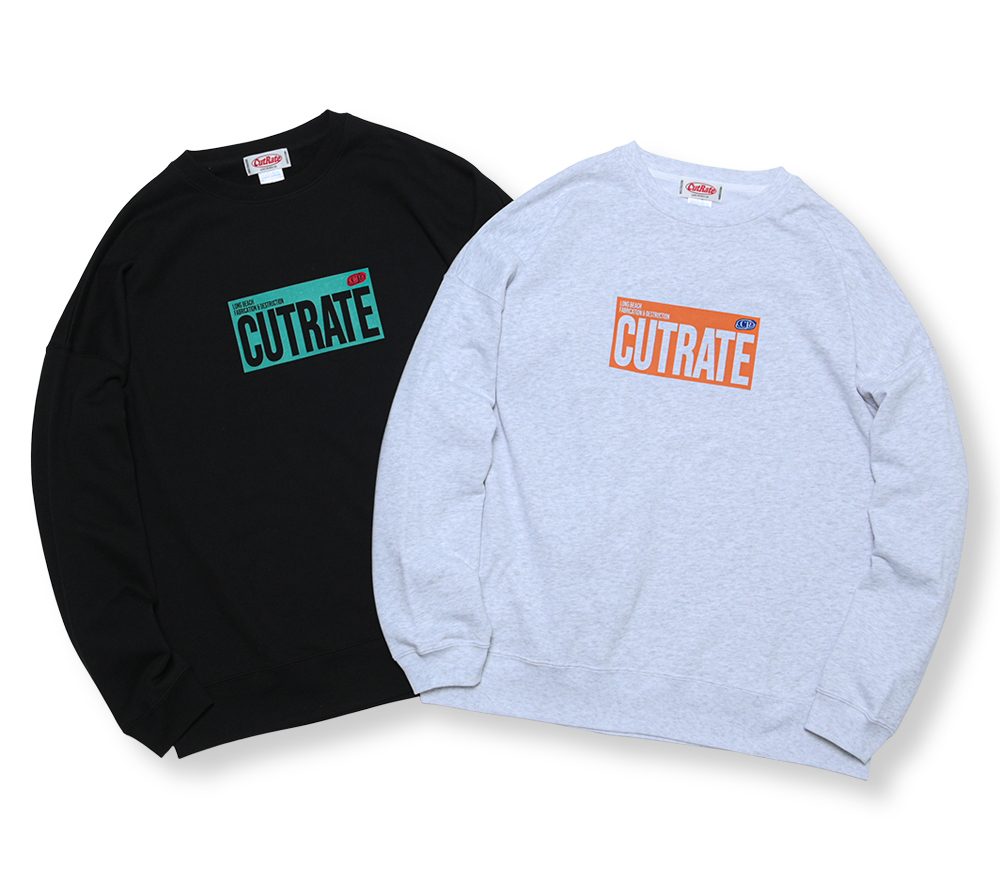 CUTRATEのBOX LOGOをフロントに落とし込んだクルーネックのスウェット。シルエットはドロップショルダーのクルーネックのスウェットで製作。