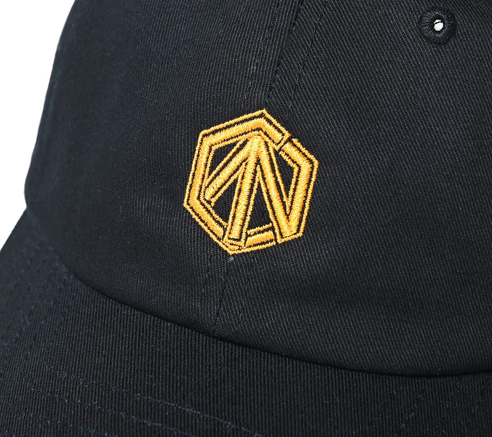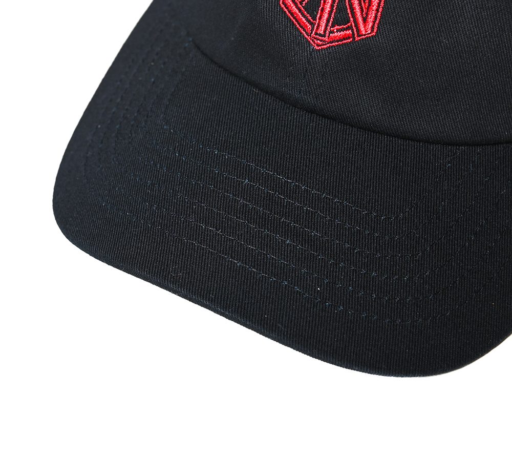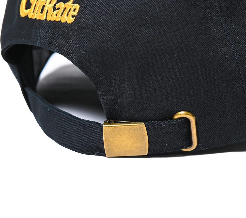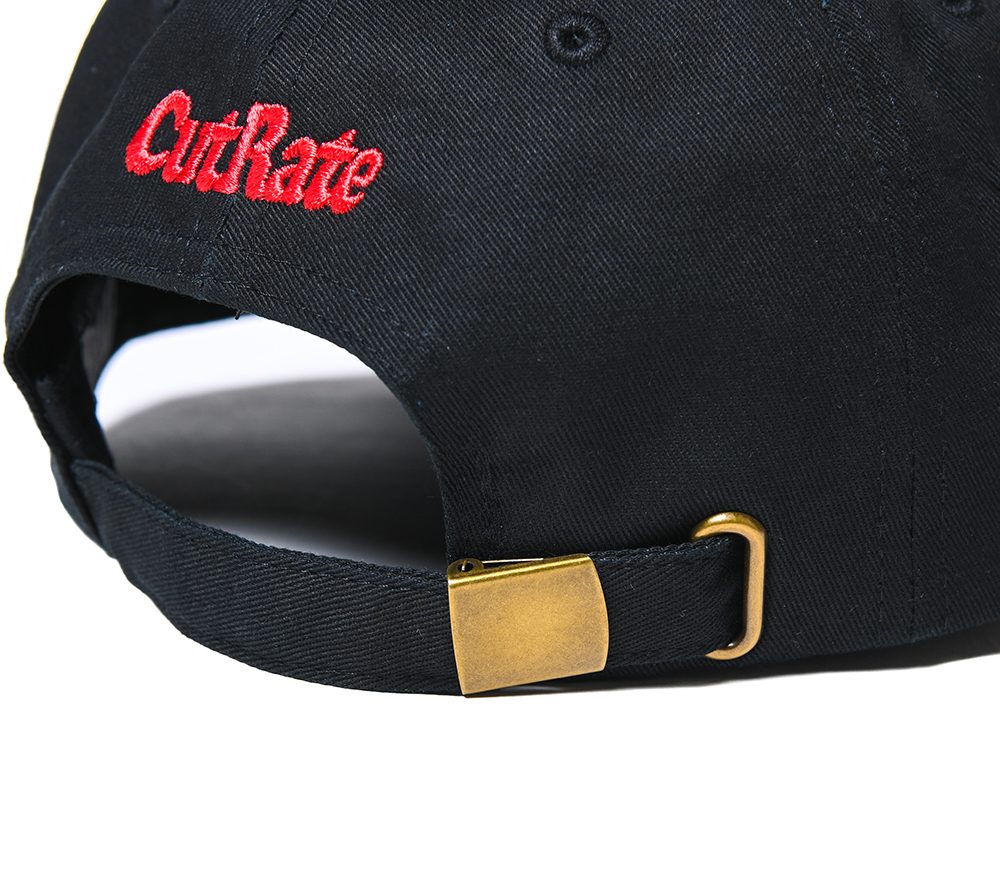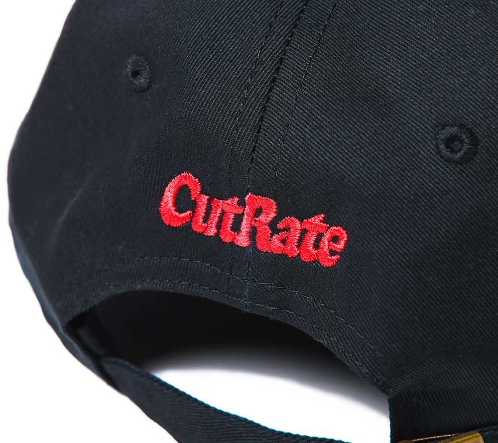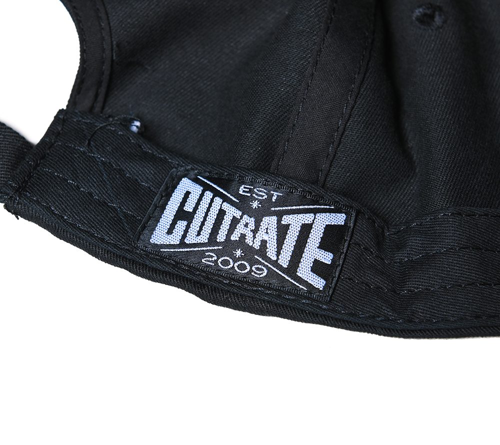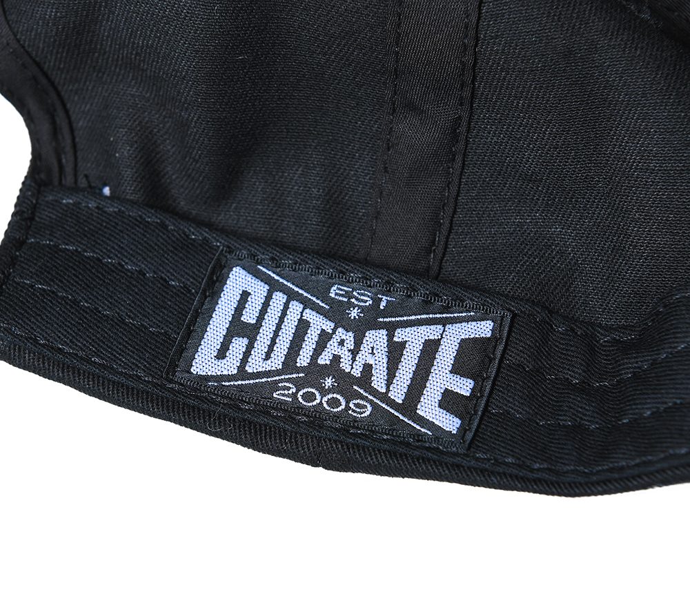 フロントバッグにCUTRATEのイニシャルCRを掛け合わせたロゴを落とし込んだデザイン。バックにもCUTRATEの刺繍が入る。 浅型のパネルCAPで製作。