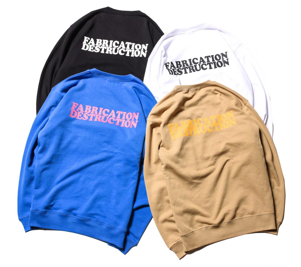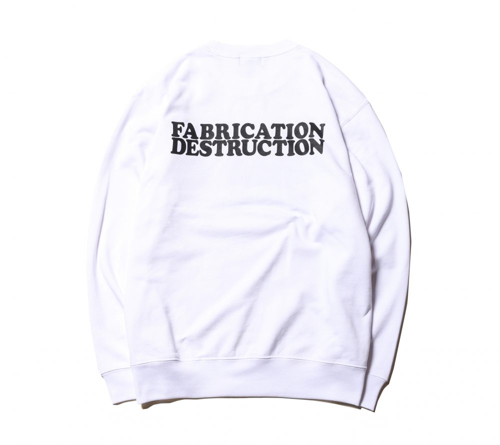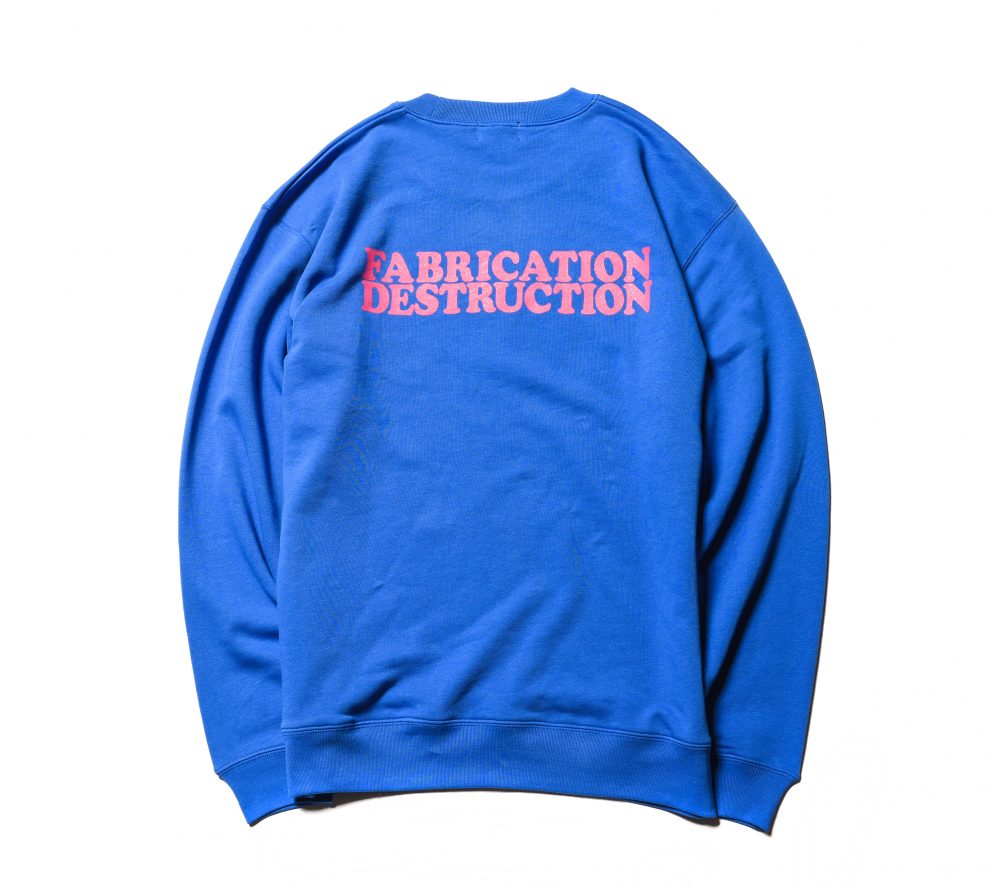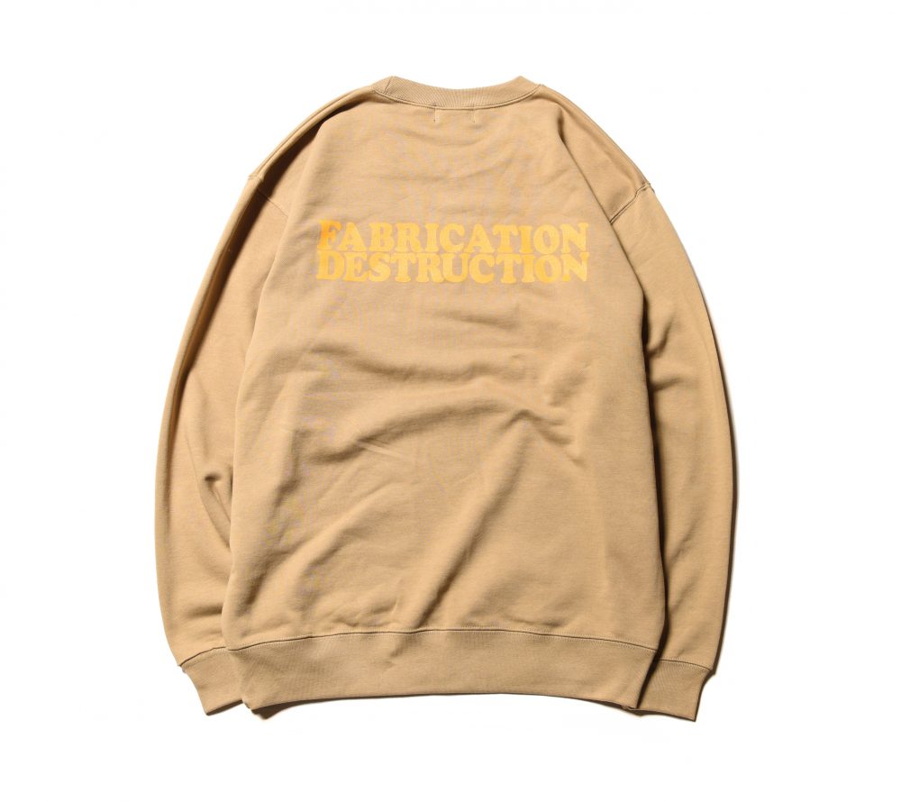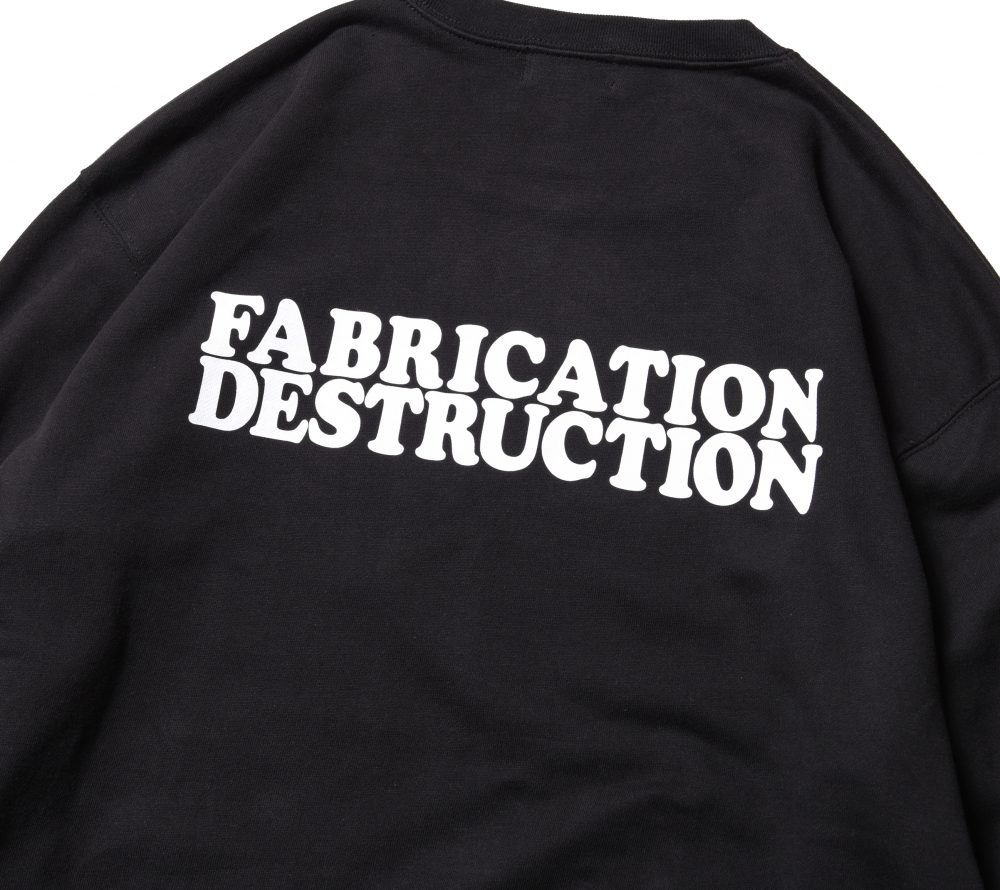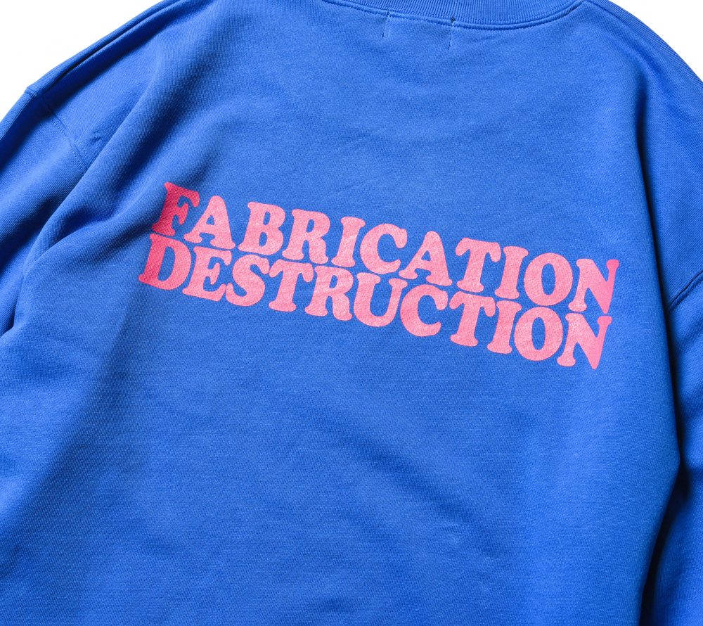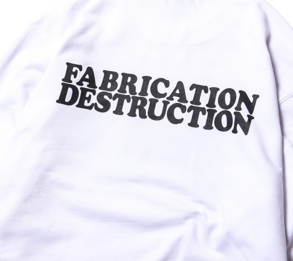 ヴィンテージポップなブランドロゴをフロントに落とし込んだデザイン。バックにも”FABRICATION AND DESTRUCTION”のプリントが入る。裏毛のライトオンスのスウェットで製作。