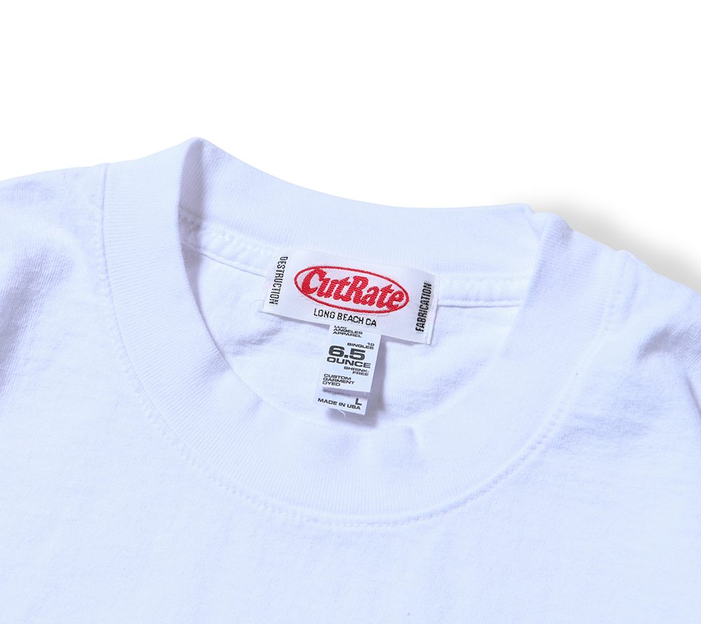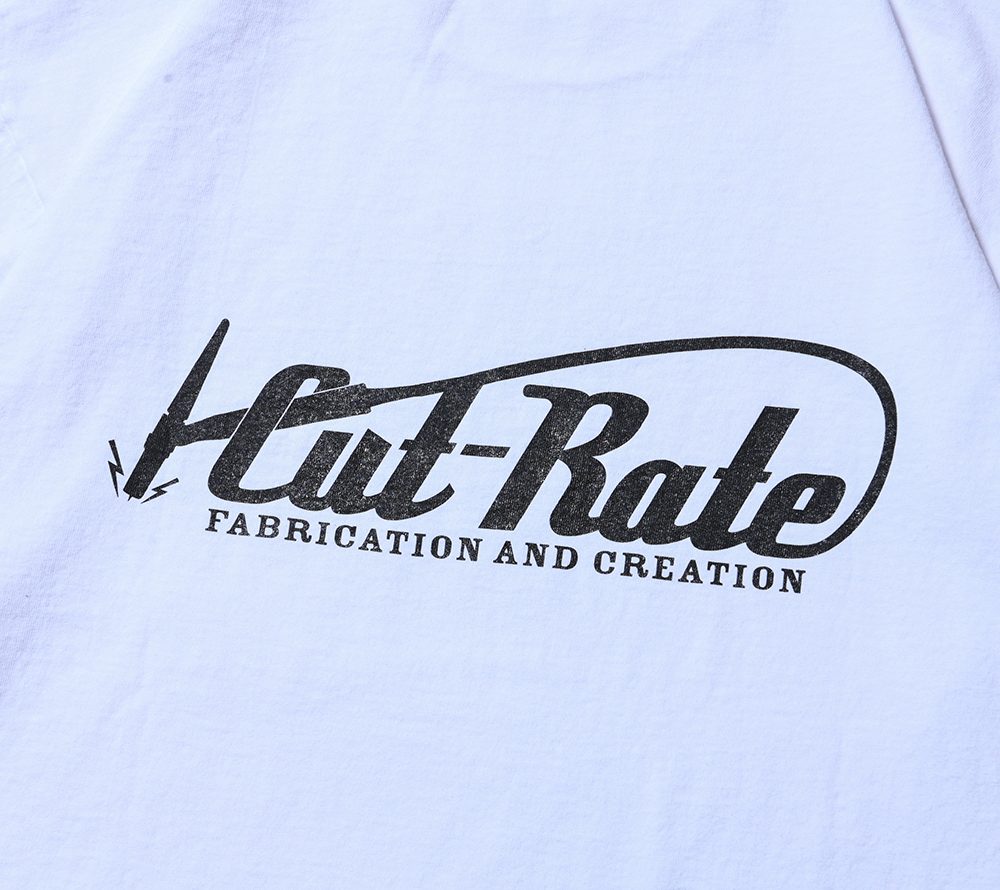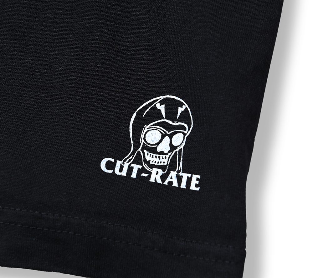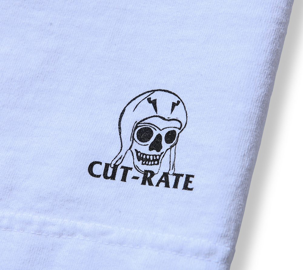 フロント裾にワンポイントでスカルロゴを落とし込んだデザイン。バックにはCUTRATEロゴが入る。ボディーは6.5オンスの重量感と丈夫さが特徴のMADE IN USAのLOS ANGELES APPARELボディーのガーメントダイ(後染の)半袖Tシャツで製作。