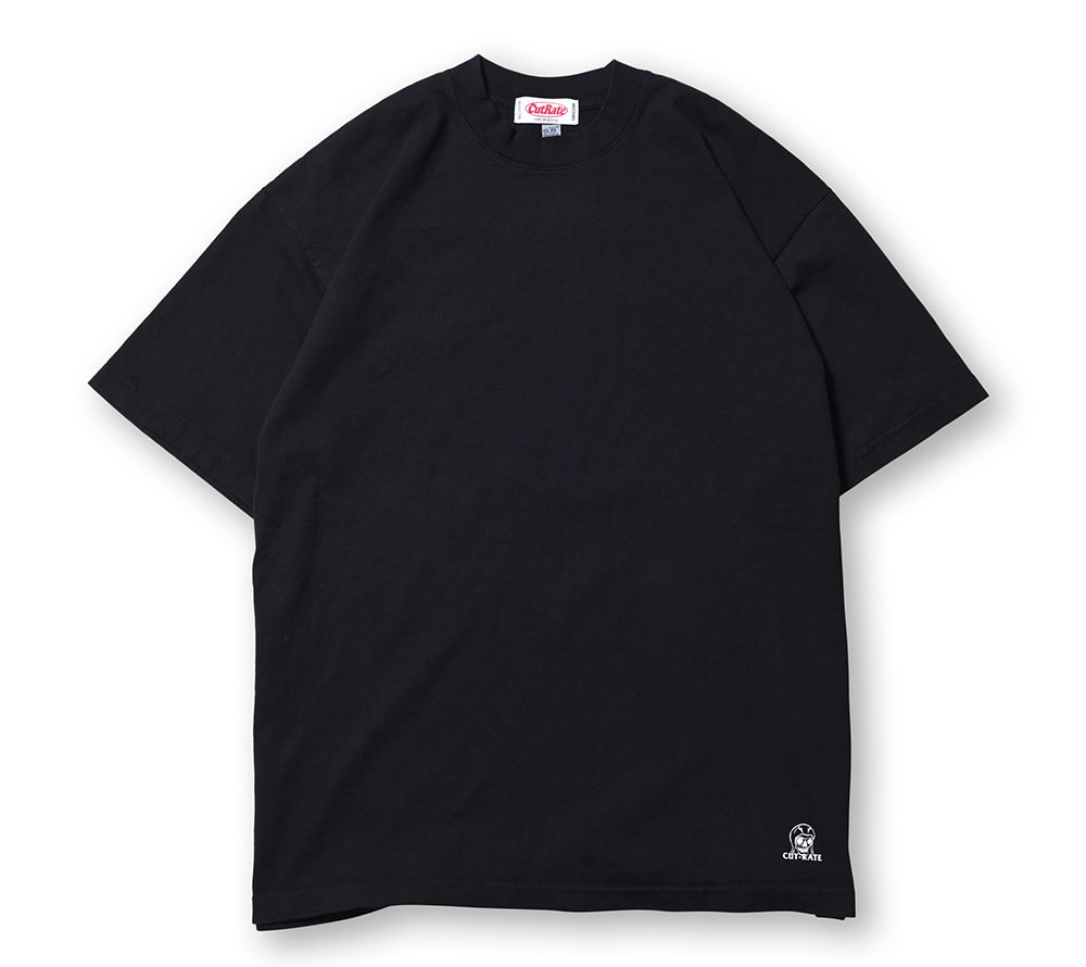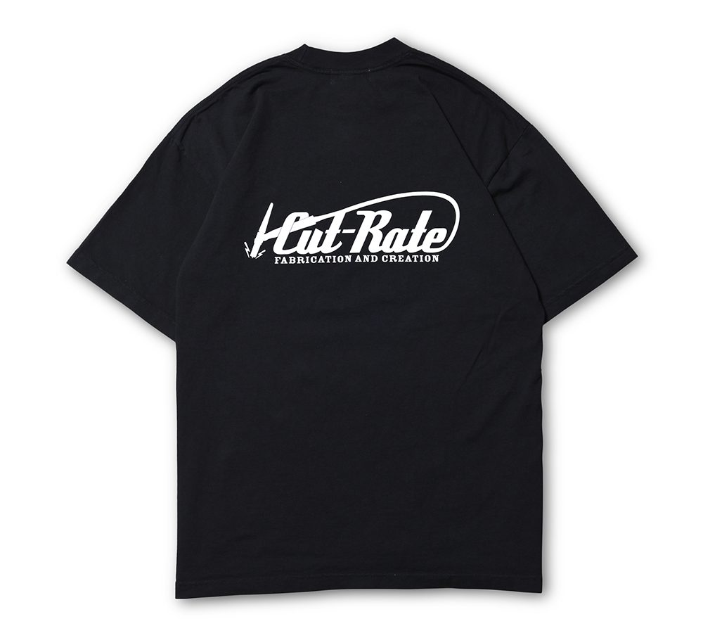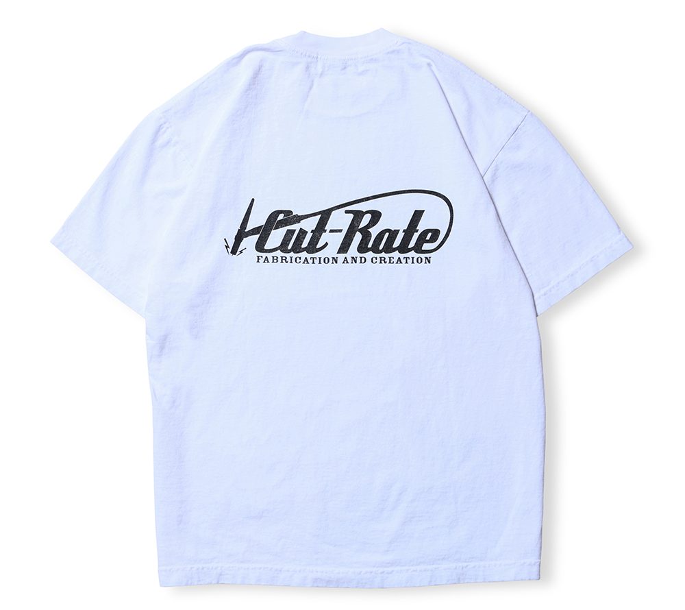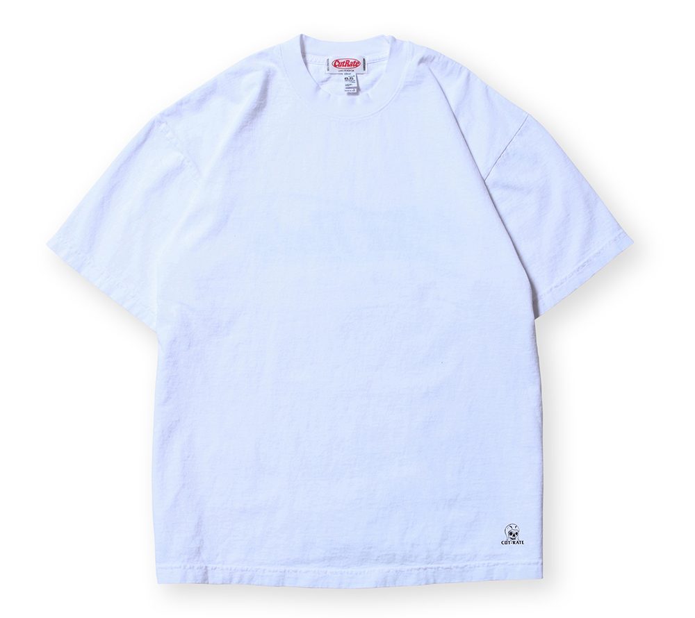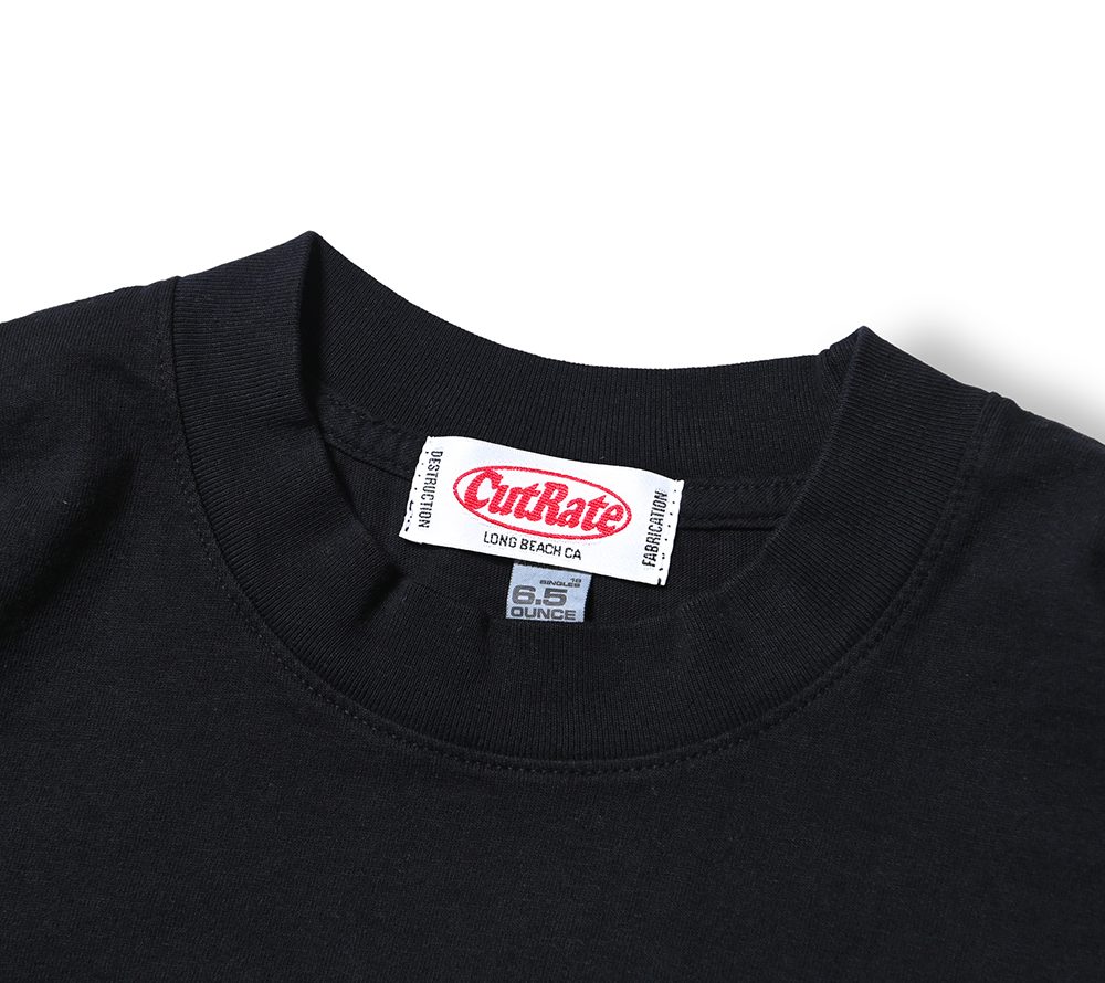 フロント裾にワンポイントでスカルロゴを落とし込んだデザイン。バックにはCUTRATEロゴが入る。ボディーは6.5オンスの重量感と丈夫さが特徴のMADE IN USAのLOS ANGELES APPARELボディーのガーメントダイ(後染の)半袖Tシャツで製作。