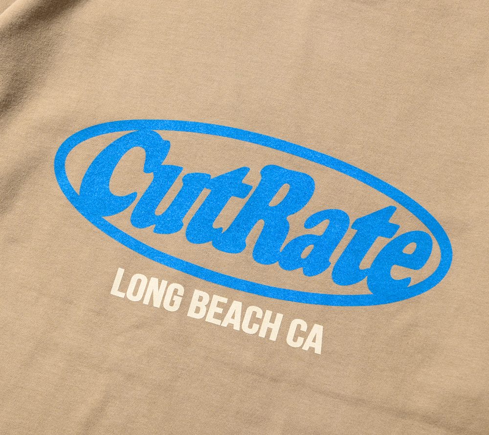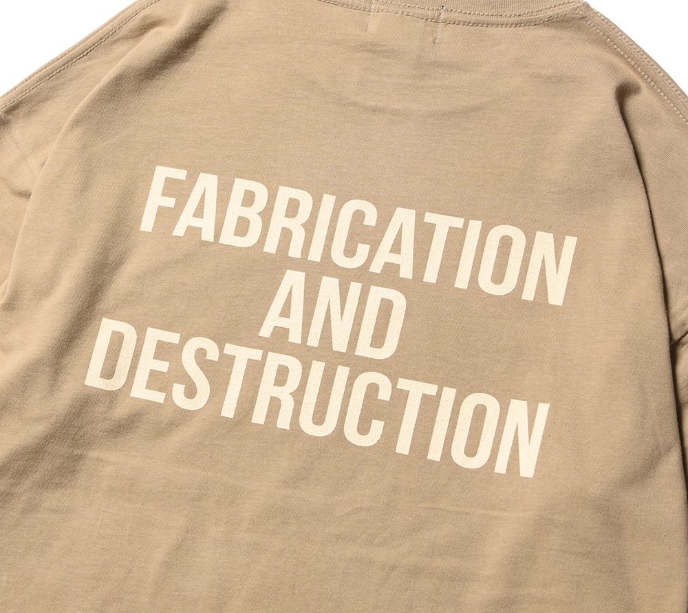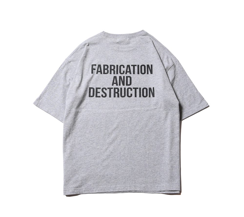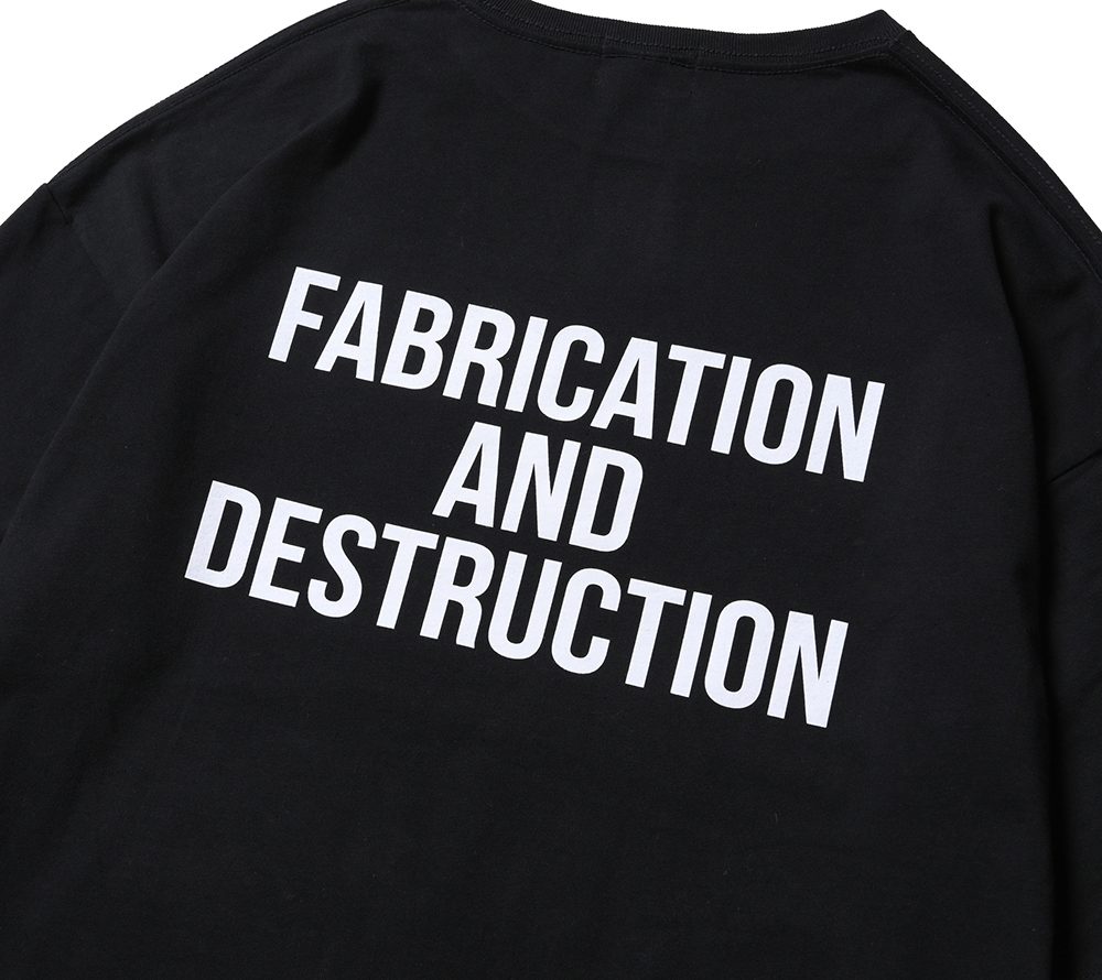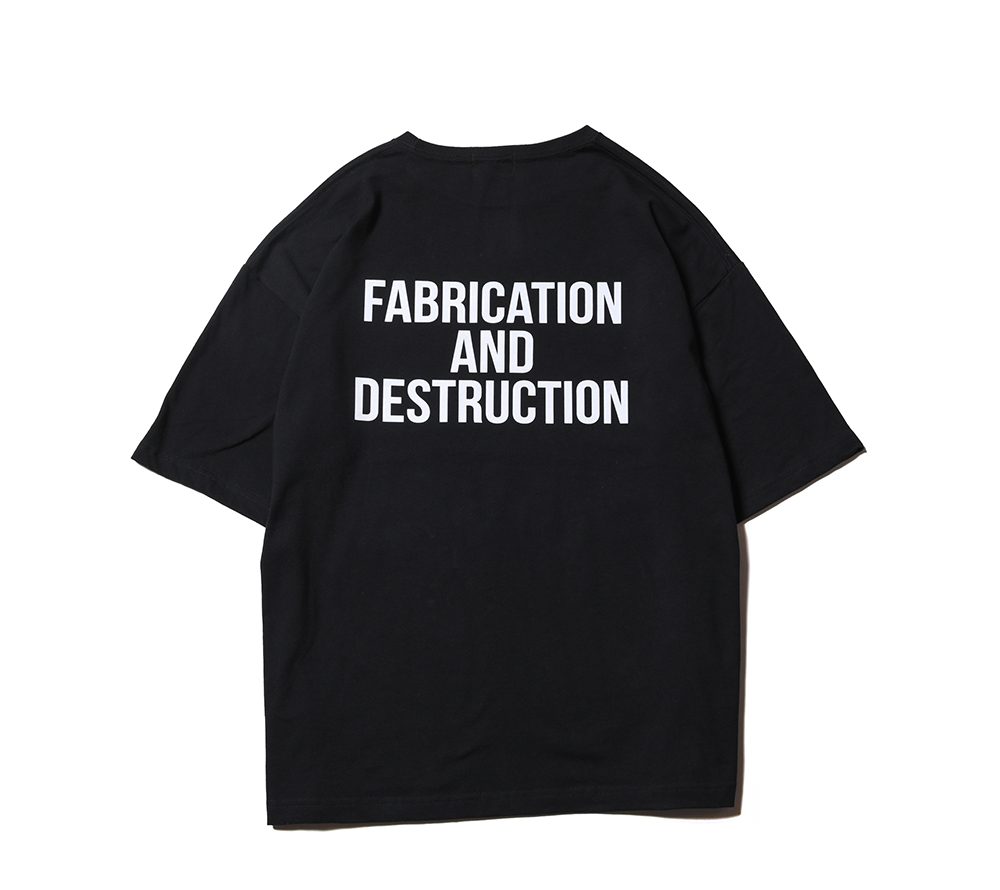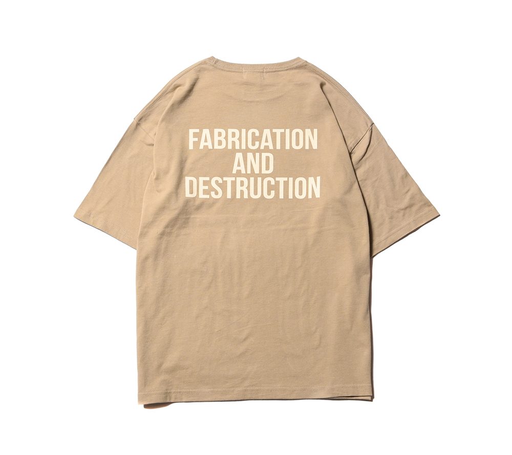 CUTRATEのメインロゴのサークルロゴをフロントにプリントで落とし込んだデザイン。バックにも”FABRICATION AND DESTRUCTION”のプリントが入る。シルエットはドロップショルダーで製作。