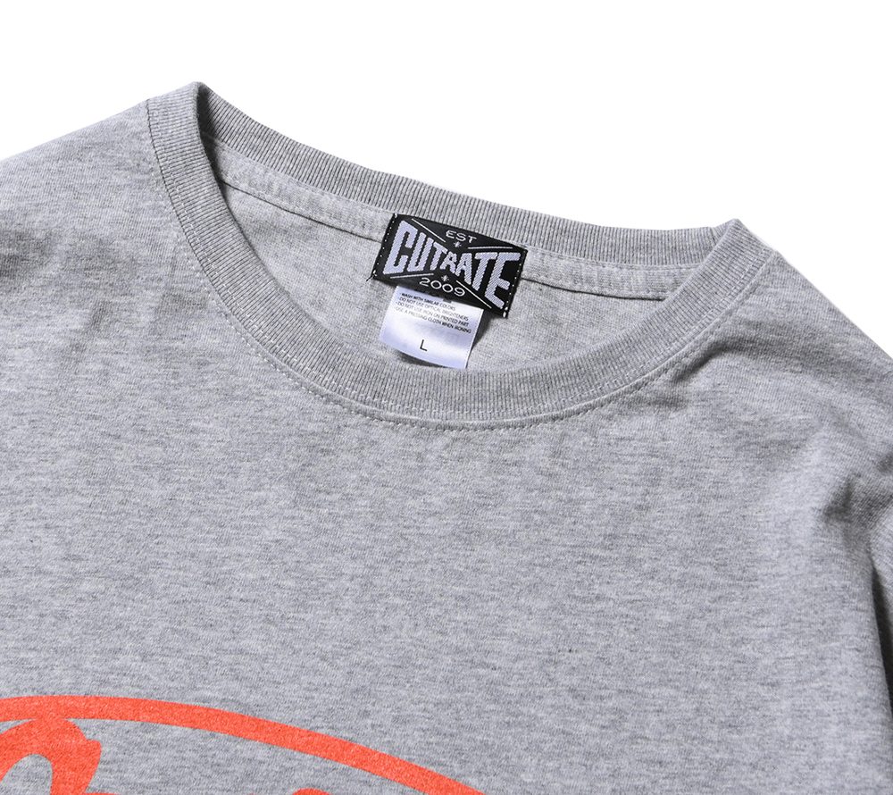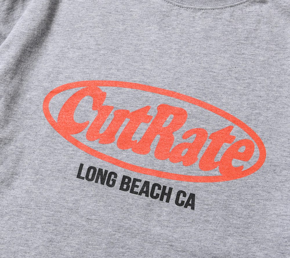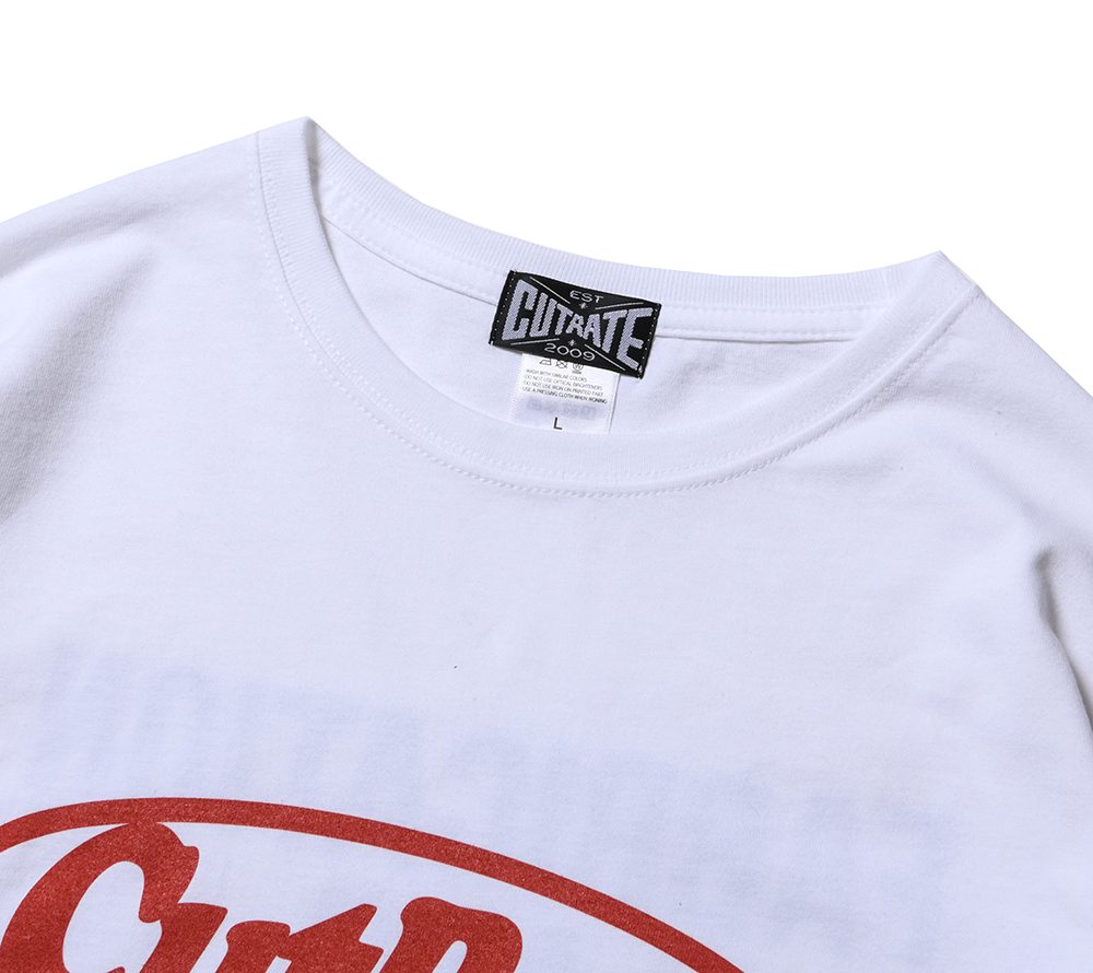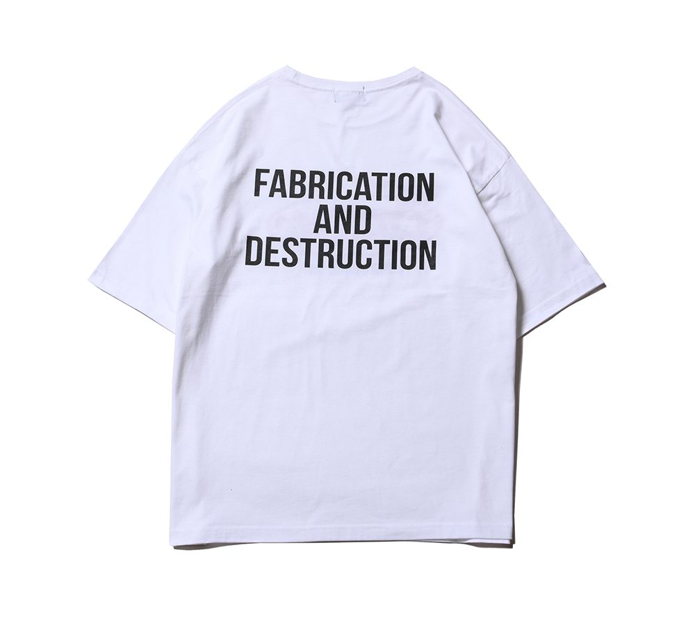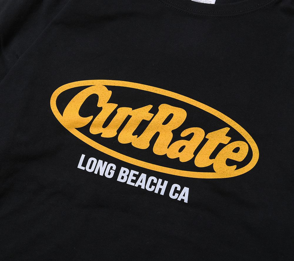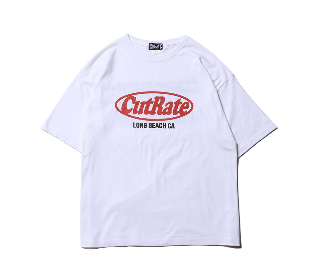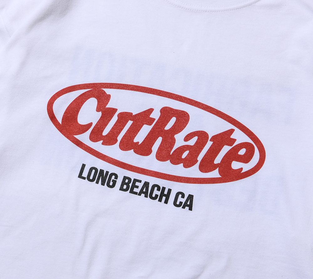 CUTRATEのメインロゴのサークルロゴをフロントにプリントで落とし込んだデザイン。バックにも”FABRICATION AND DESTRUCTION”のプリントが入る。シルエットはドロップショルダーで製作。