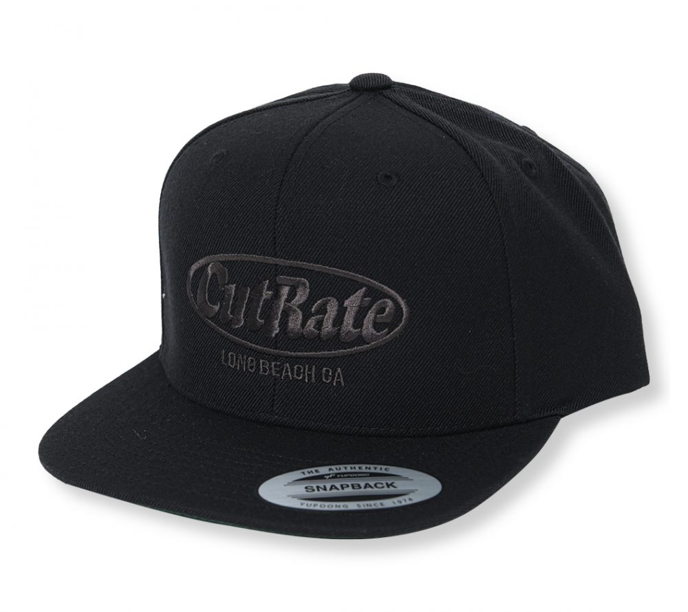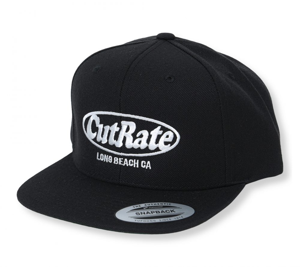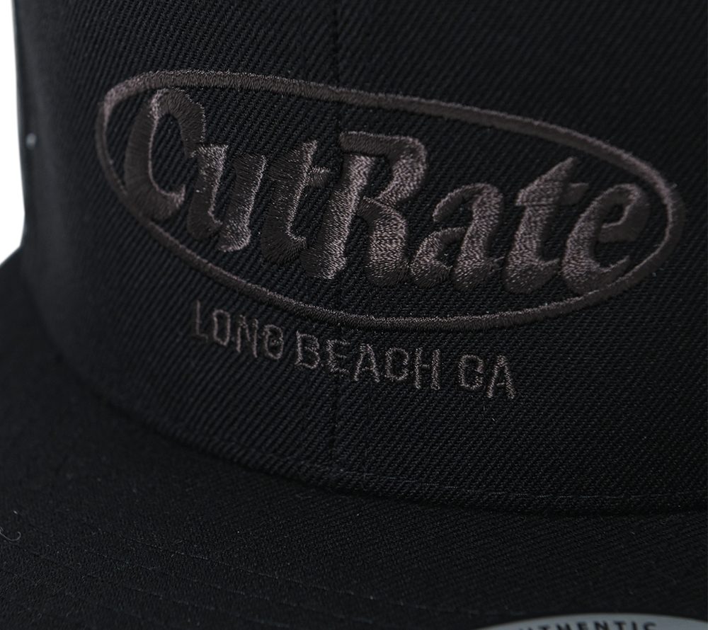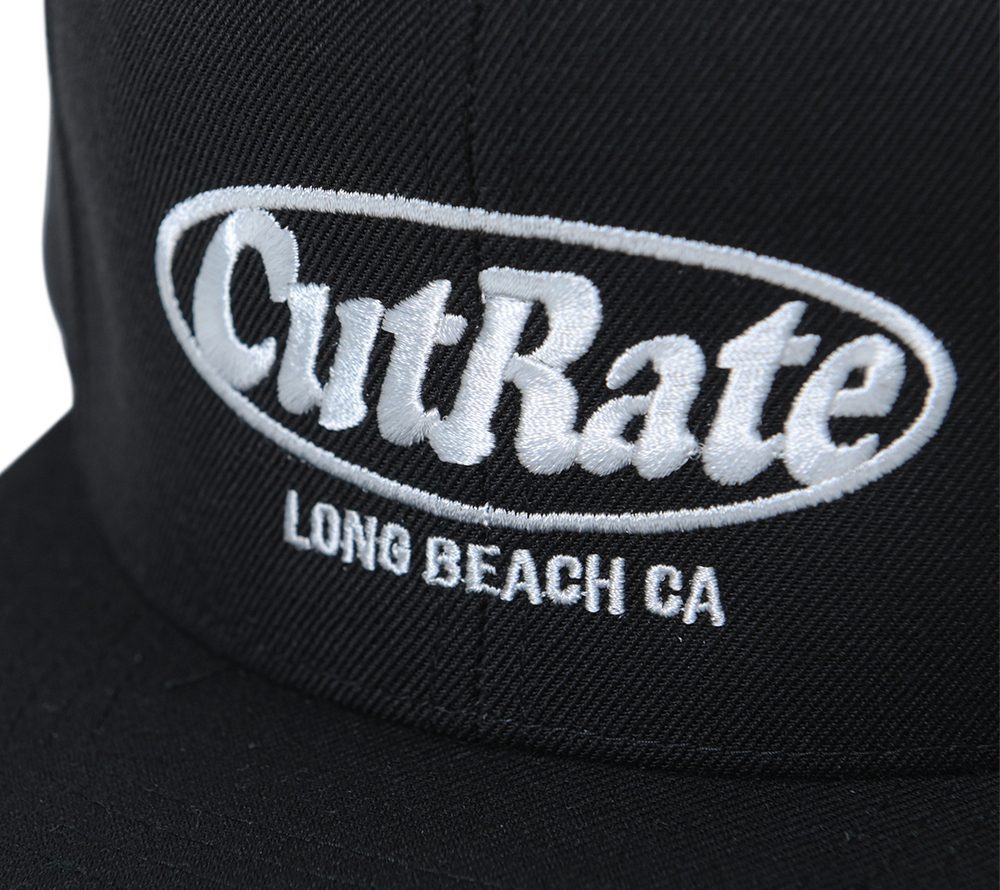 CUTRATEのMAIN LOGOをフロントの刺繍で落とし込んだデザインのスナップバックCAP。ボディーはBLACKのみの展開で刺繍のカラーを変更。ホワイトとチャコールの刺繍が入る。