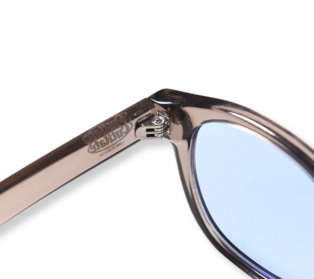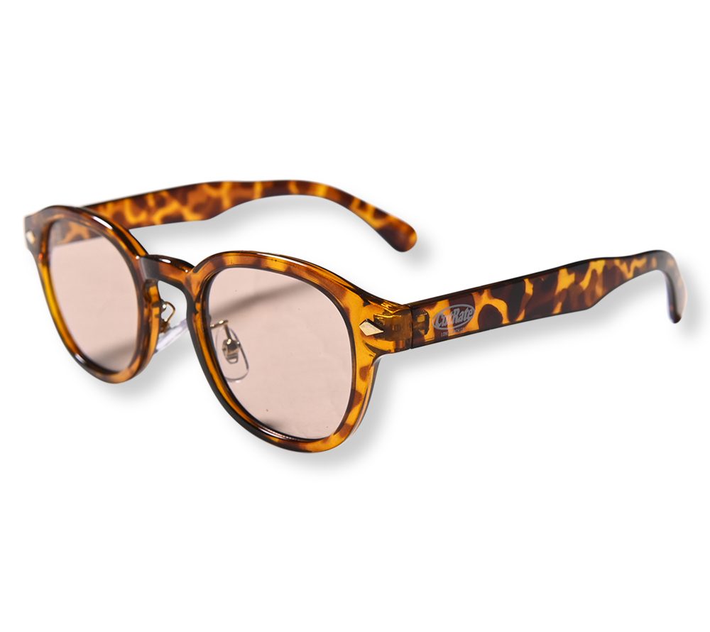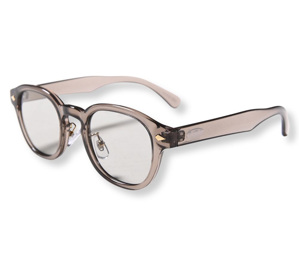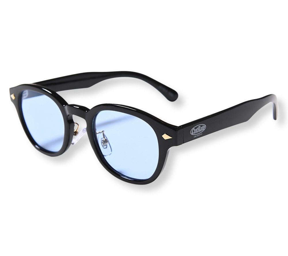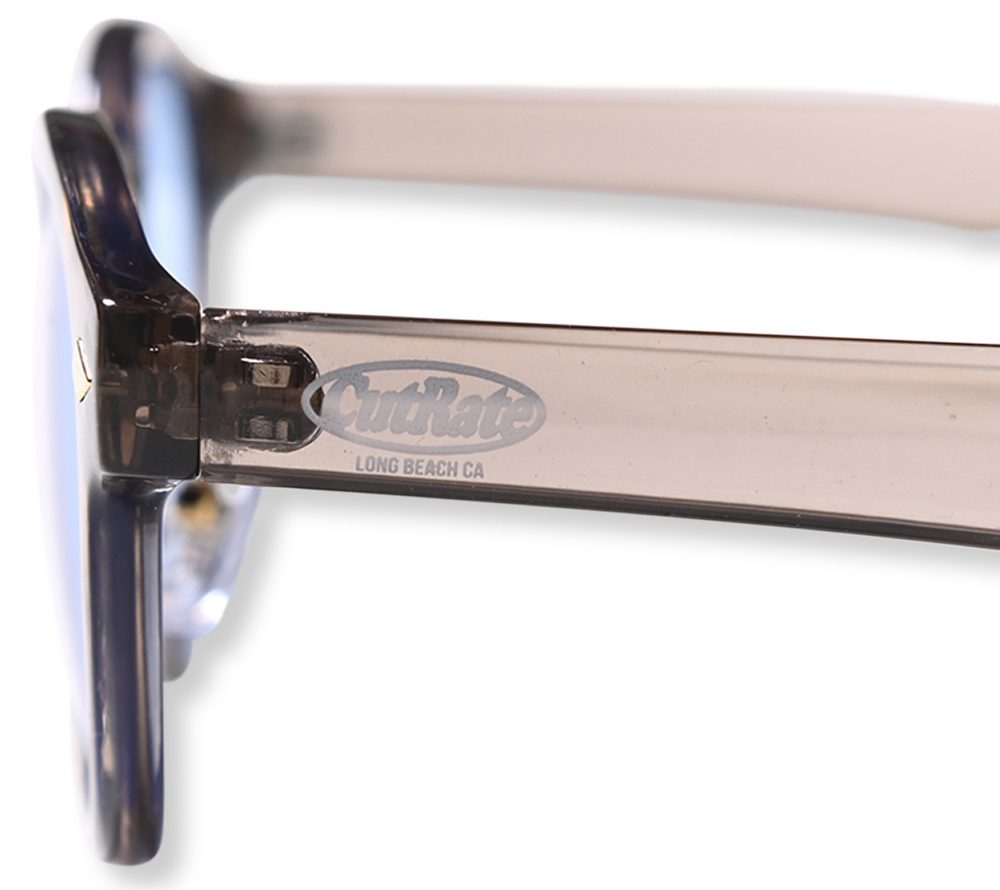 CUTRATE ロゴを左テンプルに落とし込んだグラシーズ。ボストンタイプとウェリントンタイプを掛け合わせたシルエット。ノーズパット付き。グラスケース付属。