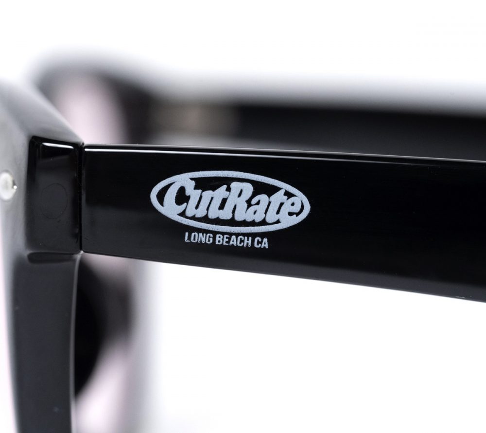 CUTRATE ロゴを左テンプルに落とし込んだグラシーズ。ボストンタイプのシルエット。ノーズパットなし。グラスケース付属。