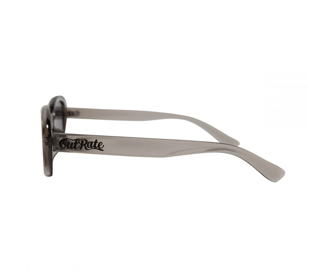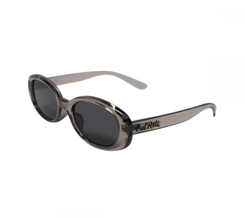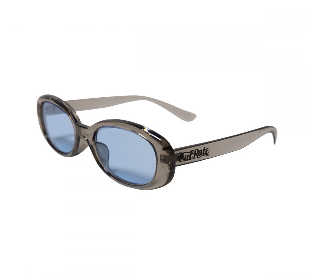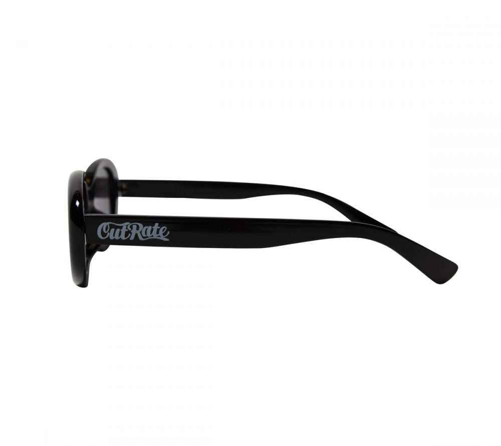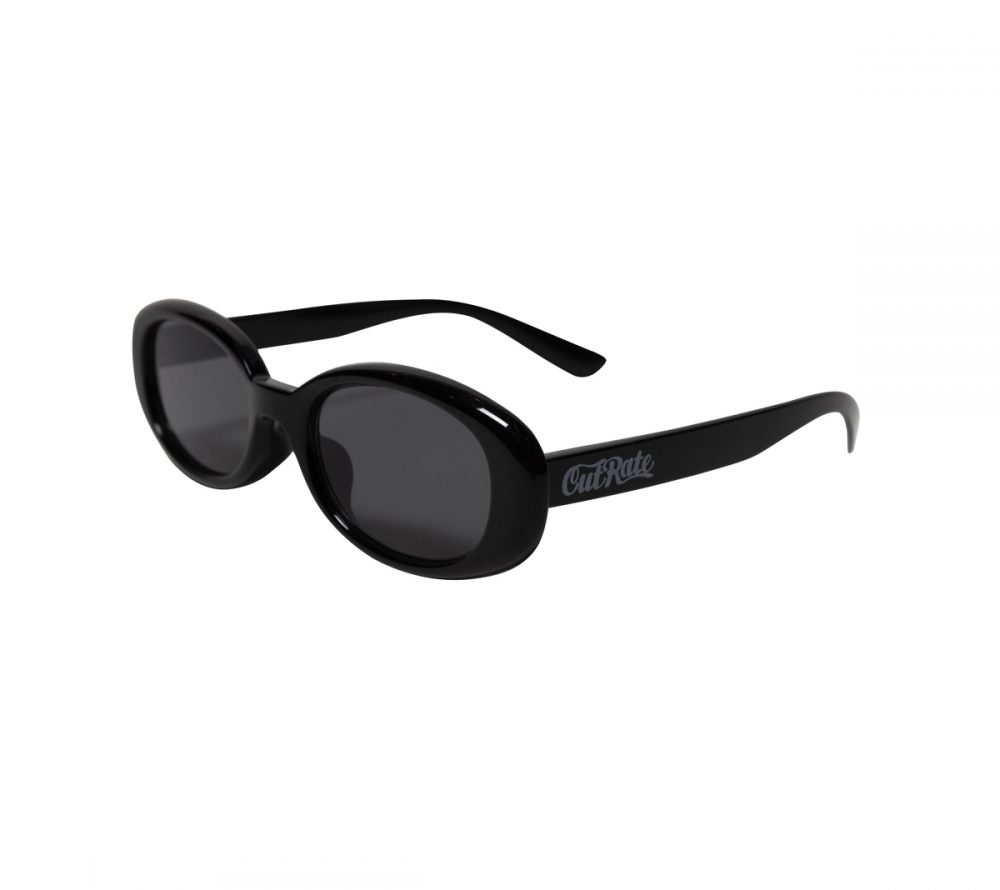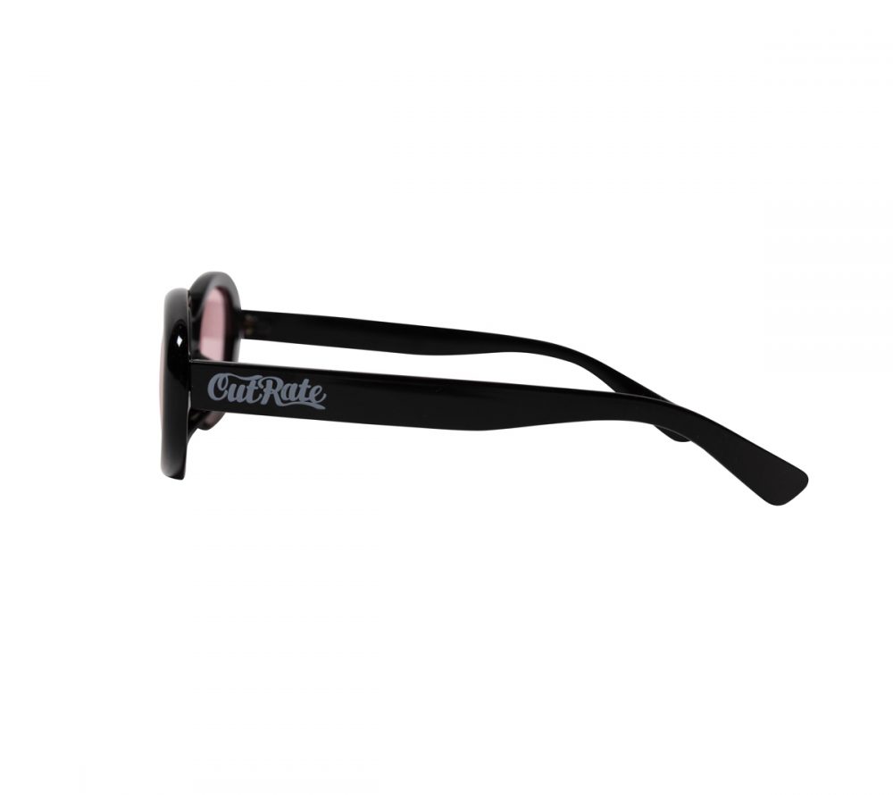 CUTRATE ロゴを左テンプルに落とし込んだグラシーズ。キャットアイタイプのシルエット。レザーグラスケース付属。