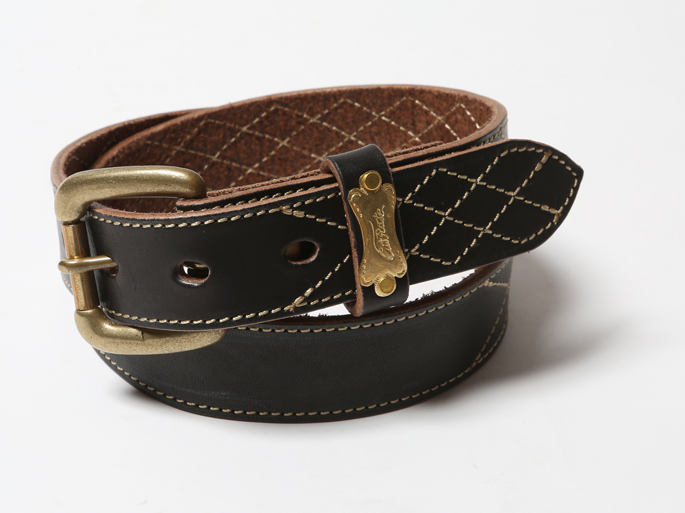 身頃にキルトステッチを施しており、フロントのベルトループには真鍮をを使用したオリジナルのプレートを配しており、良いアクセントになってくれるのではないでしょうか。また、レザーを使用する事で使い込む程に経年変化も見られ、愛着も湧いてくるベルトに仕上がっております。