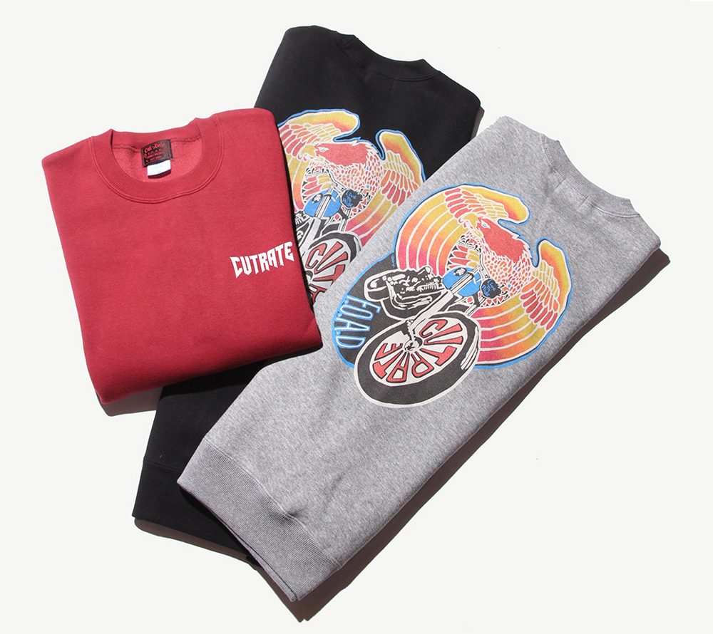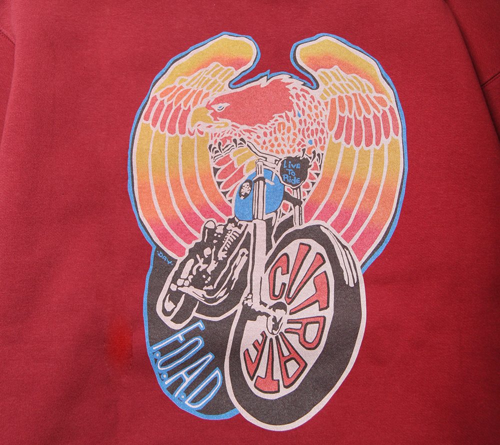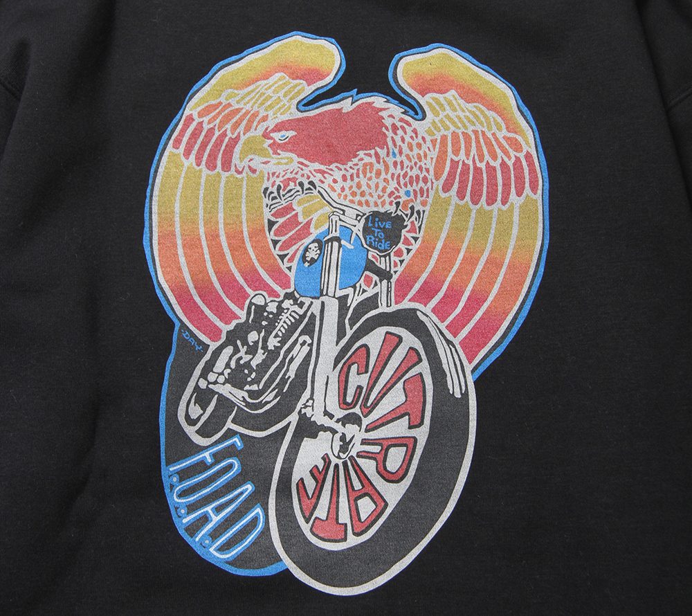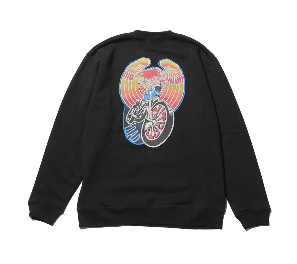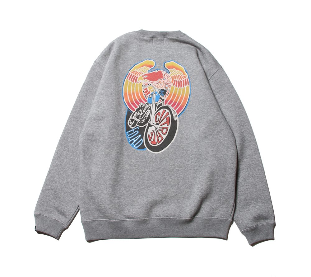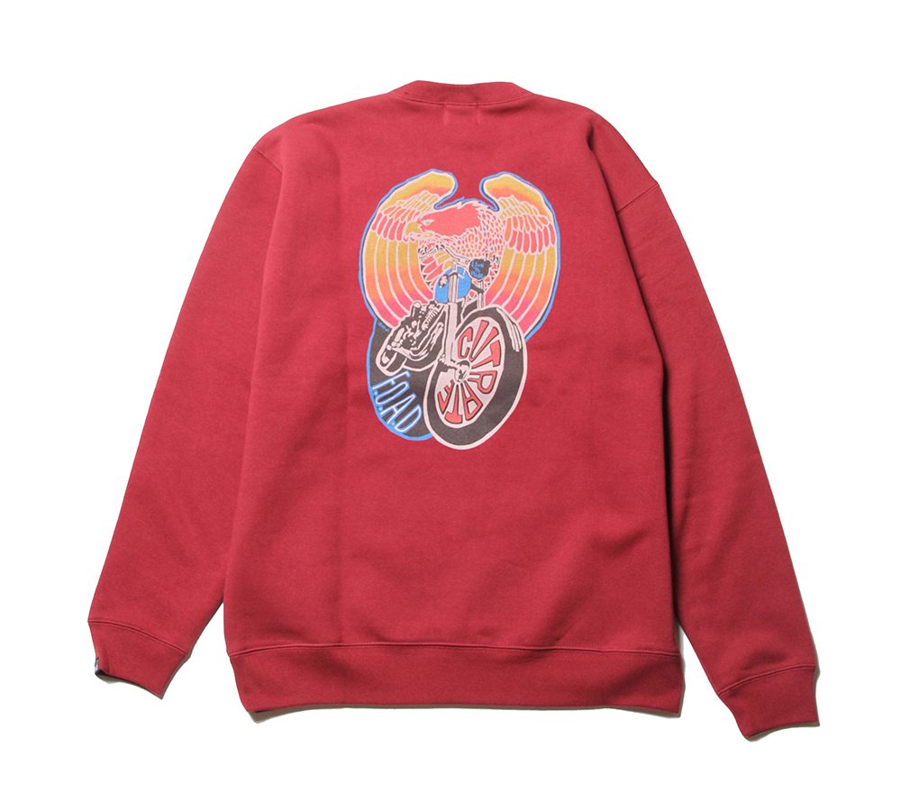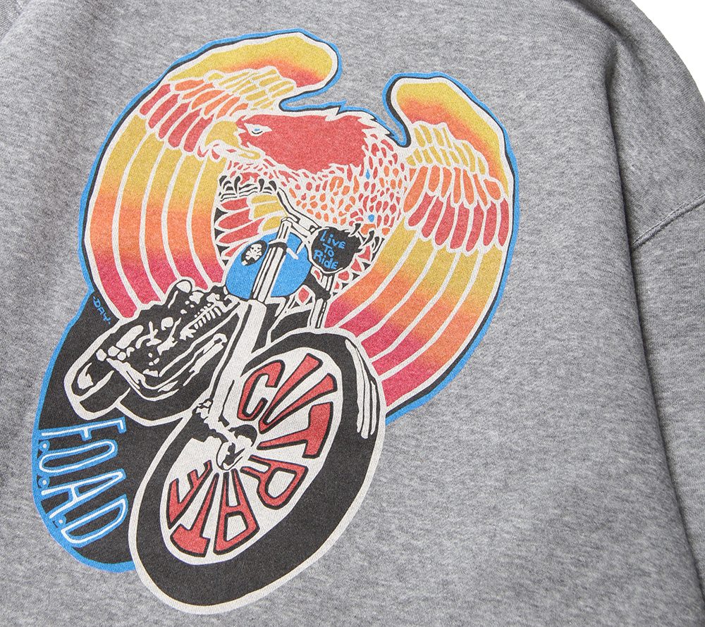 フロント左胸にブランドネームをプリント。バックにはイーグル、バイクのデザインをグラデーションプリントにてオン。これからの時期にはメイントップスとしても活躍するモーターサイクルを感じられる、インパクト大なクルースウェットではないでしょうか。