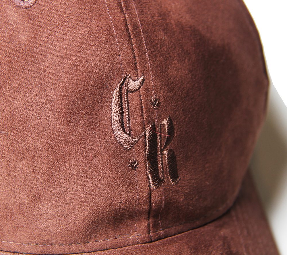 フェイクスエードを使用して製作した浅型のCAPです。フロントにロゴのデザイン刺繍のみのシンプルな作りですが、独特な起毛感が特徴的な仕上がりになっています。