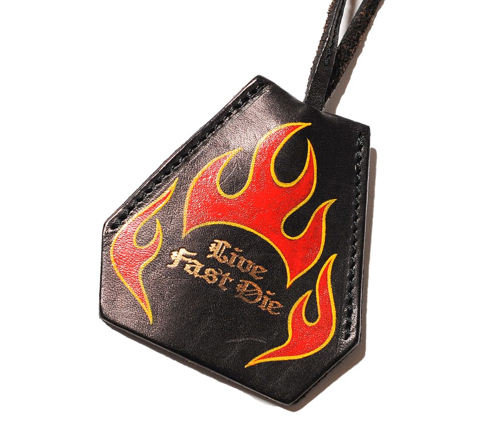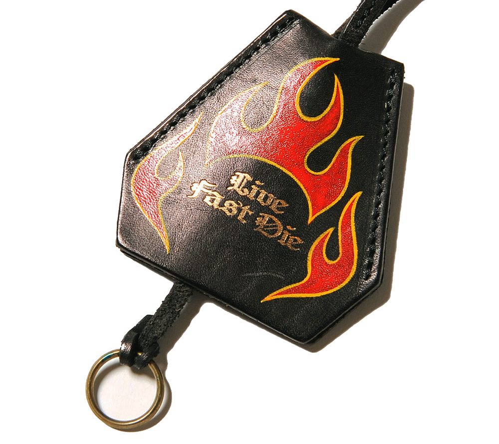レザー部分にフレームペイントを施したキーカバー。ネックレスとして首にかけられる様に、レザーコードを長く設定しています。ネックレスとはまた違ったスタイリングアクセントにどうぞ。