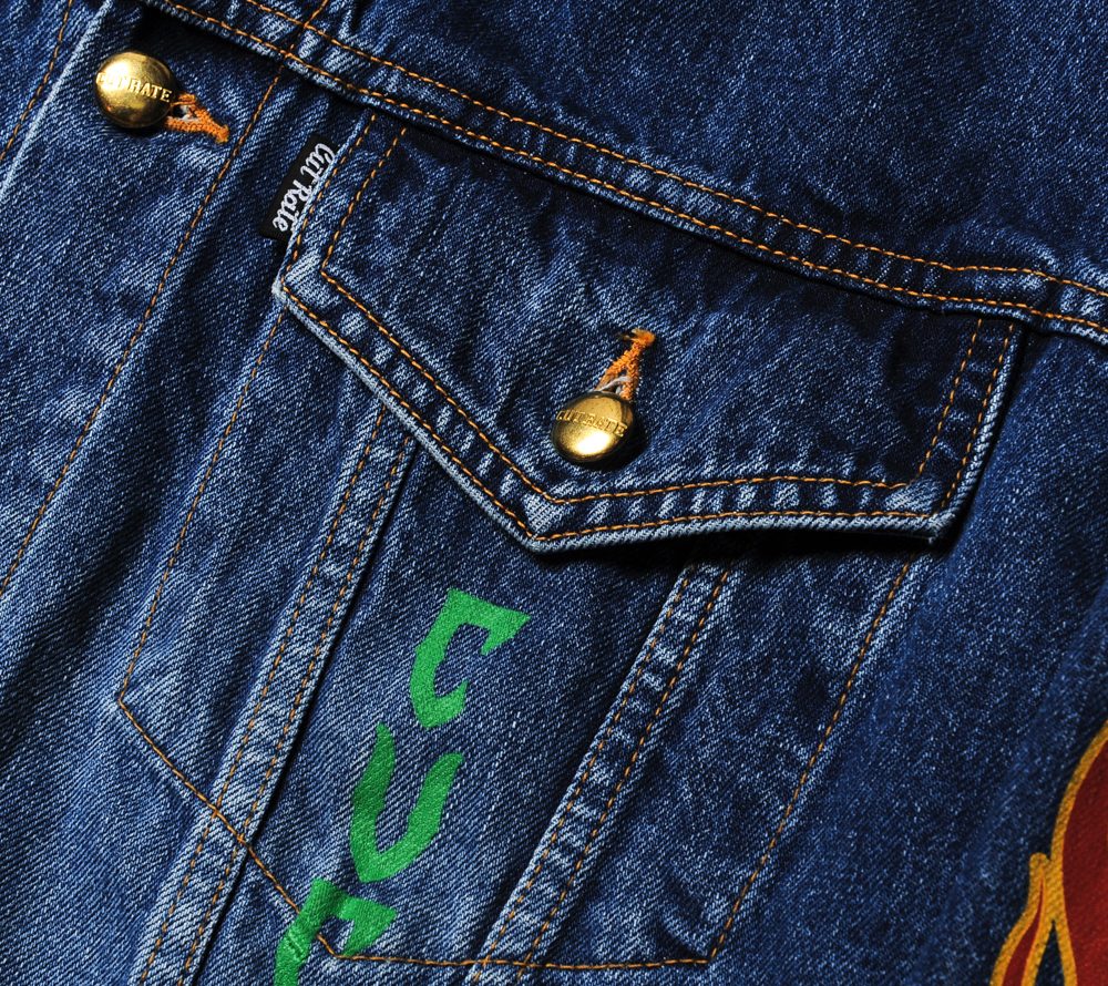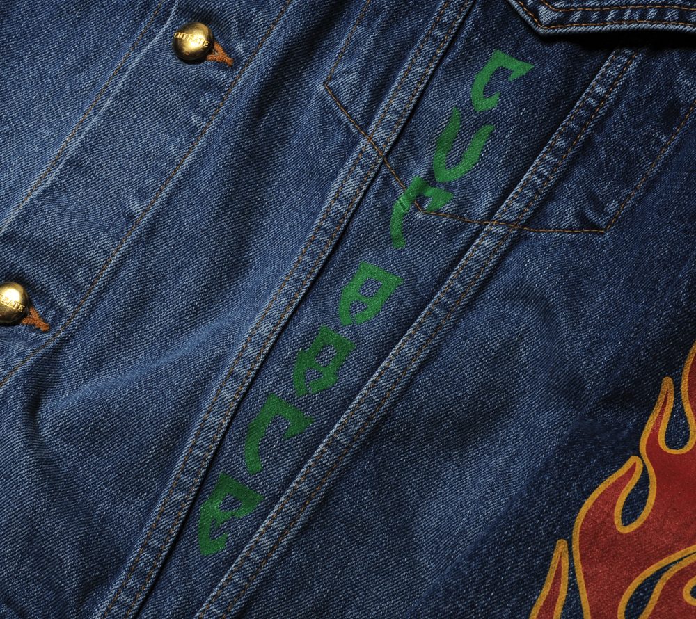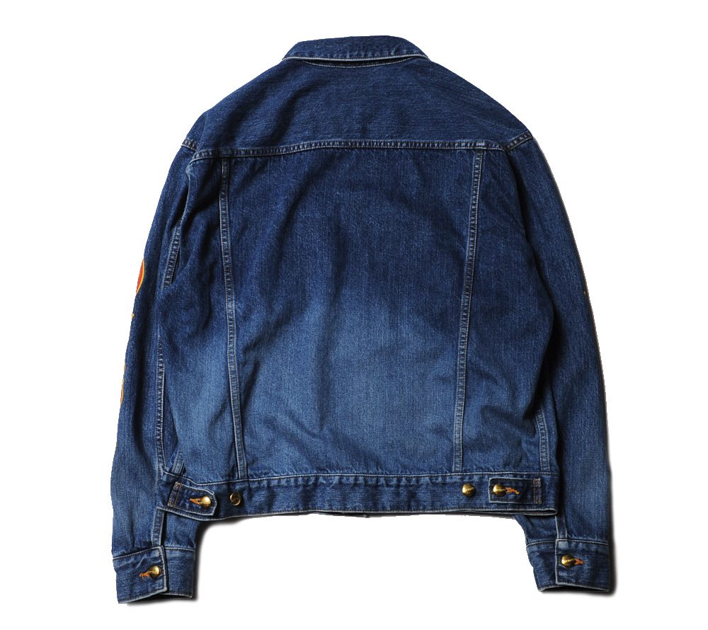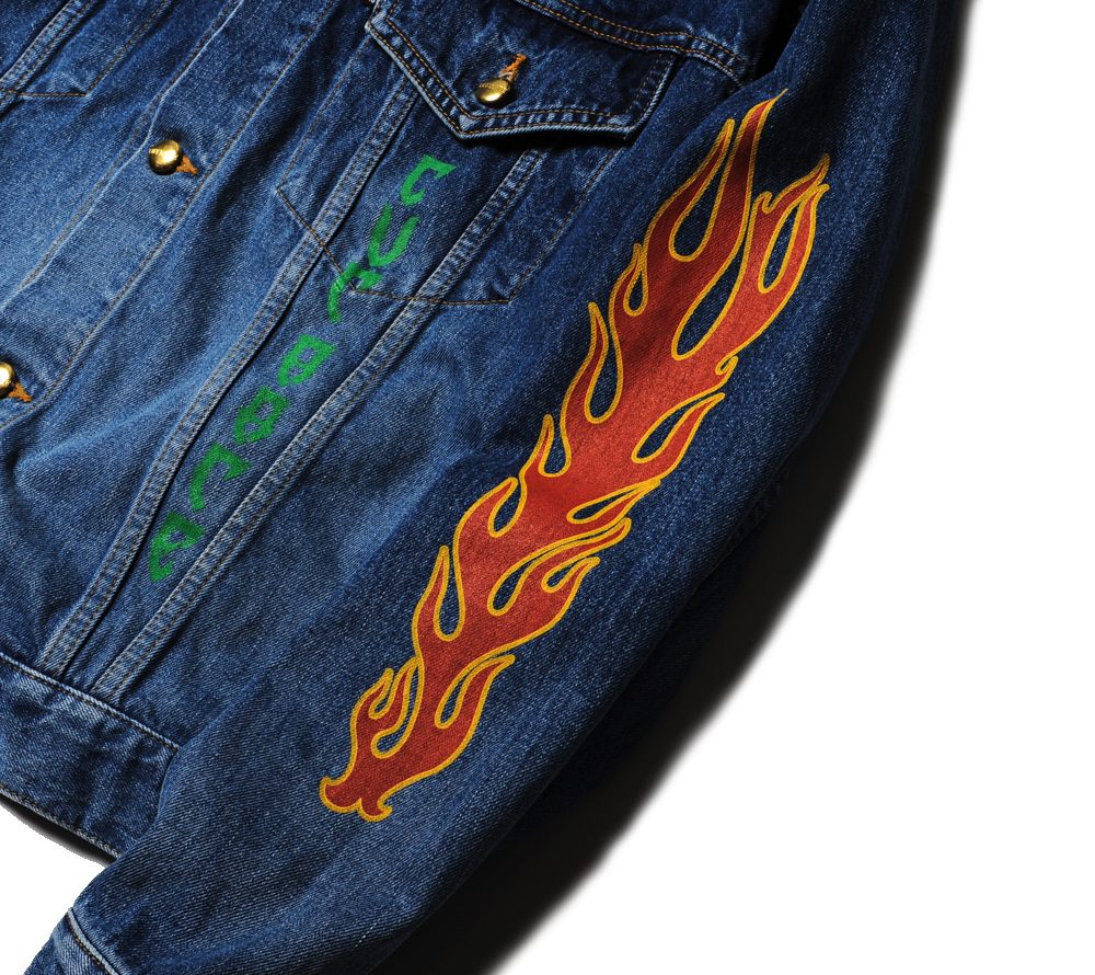 フロントとスリーブにプリントを配した3rdタイプのデニムジャケット。アメリカのスワップミートに行くと、着古したデニムジャケットを自分でペイントしカスタムしたデニムジャケットを着ている人が沢山います。そういったDIY感をハンドペイント風のデザインで表現したジャケットに仕上がっています。