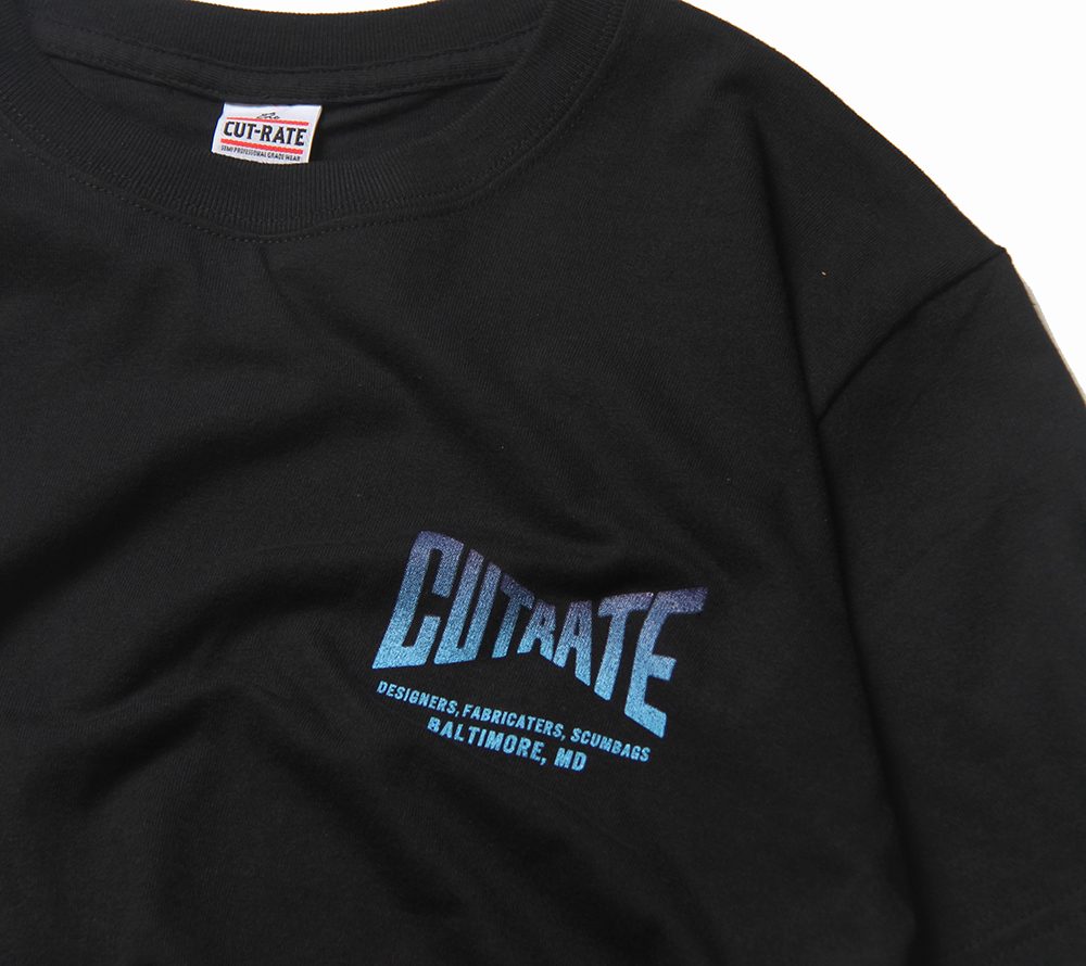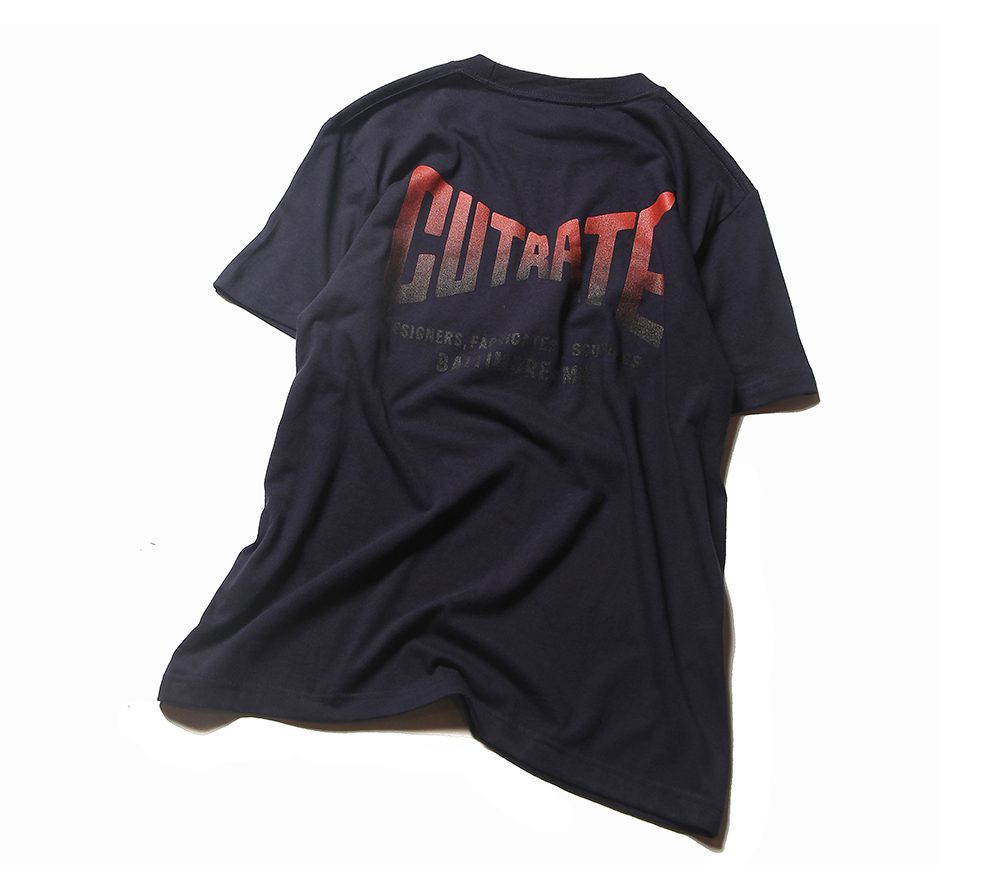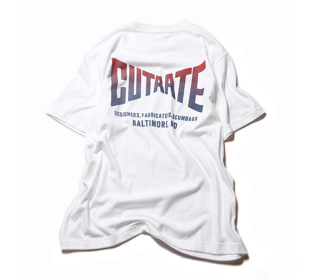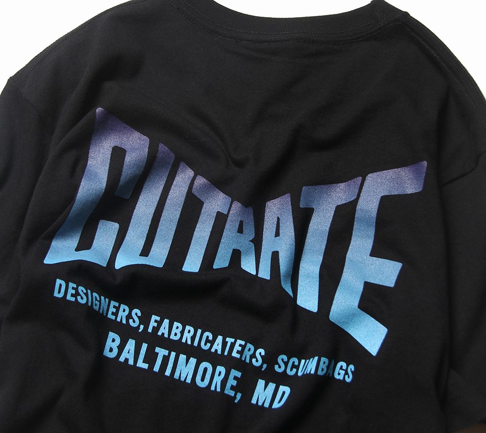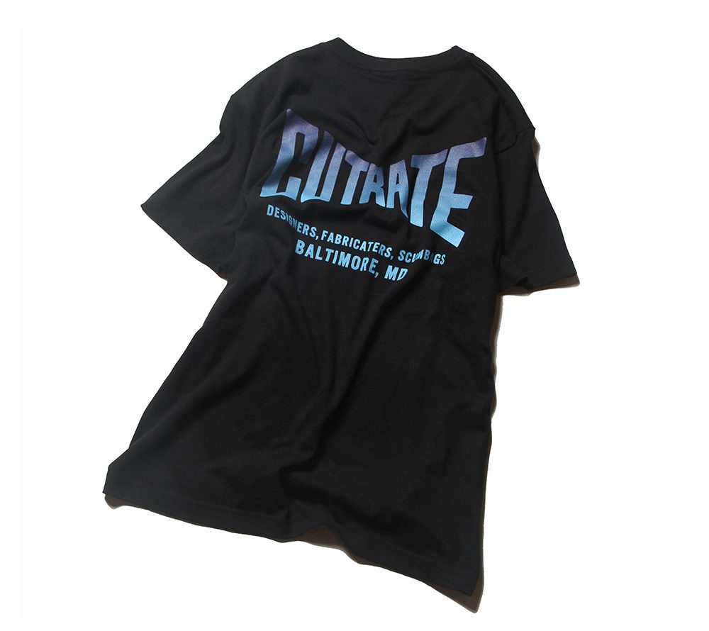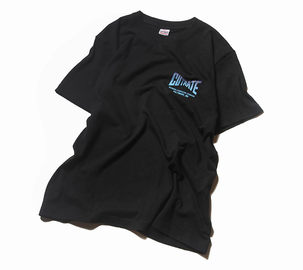 CUTRATE定番ロゴをフロント左胸、バックにプリントしたTシャツ。ブランドの定番ロゴをグラデーションにて表現した一枚。