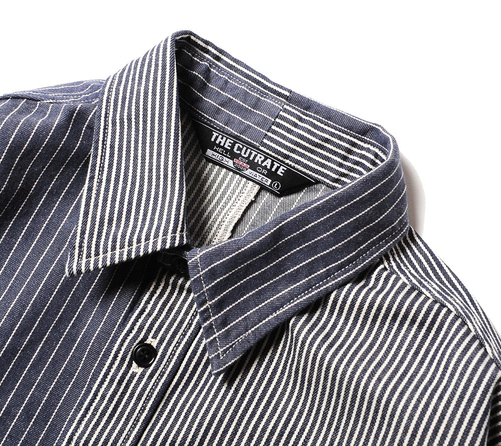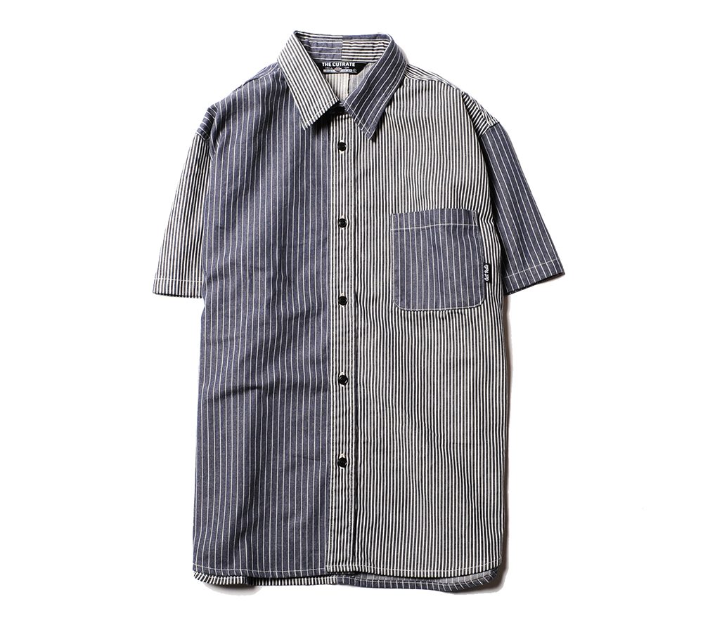 ヒッコリーストライプ地で製作したS/Sシャツ。二種類のヒッコリーストライプ地を使い、身頃や襟、袖、ポケットなどを切り替えたデザインになっています。ワークシャツの定番シャツを、CUTRATEらしくアレンジした一枚です。