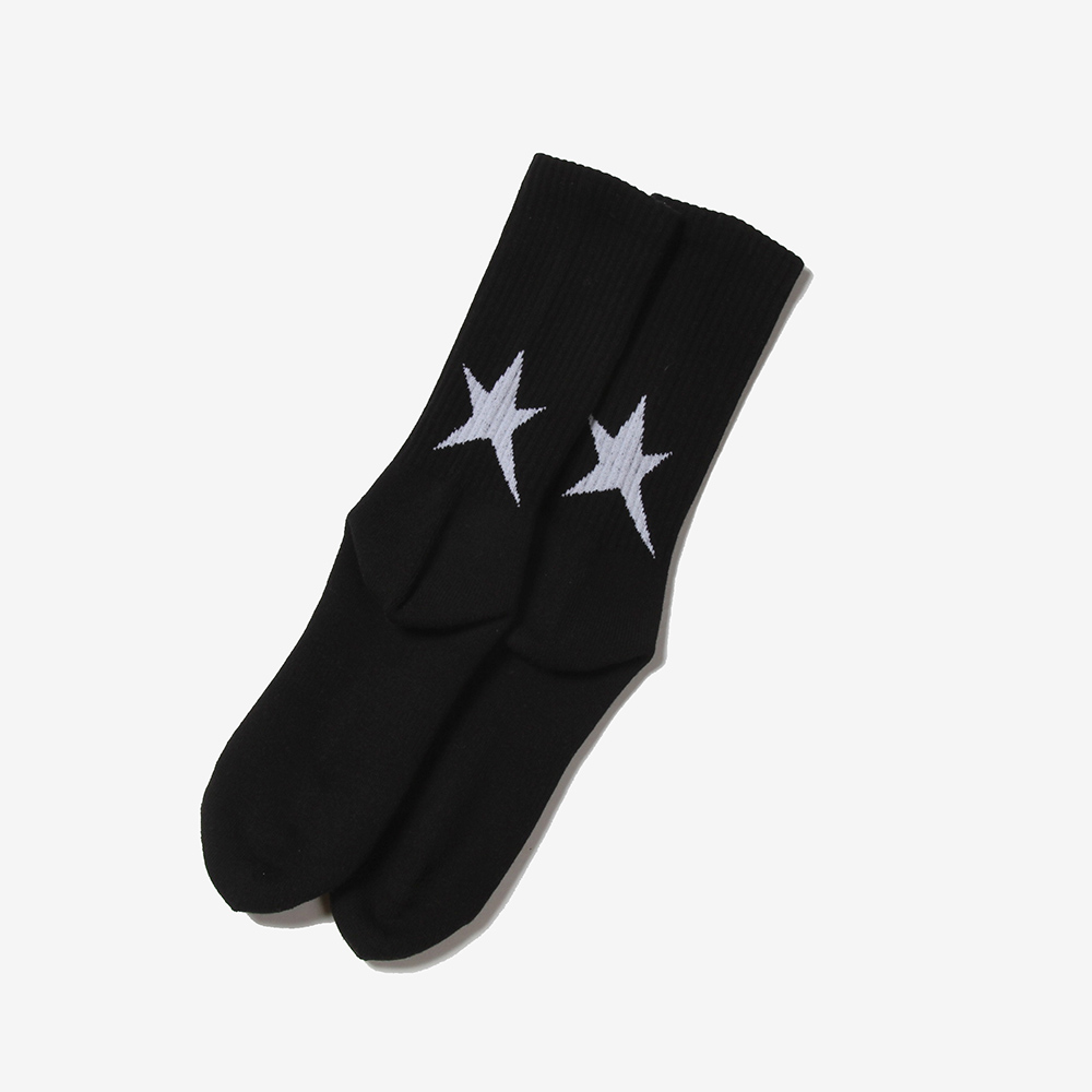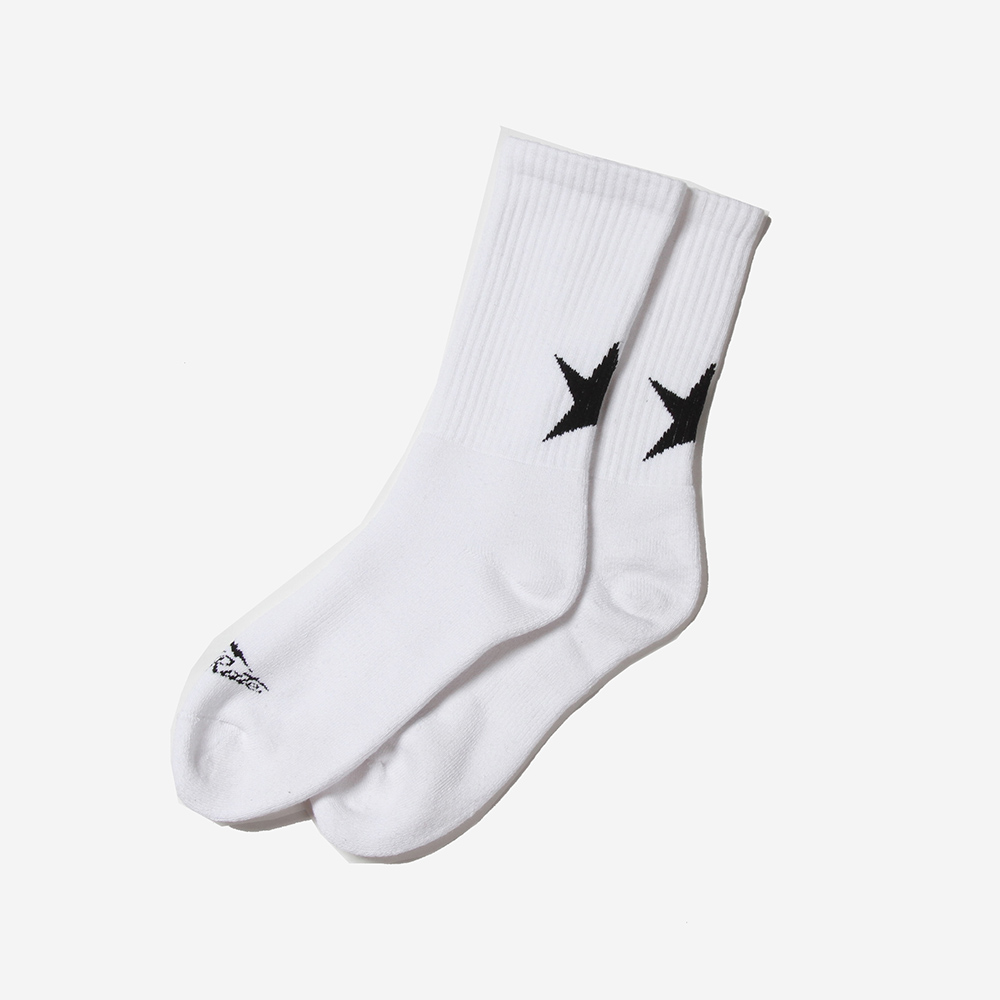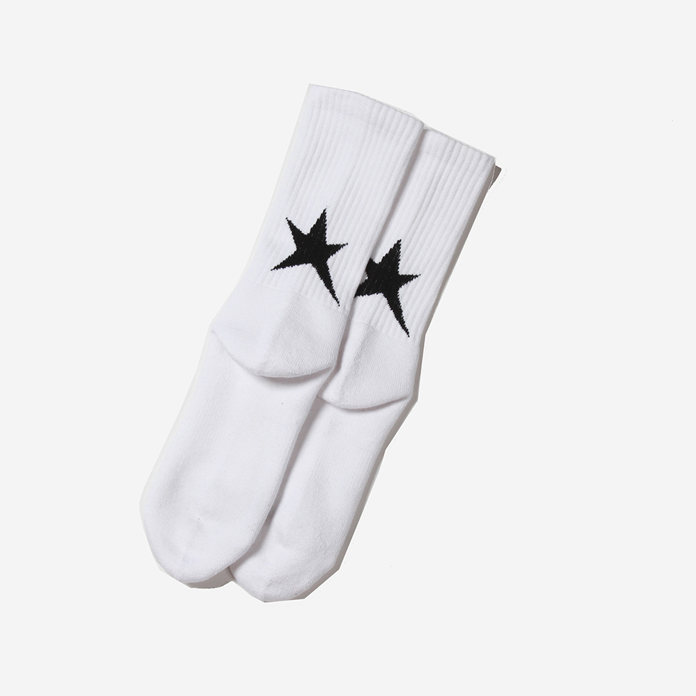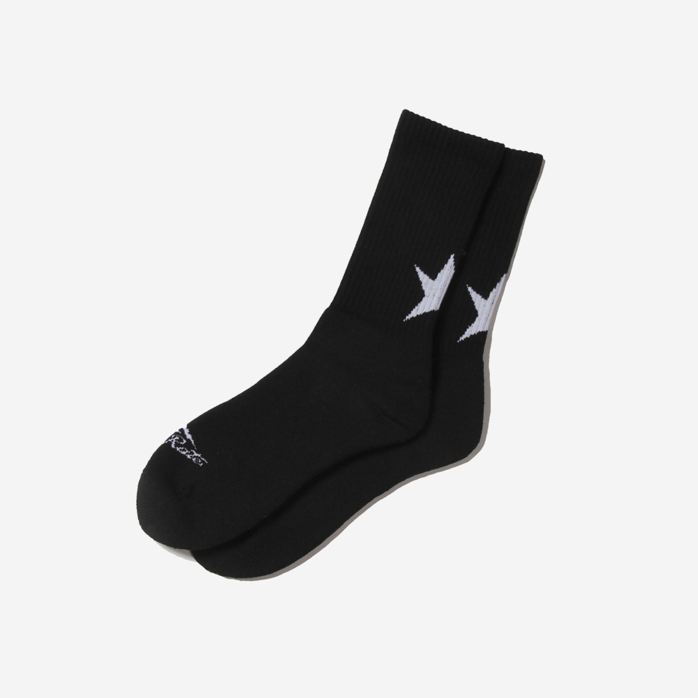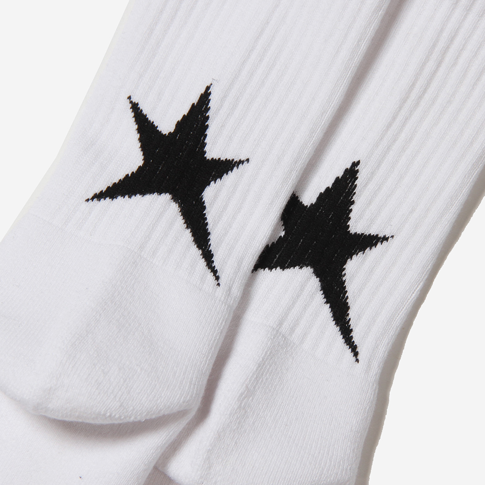 ひねくれた星をイメージし作製したスターを踵上部分にジャガードで施し、足の甲にブランドロゴを。ボディはストレッチ性の高いスチレッチヤーンを使用したラインソックスを作製。夏のショーツスタイルやバイクやBMXなどのライディングの際の裾からのアクセントには良いのでは。