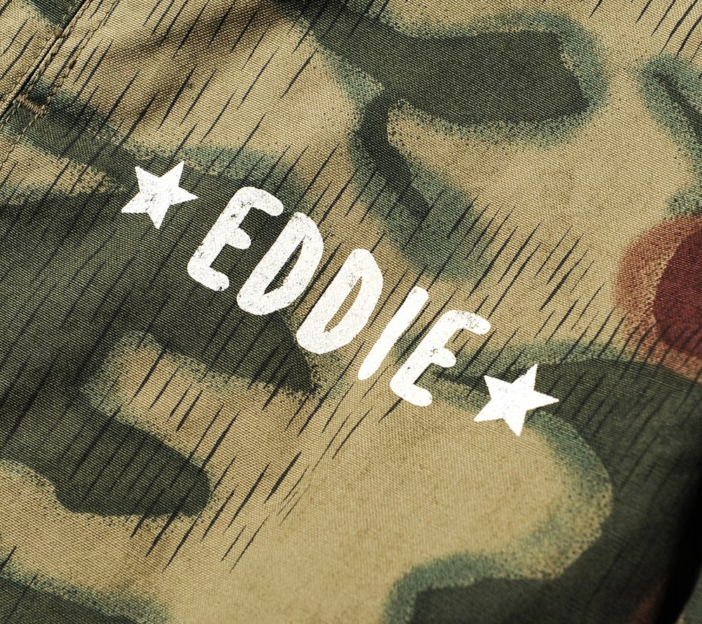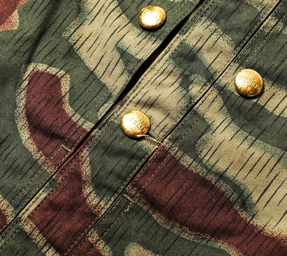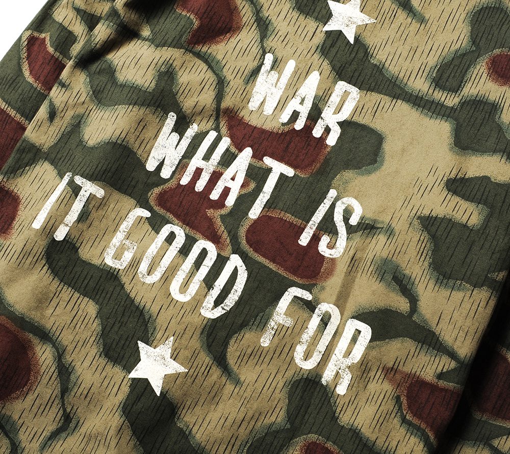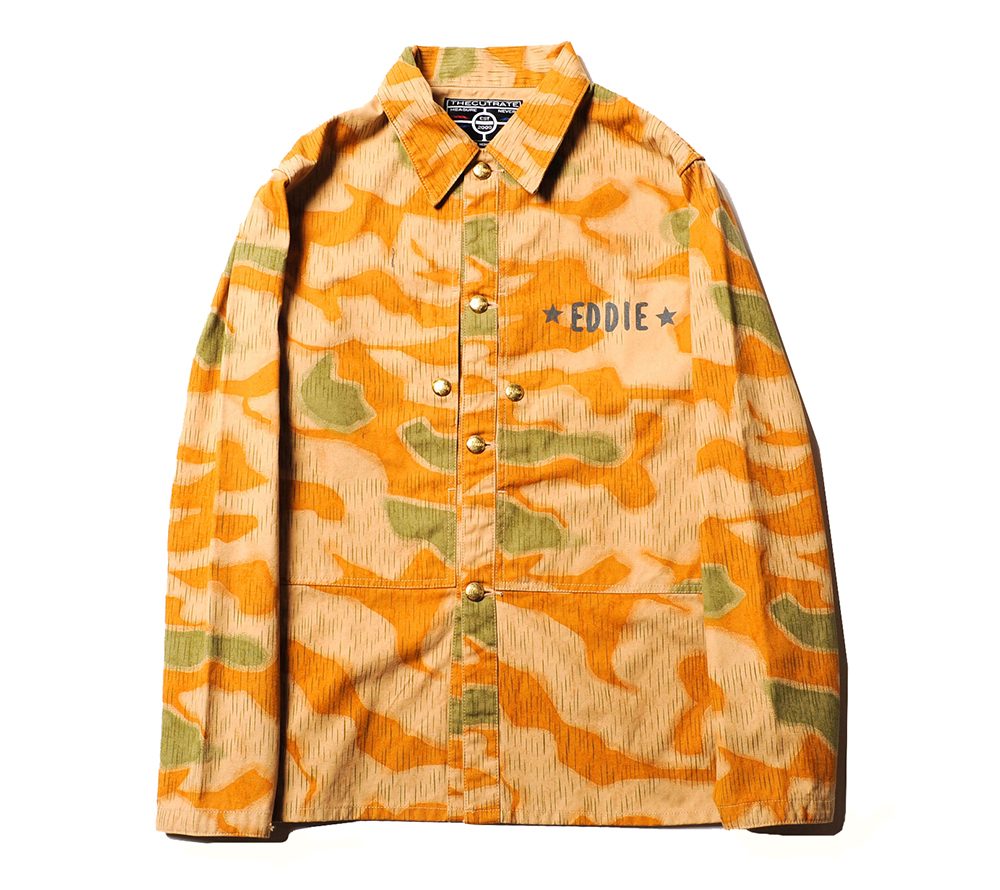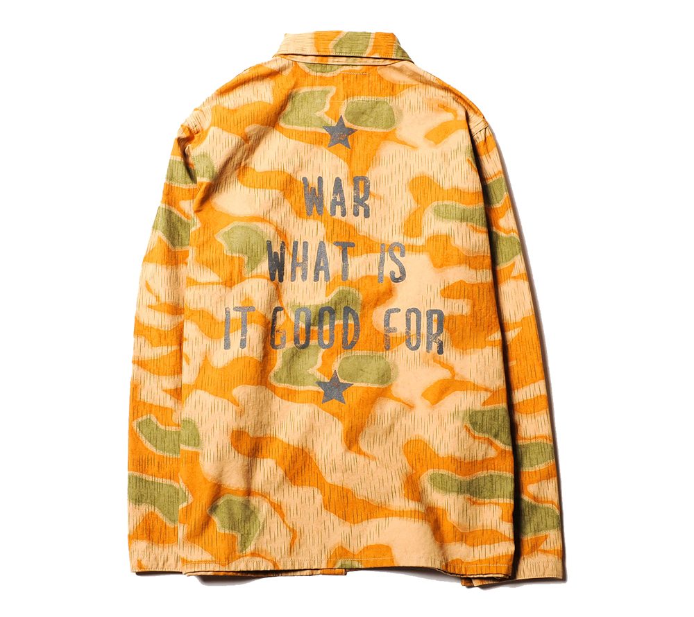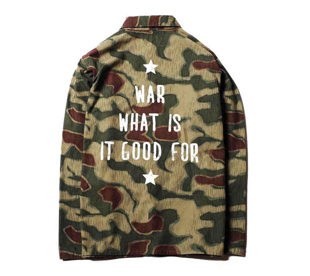 ジャーマンカモを使用したカバーオール。フロント、バックには、デザイナーのバックボーンでもあるミュージックカルチャーから派生したメッセージ要素をプリントしています。オリジナルの真鍮ボタンもアクセントになっています。