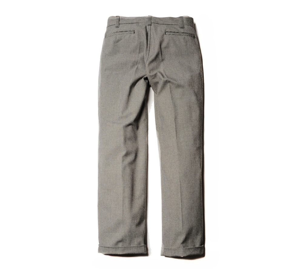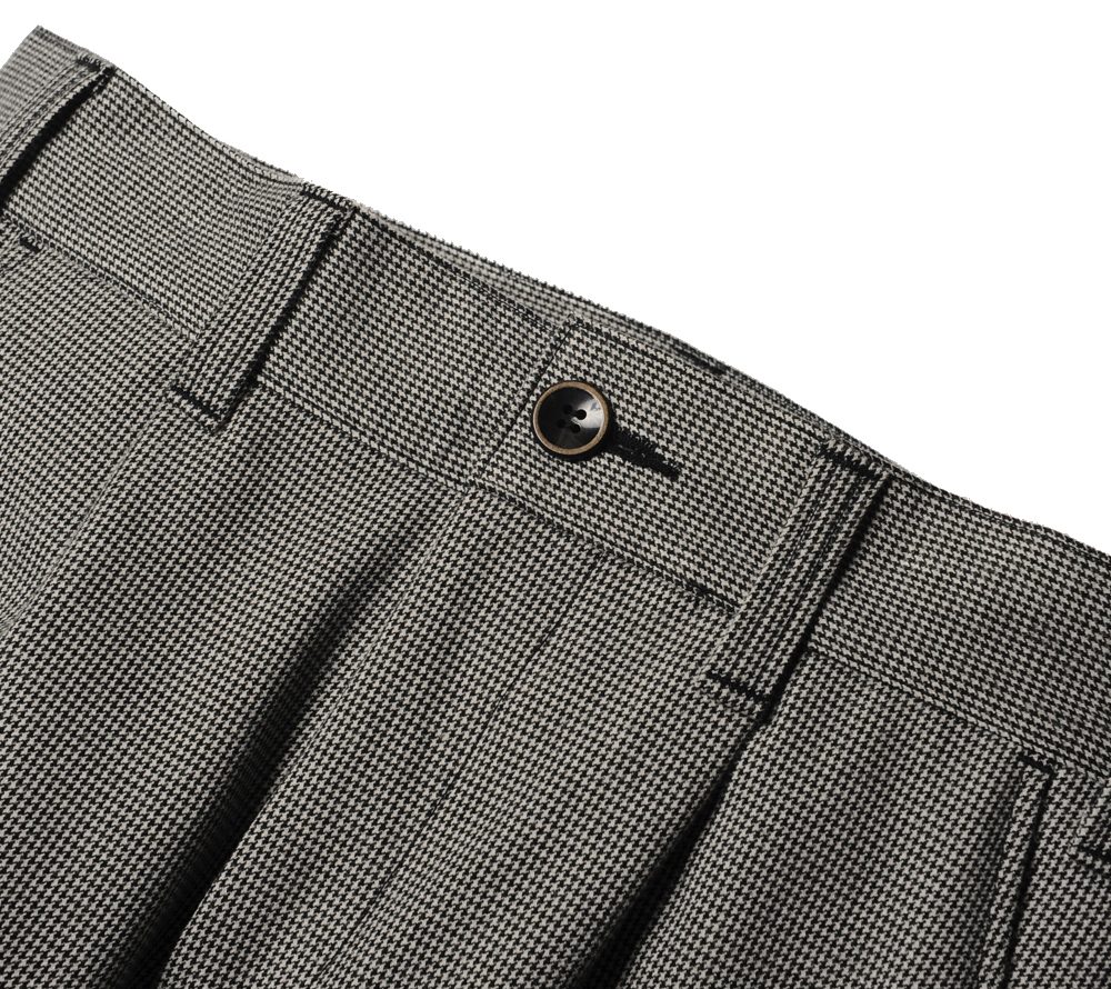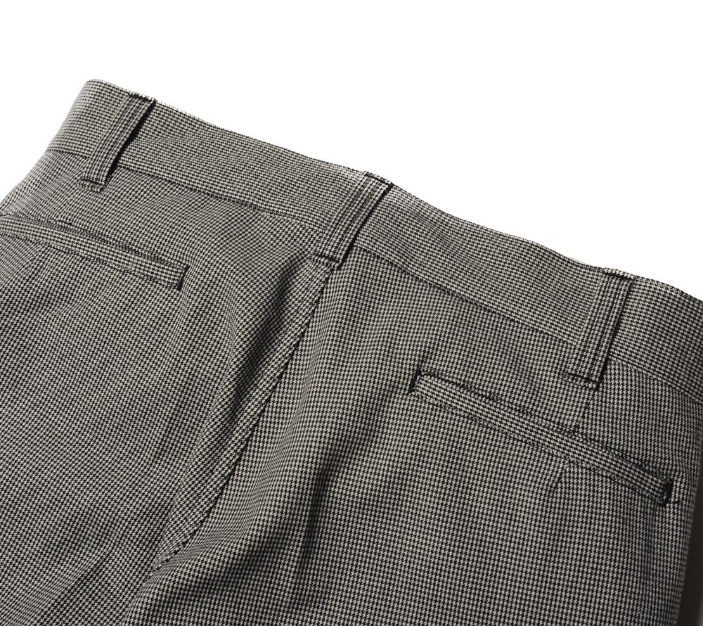 千鳥柄の生地を使用して製作したスラックスパンツ。タイト目なシルエットというよりは、比較的ゆったりとしたシルエットになっていますので、ストリートスタイルに取り入れてもらいたいです。同生地のジャケットもリリースしていますので、カジュアルダウンしたセットアップスタイルもどうぞ。