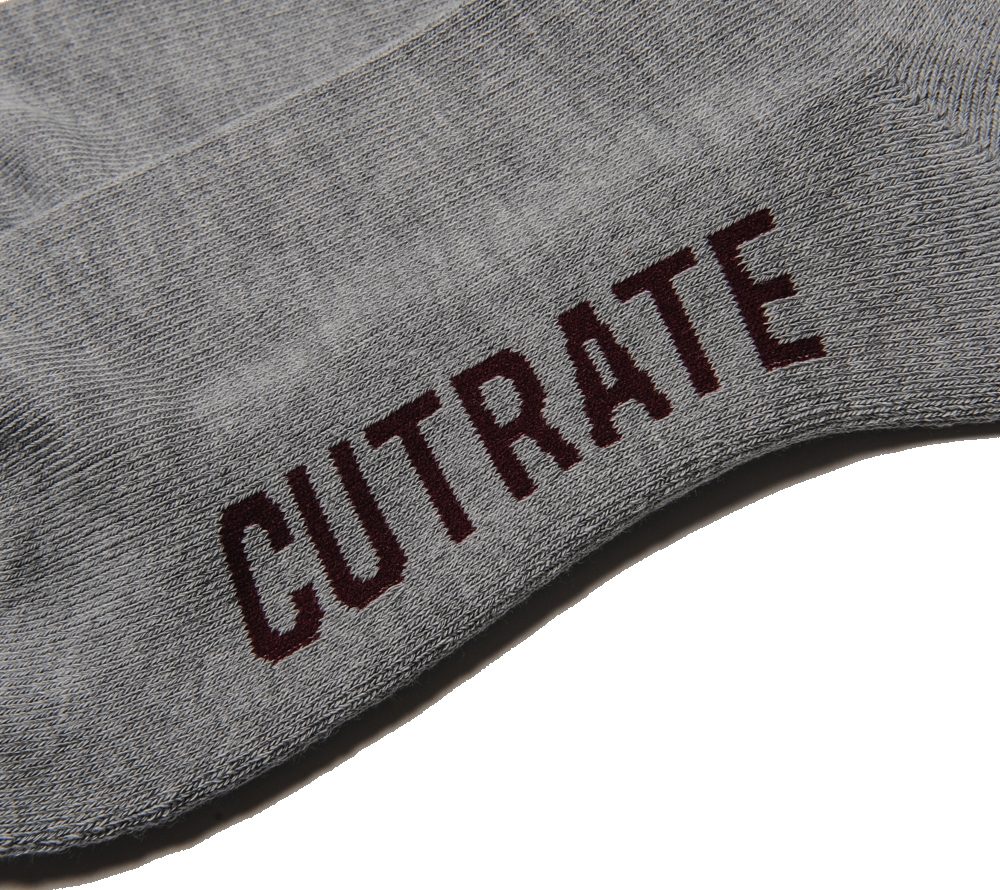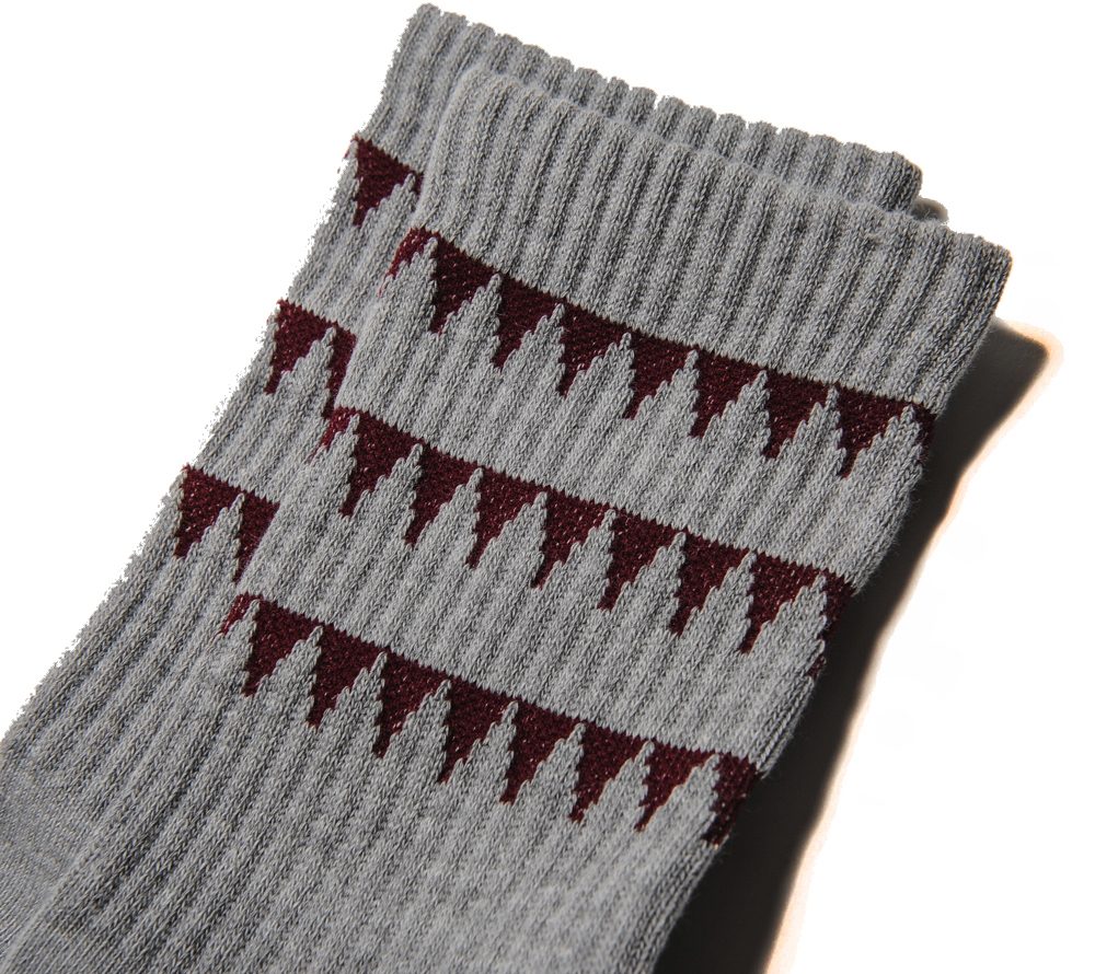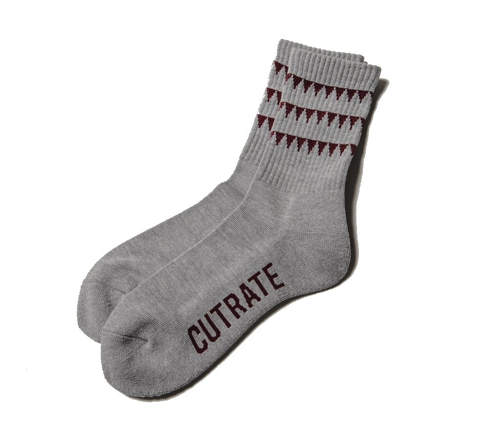 CUTRATEオリジナルのラインソックス。デザイナーOLIVER JONESビルドしたバイクのサイドバッグのカバーのデザインでも使用している、ギザギザのグラフィックをラインソックスのライン部分に落とし込んだ、実にCUTRATEらしいソックスです。