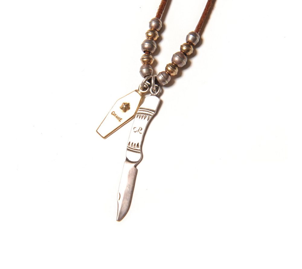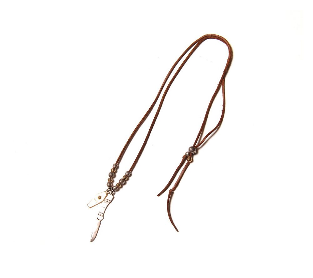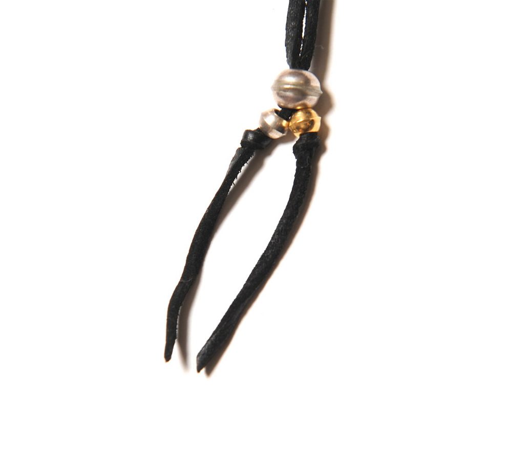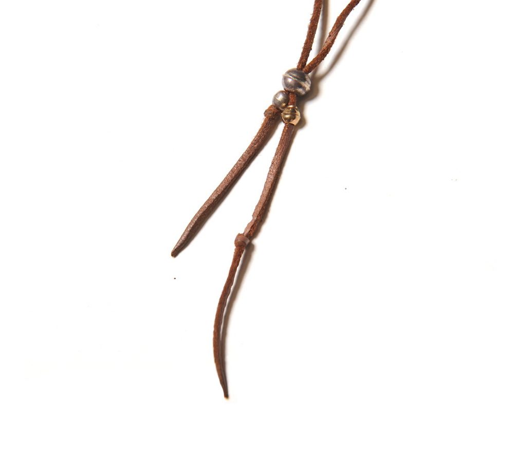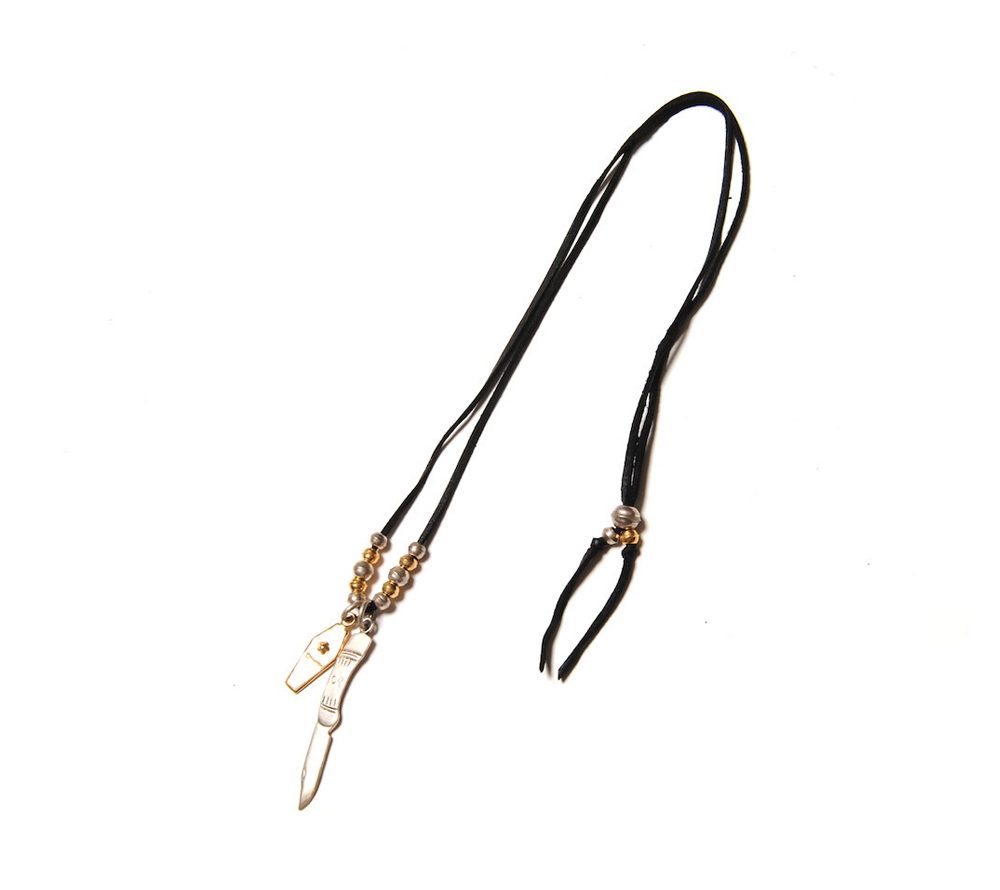 インディアンジュエリーの定番であるフェザートップをナイフに見立てて作製したネックレス。コフィンをゴールドで作製し、シルバーとゴールドのコンビネーションが楽しめます。シルバービーズもシルバーとゴールドを使用する事で、統一感を出しています。また、革紐を使用していて、長さ調整も可能なので様々なトップスに合わせることが出来るのではないでしょうか。