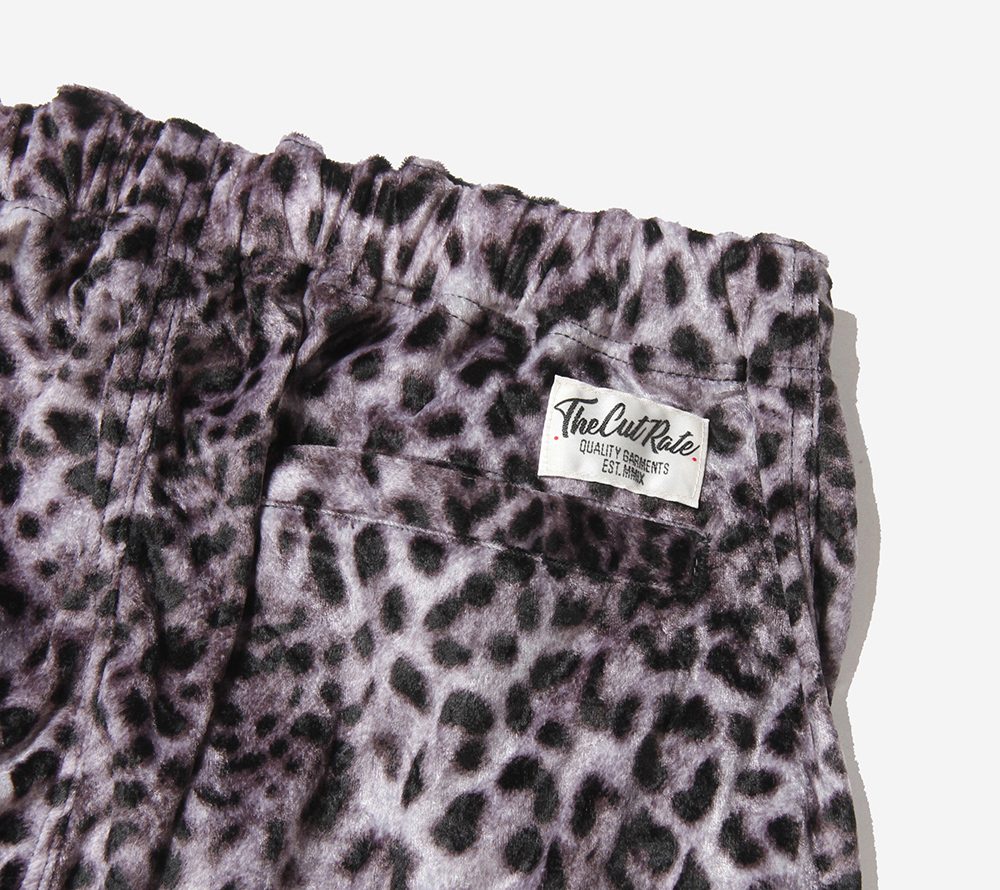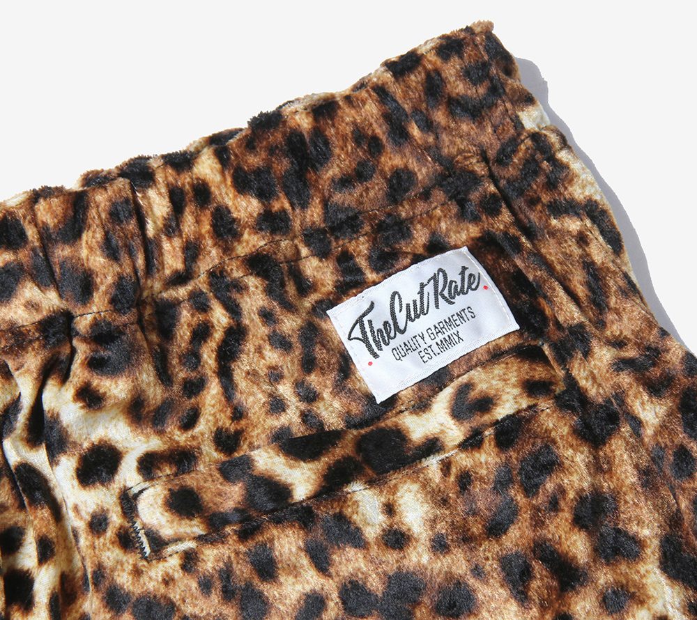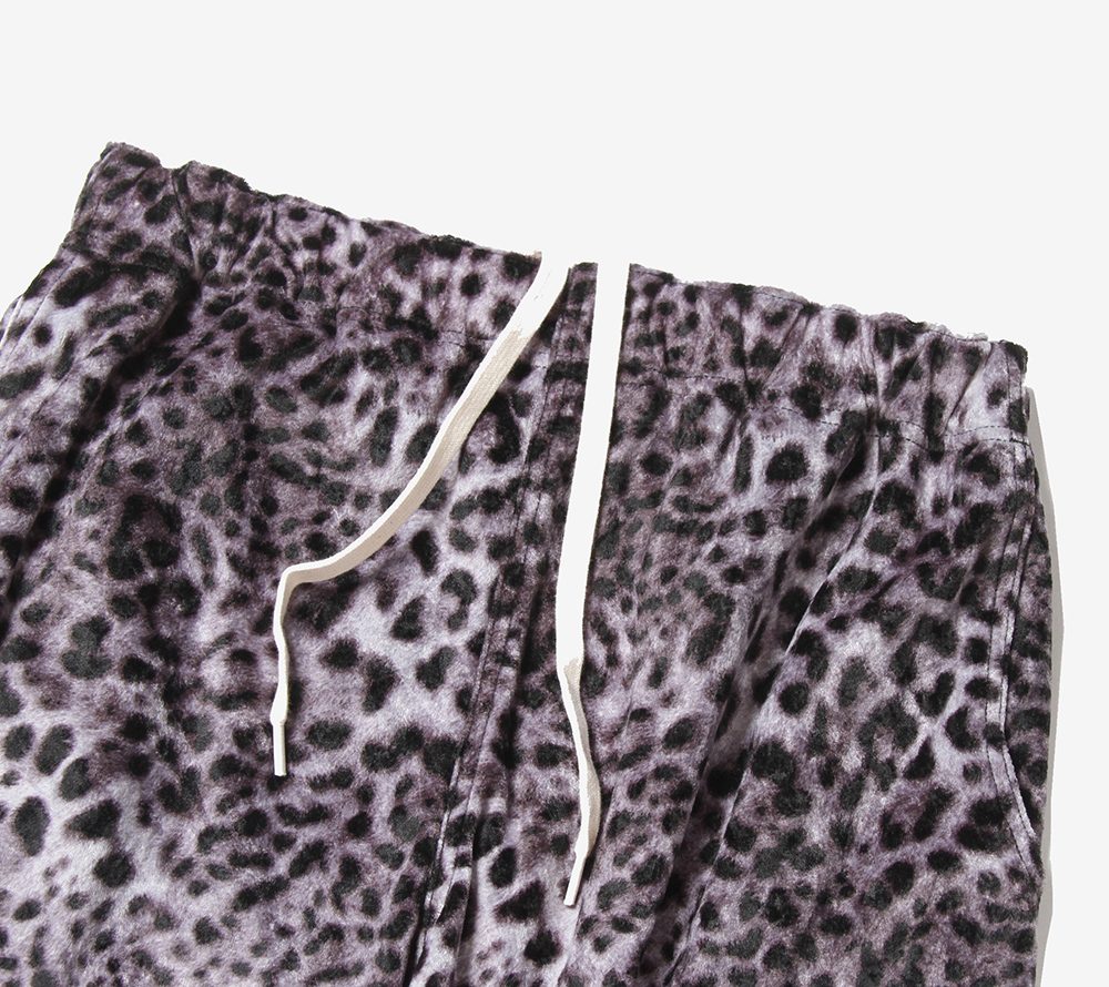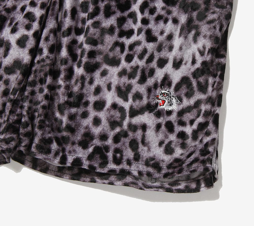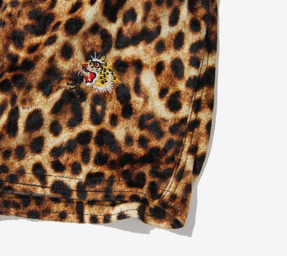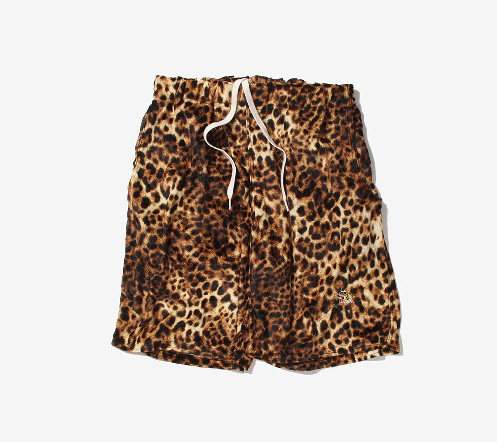 パイル風ストレッチ素材のレオパード地を使用したリラックスショーツ。フロントにはスーベニア風のヒョウをワンポイント刺繍であしらっております。