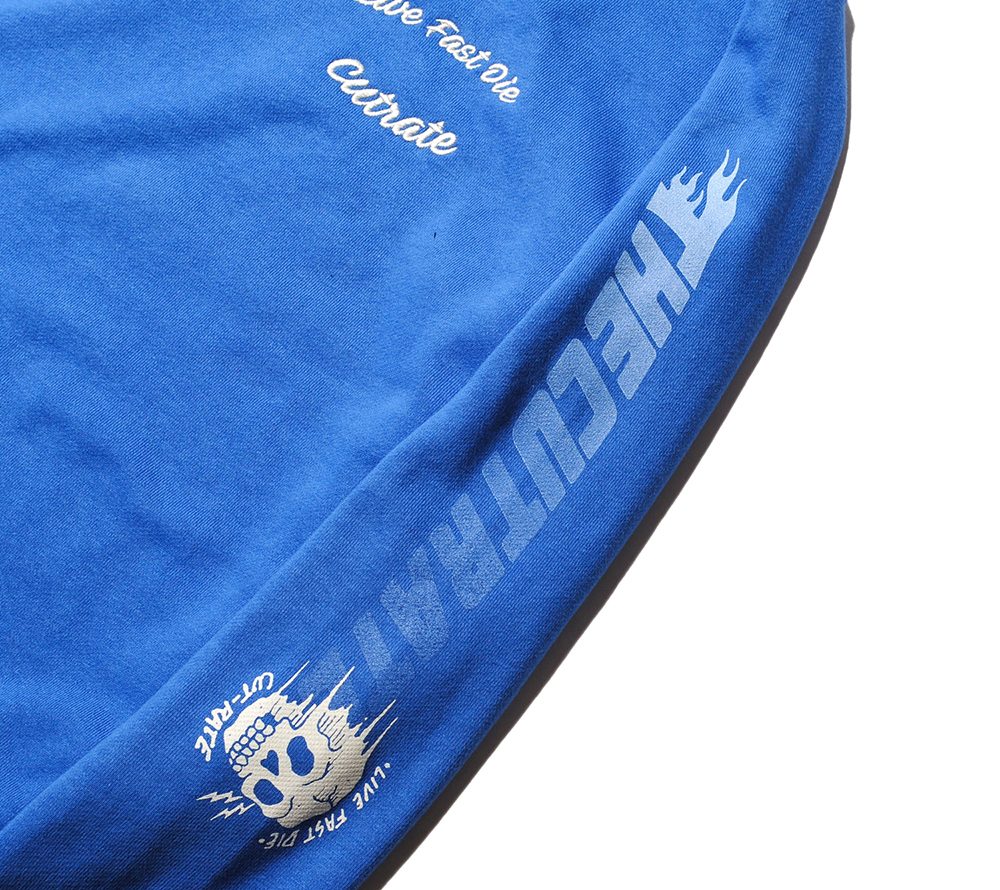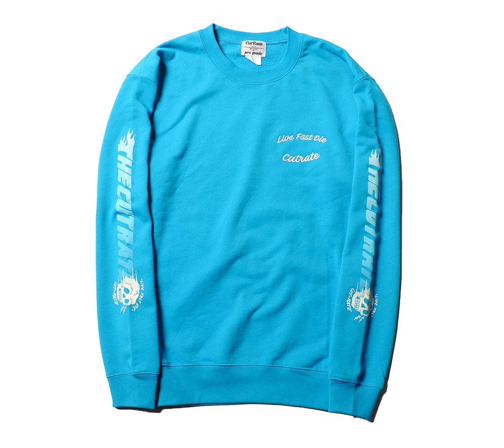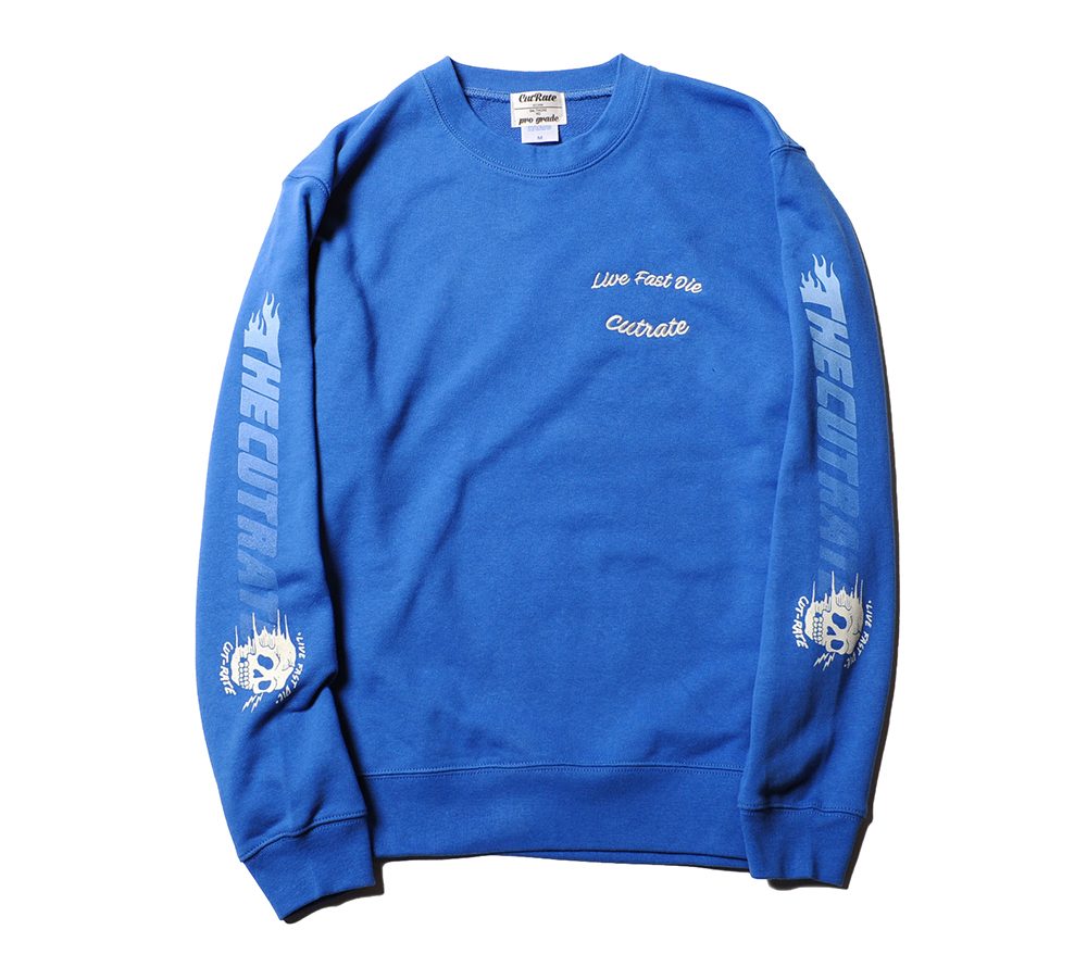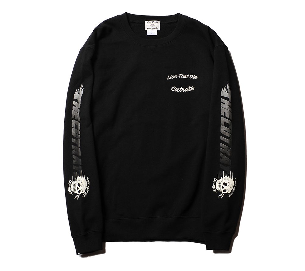 コットン100%で作製されたクルーネックスウェット。スリーブにプリント、左胸に刺繍が入ります。モーターサイクルカルチャーをバックボーンに持つ、CUTRATEらしいグラフィッックが目を引く、スウェットに仕上がっています。