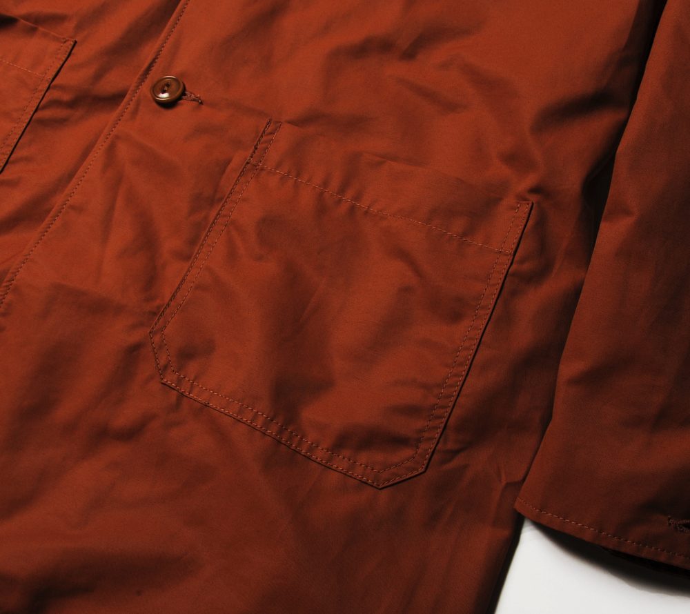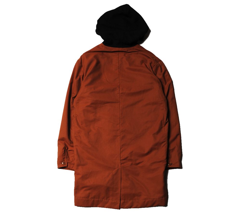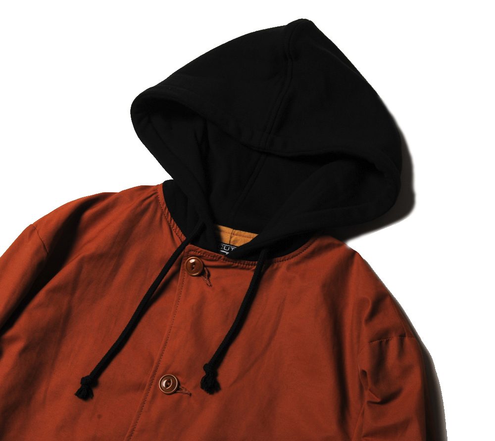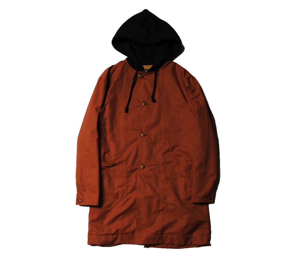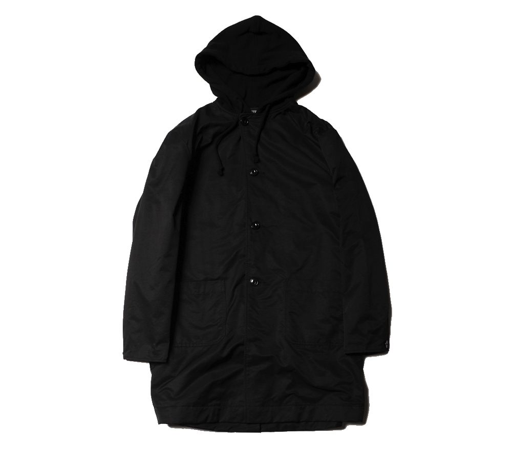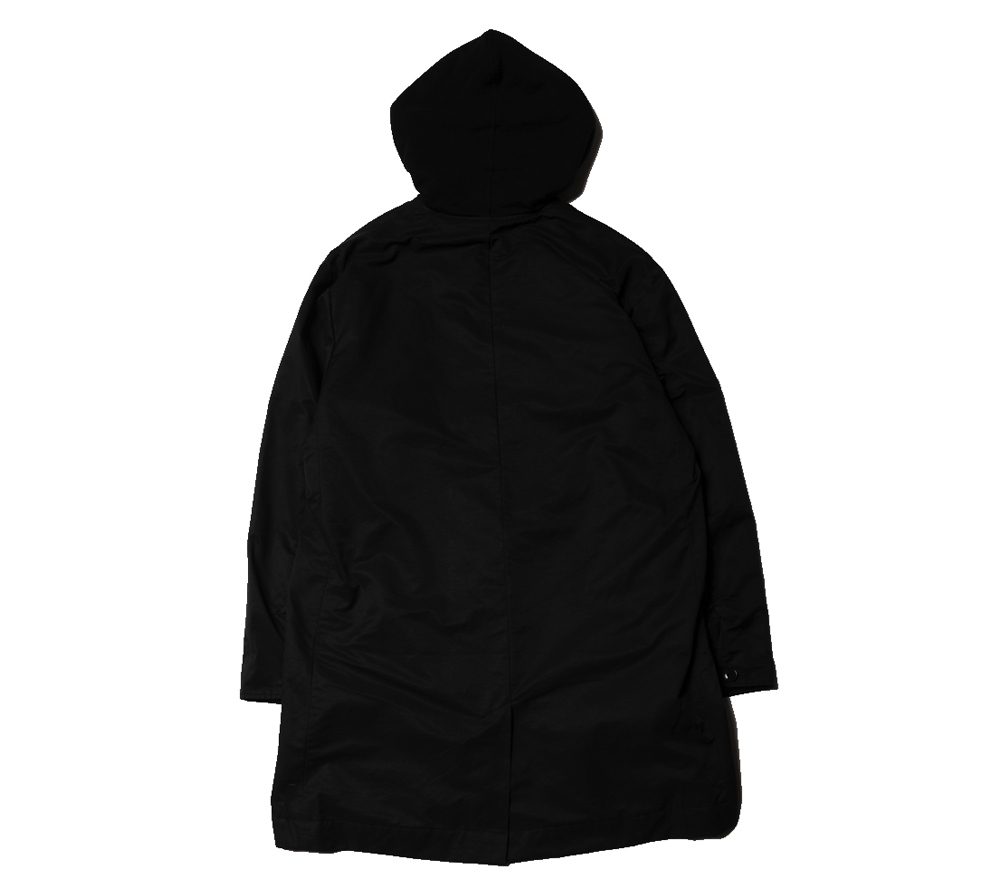 コットンとナイロンの混紡の生地を使用して作製されたコートとなります。シンプルなデザインで着回しが効きやすいアイテムとなっております。また、フードが付いた仕様となっており、パーカーを重ね着したような雰囲気が楽しめ、スケートカルチャーの雰囲気も感じられるアイテムとなっております。