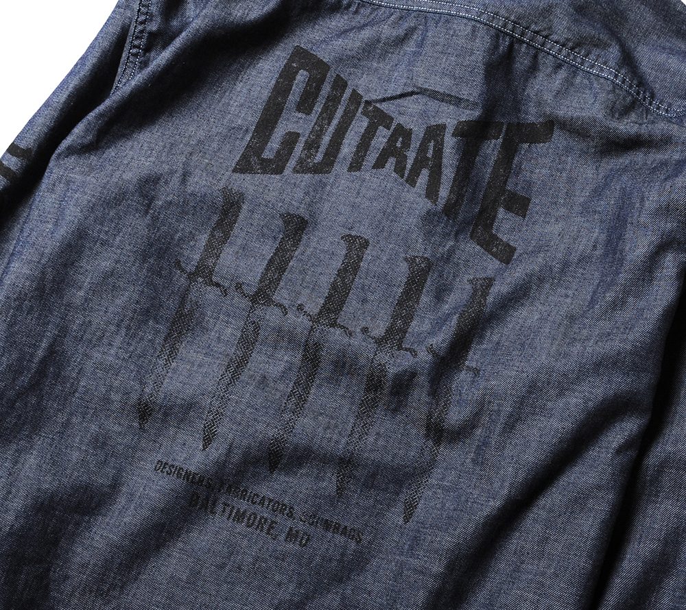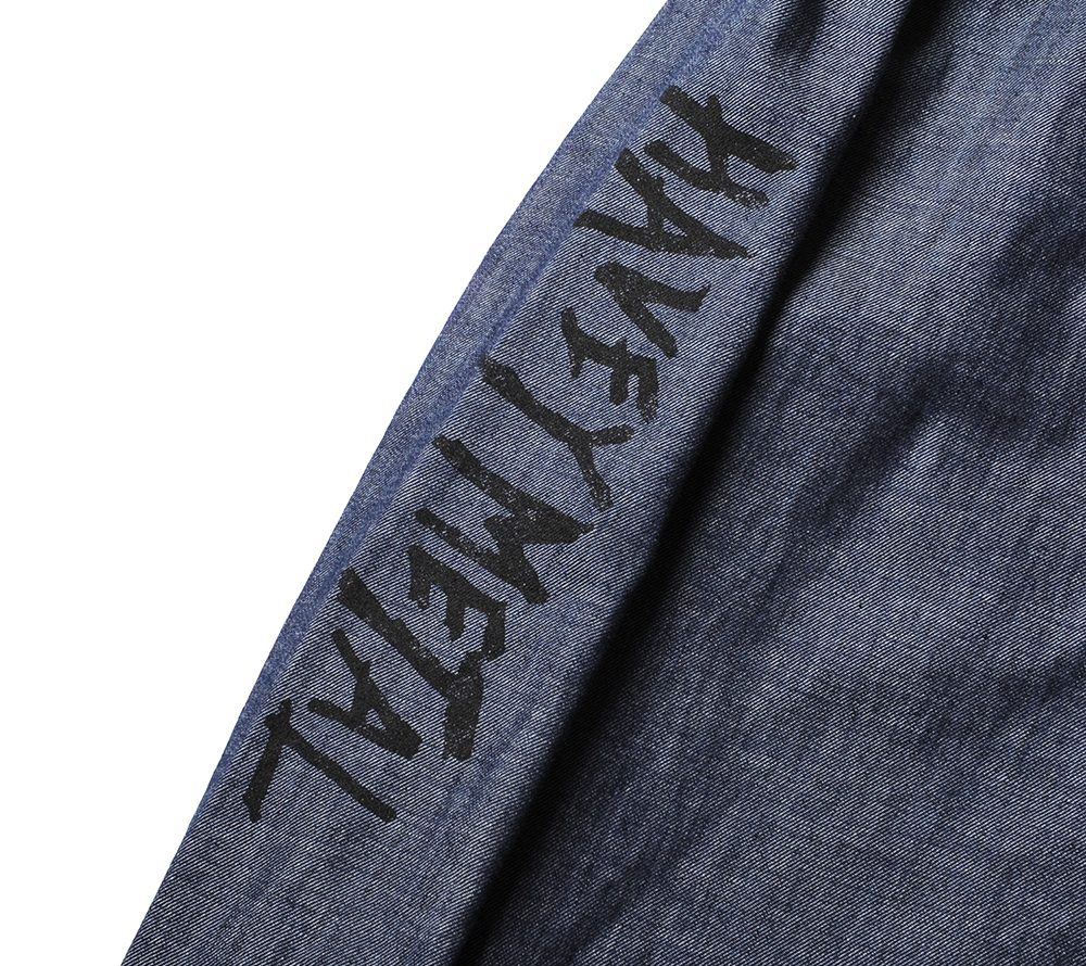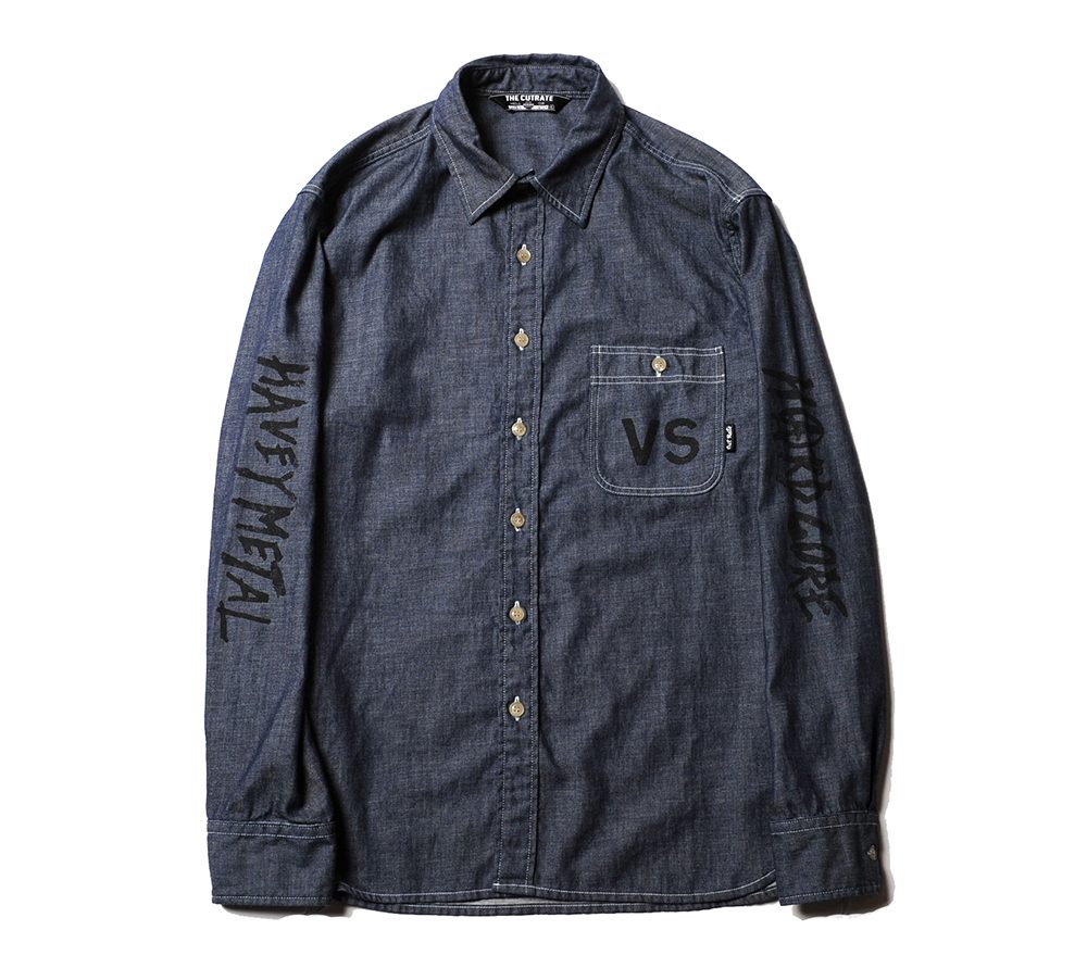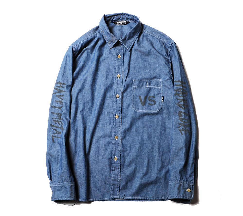 ライトオンスのシャンブレー地で製作したL/Sシャツ。フロントポケット、バック、両袖にそれぞれプリントが入ります。80'sのライブハウスで実際に行われていたイベントフライヤーの文字をそのままサンプリングし、ヘビーメタルのスペルが間違っていますが、その当時のフライヤーのデザインも間違っていたので、あえてその文字を採用したデザインとなっています。バックにはデザイナーがコレクションしているナイフのグラフィックをプリントし、デザイナーの世界観が詰まったシャツに仕上がっています。