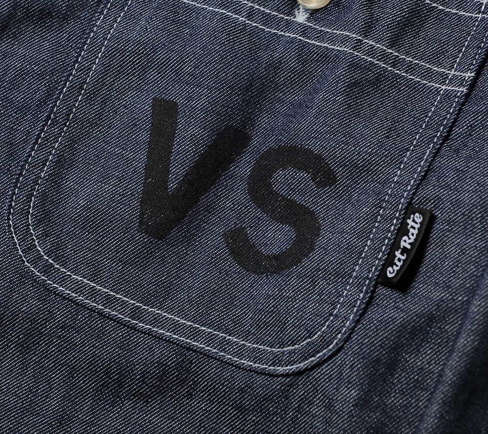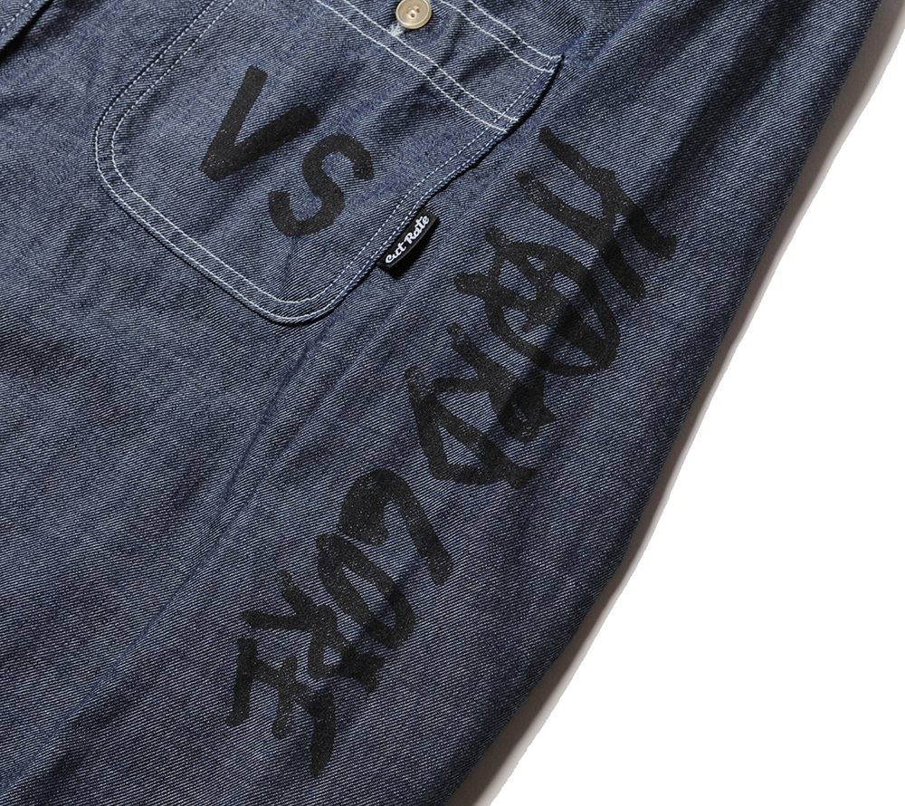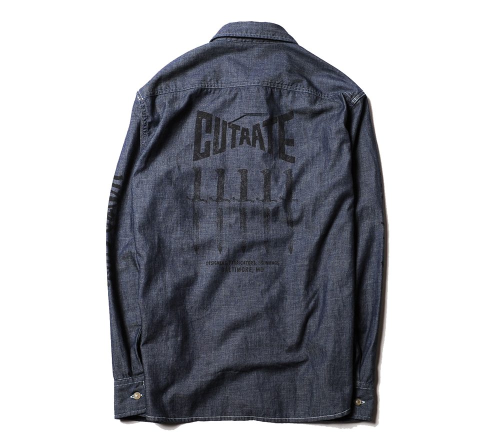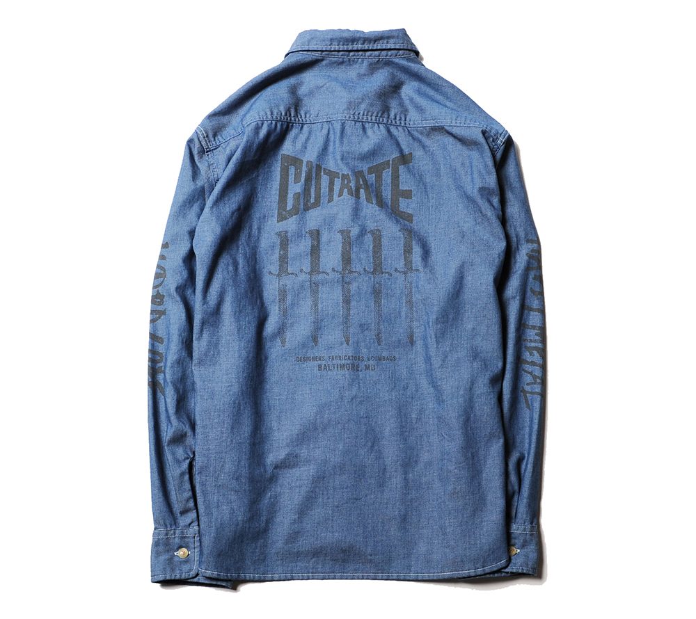 ライトオンスのシャンブレー地で製作したL/Sシャツ。フロントポケット、バック、両袖にそれぞれプリントが入ります。80'sのライブハウスで実際に行われていたイベントフライヤーの文字をそのままサンプリングし、ヘビーメタルのスペルが間違っていますが、その当時のフライヤーのデザインも間違っていたので、あえてその文字を採用したデザインとなっています。バックにはデザイナーがコレクションしているナイフのグラフィックをプリントし、デザイナーの世界観が詰まったシャツに仕上がっています。