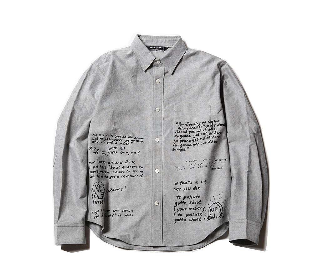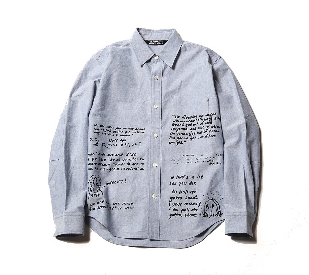 コットン100%のオックスフォード生地を使用して作製されたL/Sシャツになります。デザイナーの好きなバンドの歌詞をプリントしたギミックの効いたシャツとなっており、CUTRATEらしさの溢れるアイテムとなっております。デザイン性にも富んだアイテムとなっておりますので、一枚でも十分に魅せれるアイテムです。