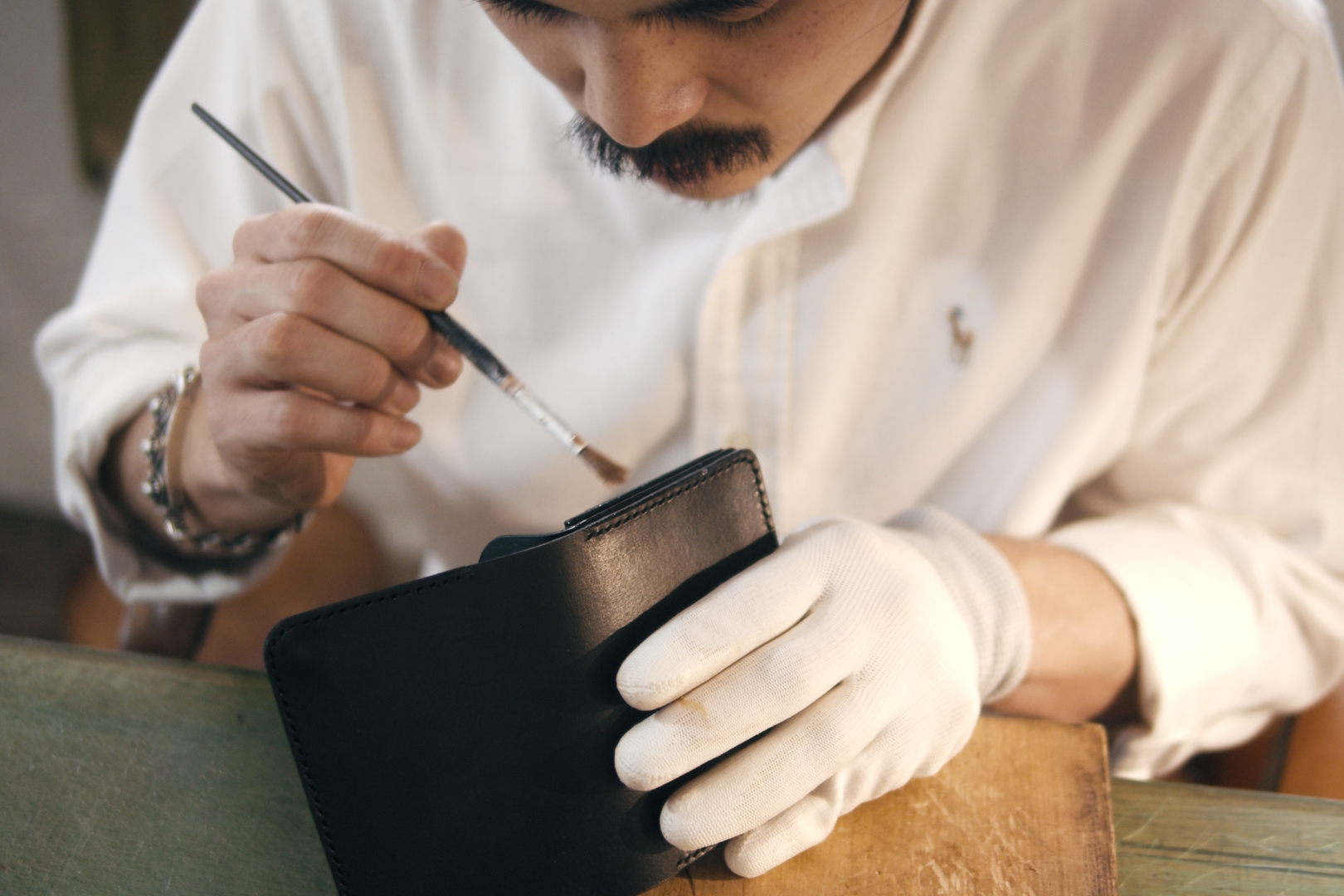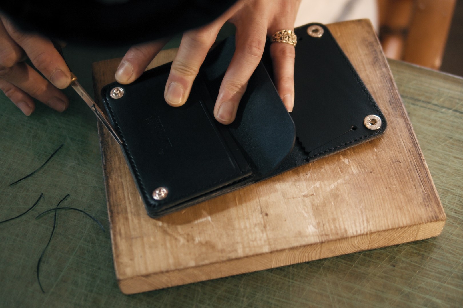 中身は彼の作製しているミニウォレットをベースに致しました。ポイントとしては程よく入るカードケースと札入れ部分を縦入れにしたことです。縦入れは、お金を立てると言う意味合いや、日本人が古来より親しんできた日本独自とも言える封筒文化を踏襲した願掛けにも似た想いを込めました。そして、札入れのフラップ部分にも「和」の心を取り入れたく、富士山の残雪のアウトラインをイメージし作製。コインケース部分もフラップに変更致しました。アウターシェルは敢えてシンプルにプレーンのままとし、両端のスナップボタンをインナースナップにすることで、経年後に現れてくる艶がセクシーになるのではと彼の意見の元、採用致しました。ロゴは敢えて主張しすぎず、インンサイドのみに打刻致しました。財布を無くし易い自分だけに、忘れずチェーンが取り付け出来るようハト目菅もつけております。素材の良さが生きるシンプルな外側と、和の要素を取り入れた内側を持つミニウォレットがこれにて完成致しました。 是非、来たる6月20日の開運日にでも新たな門出に使って頂きたいものです。