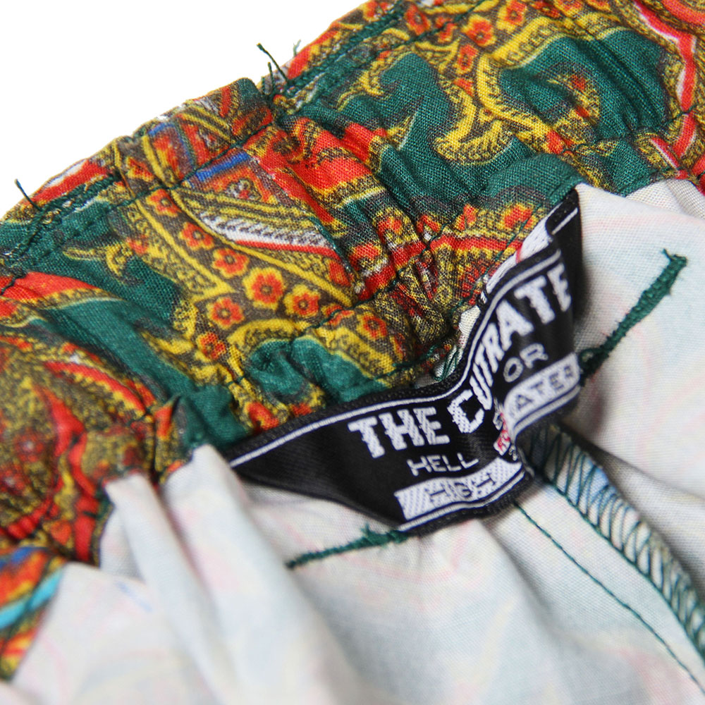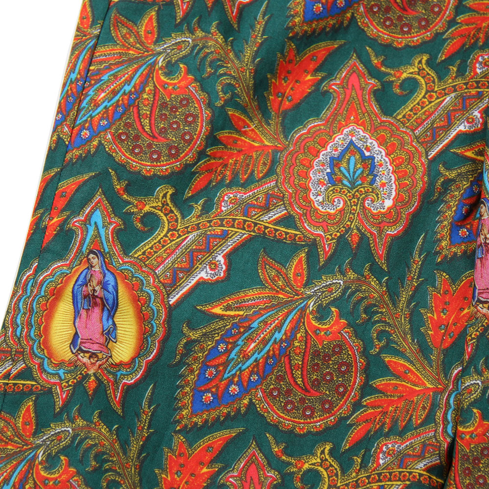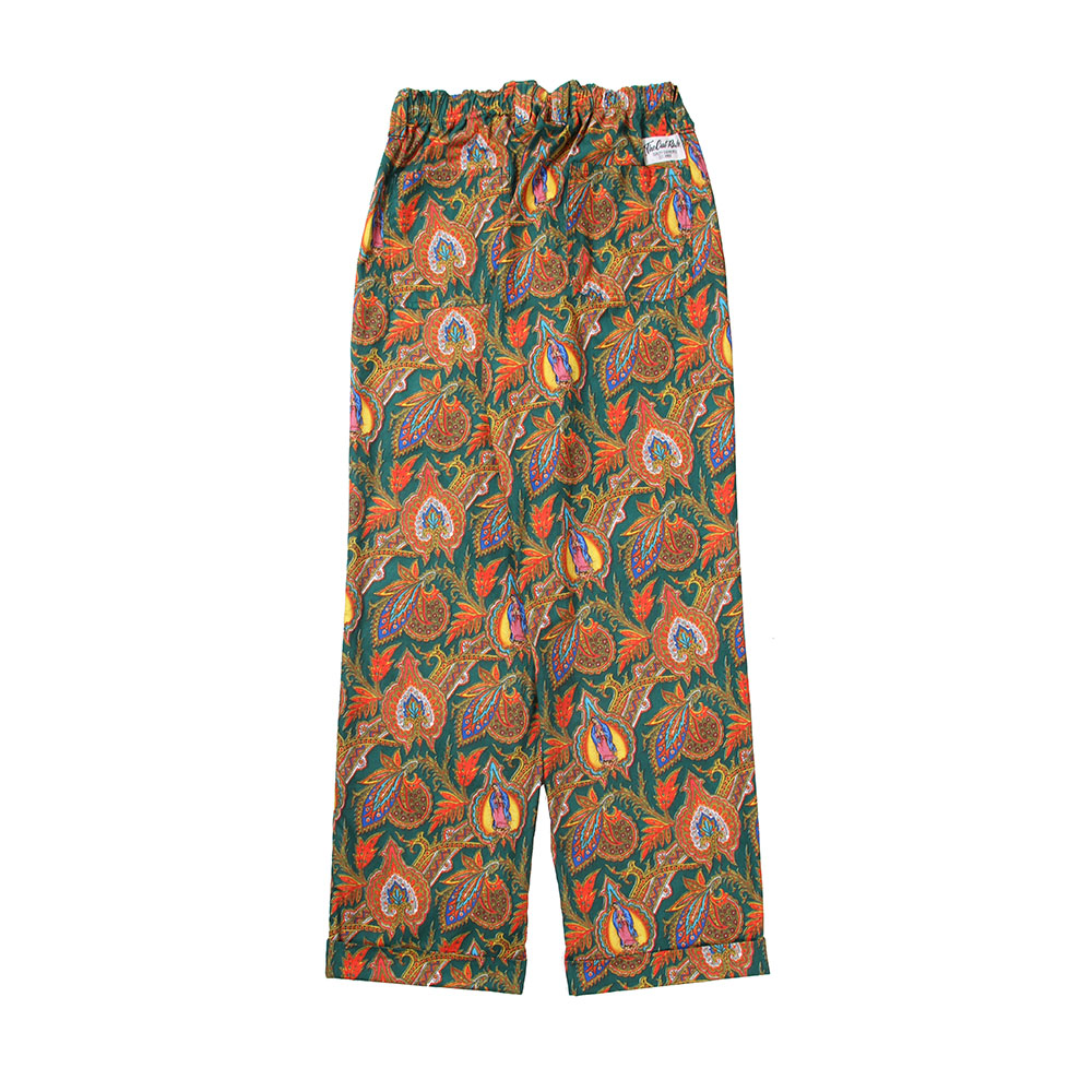カットレイトのオリジナル総柄。今回はペイズリーにマリアを合わせたスペシャルな柄を作製。洗いや、経年変化を踏まえコットン100%ボディを採用。ゴム入りベルトループ付きイージーパンツ。テーパードは緩めのストレートタイプで。