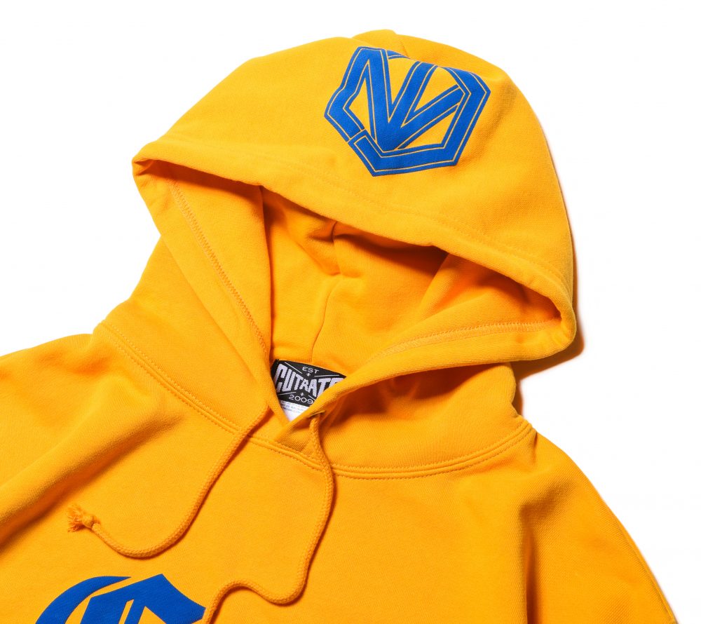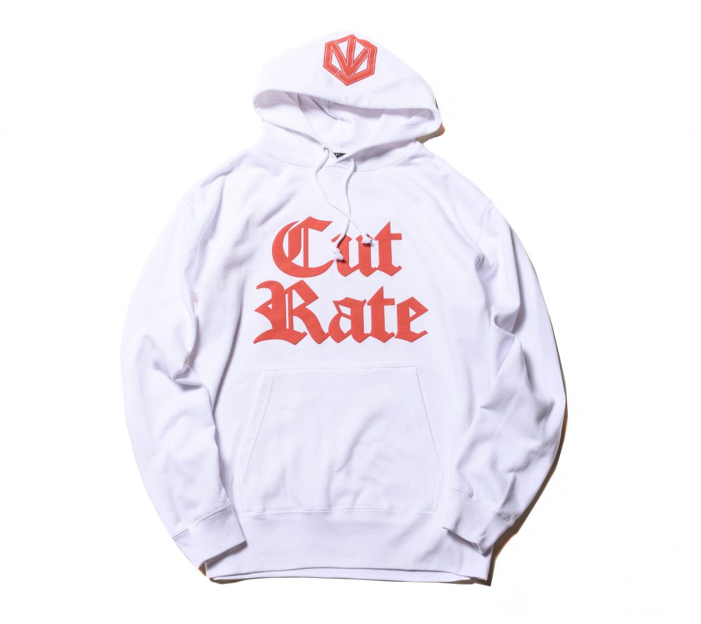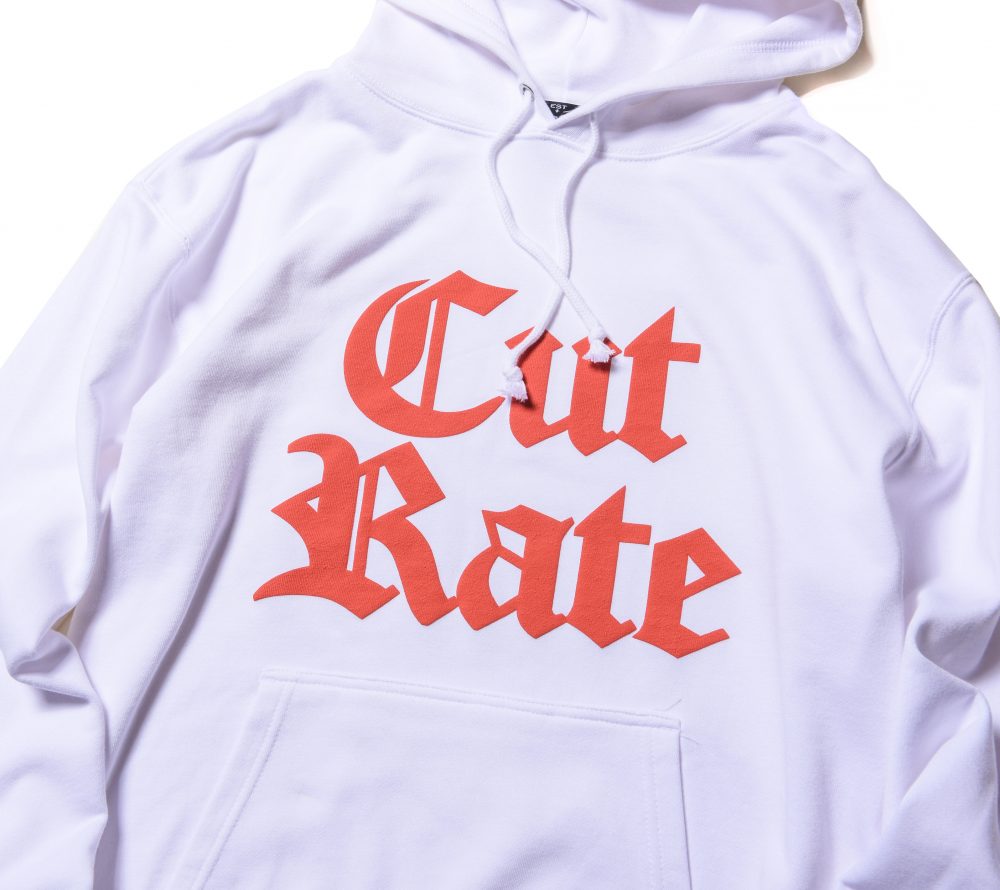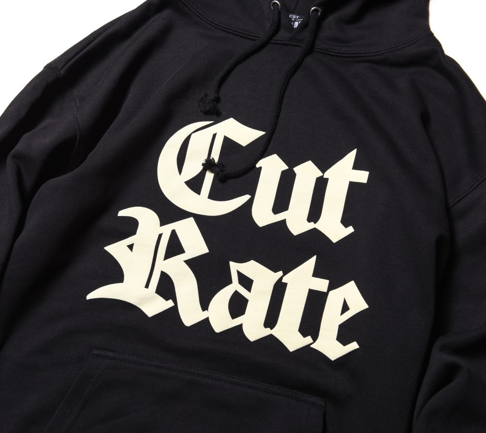 フロントにCUTRATEオールドイングリッシュロゴを発泡プリントで落とし込んだデザイン。フードには、CRを掛け合わせたプリントが入る。PULLOVERのPARKAで製作。