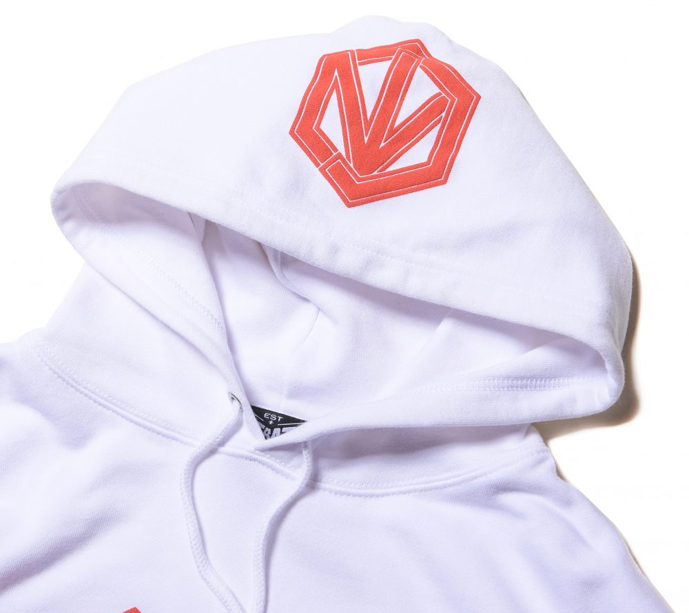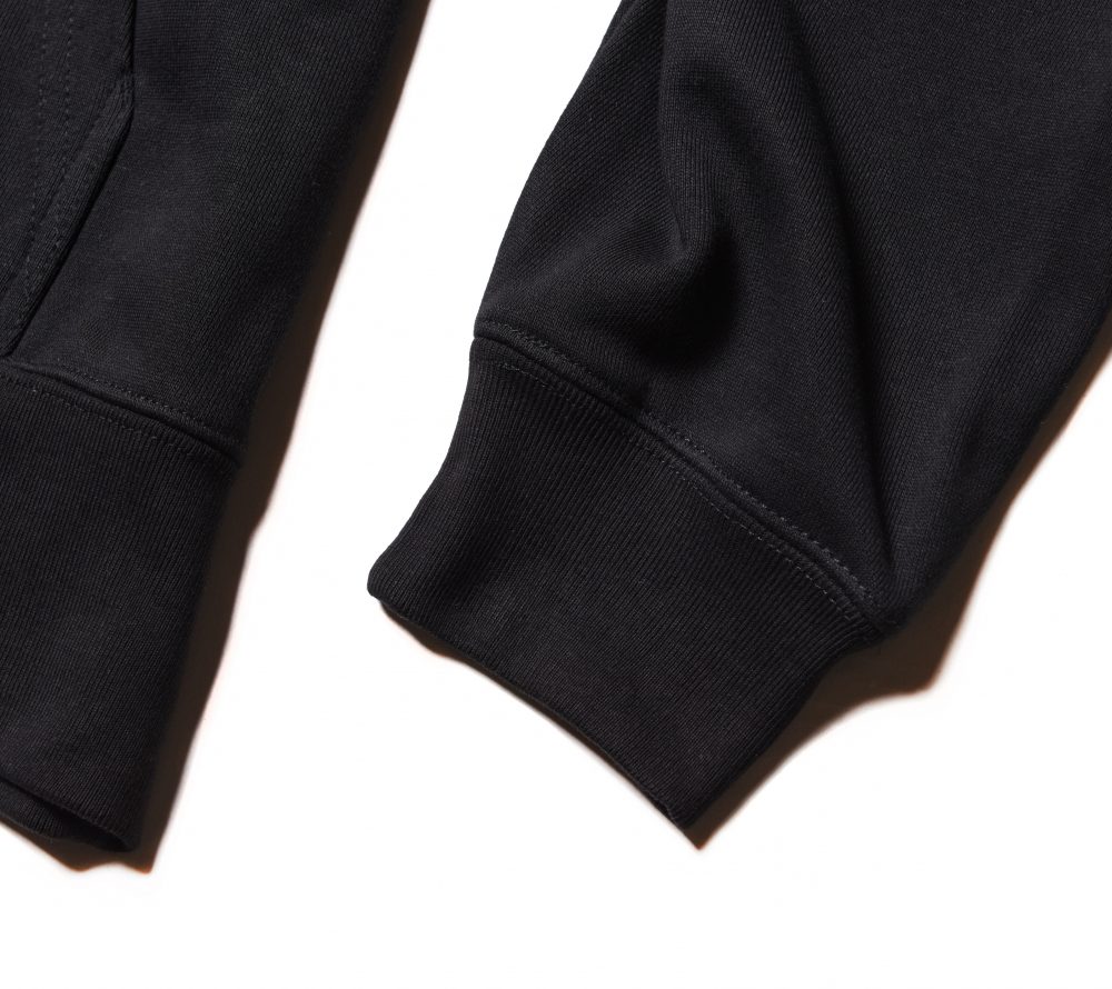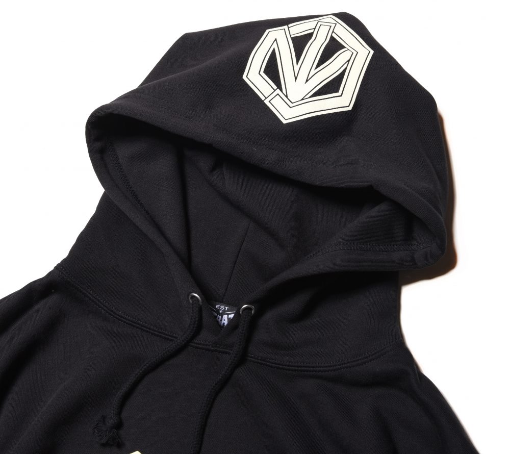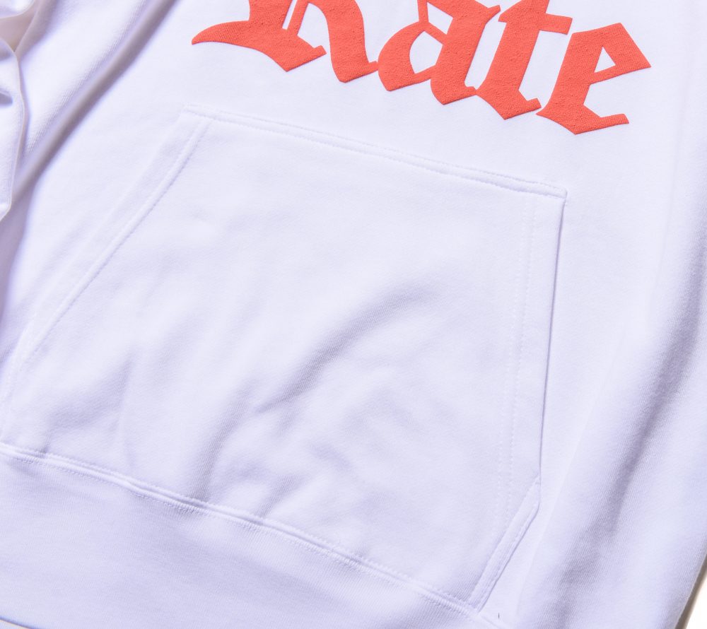 フロントにCUTRATEオールドイングリッシュロゴを発泡プリントで落とし込んだデザイン。フードには、CRを掛け合わせたプリントが入る。PULLOVERのPARKAで製作。