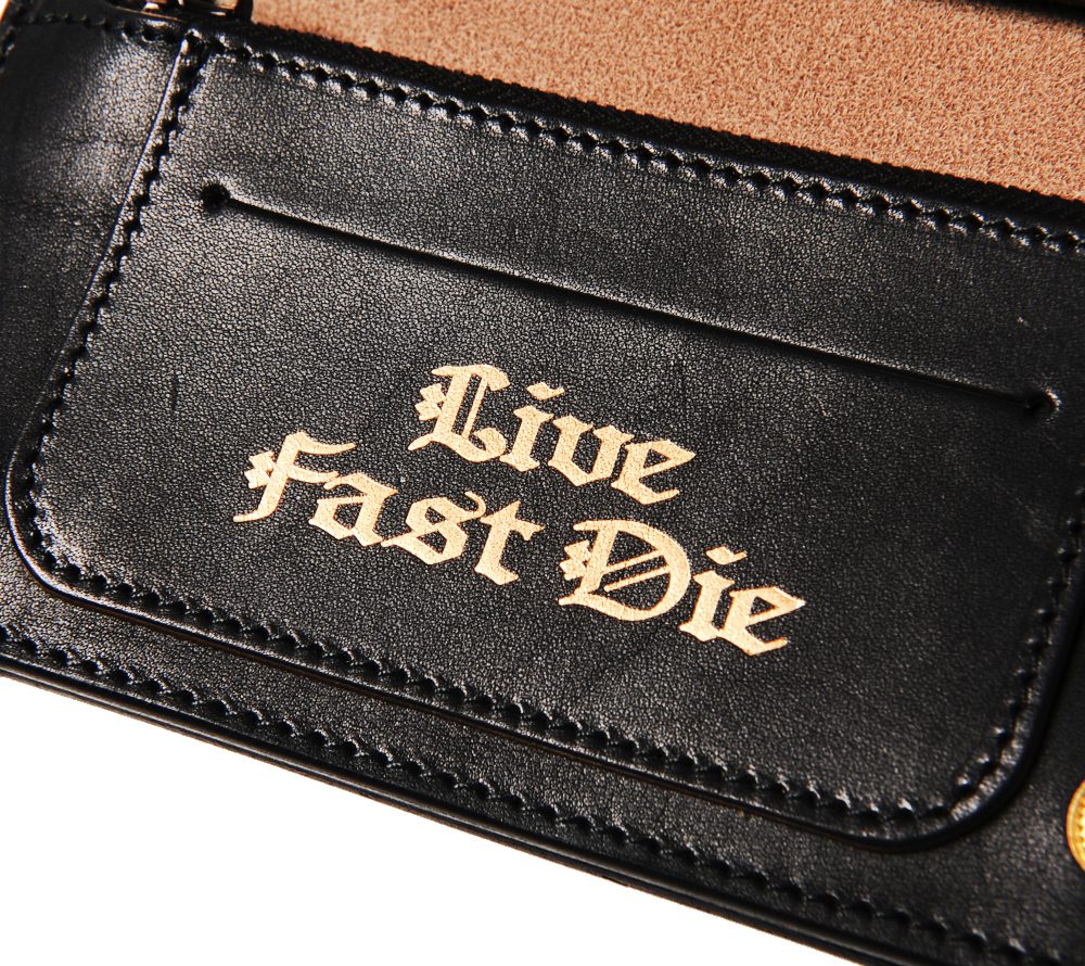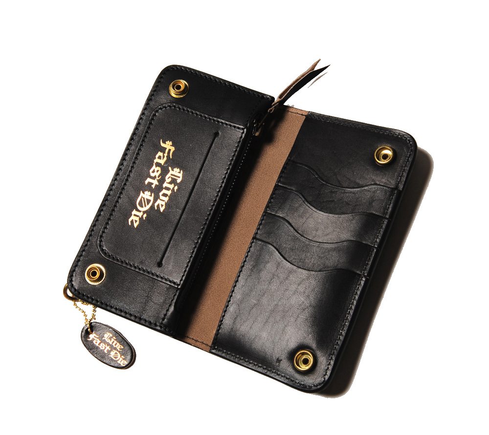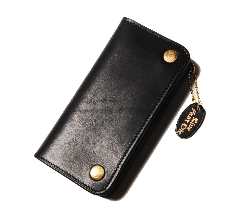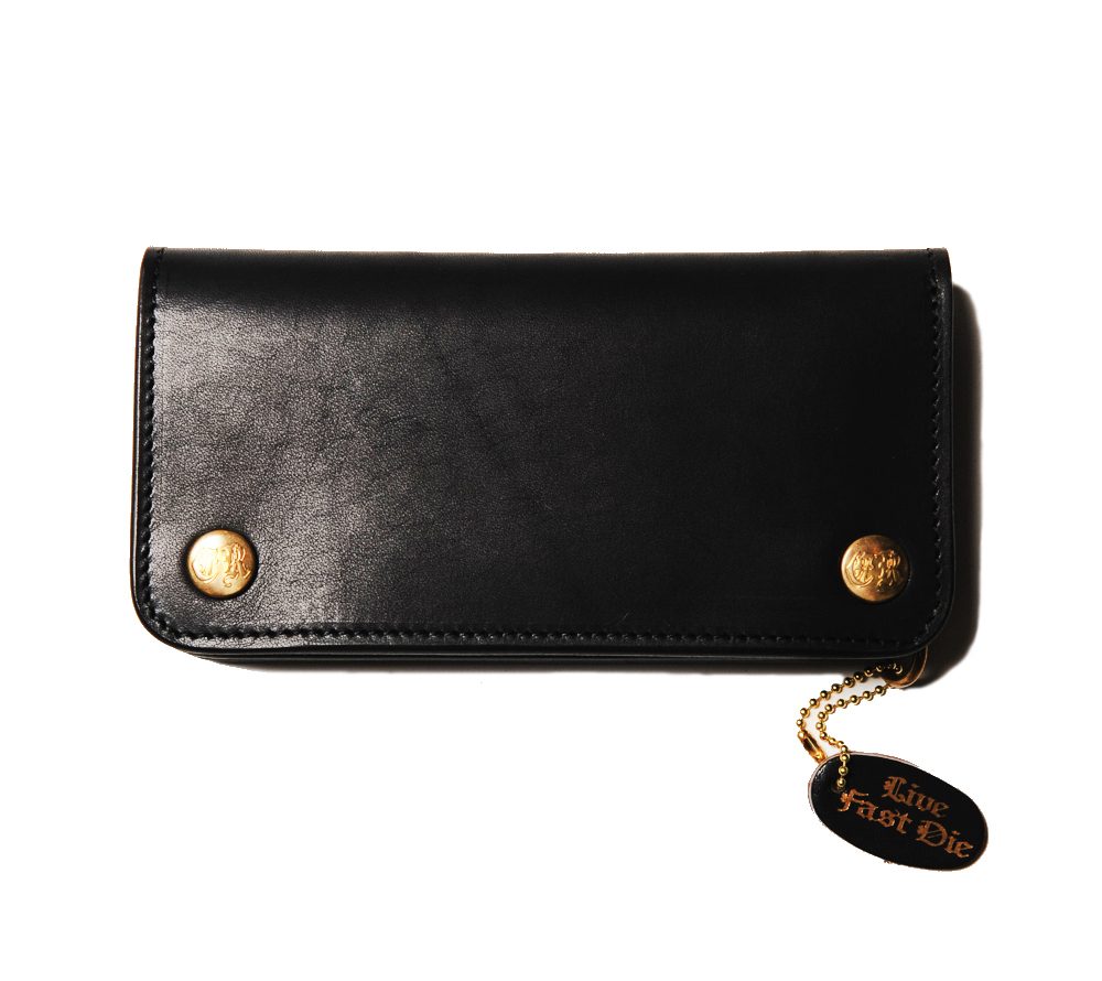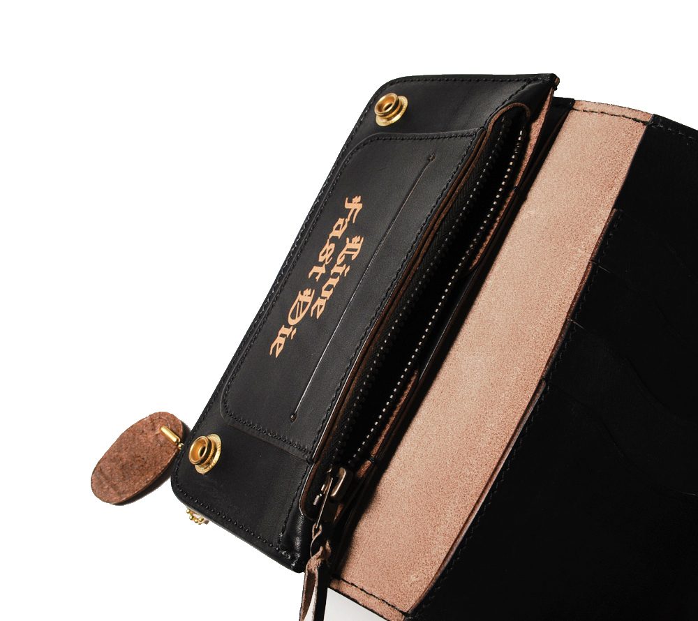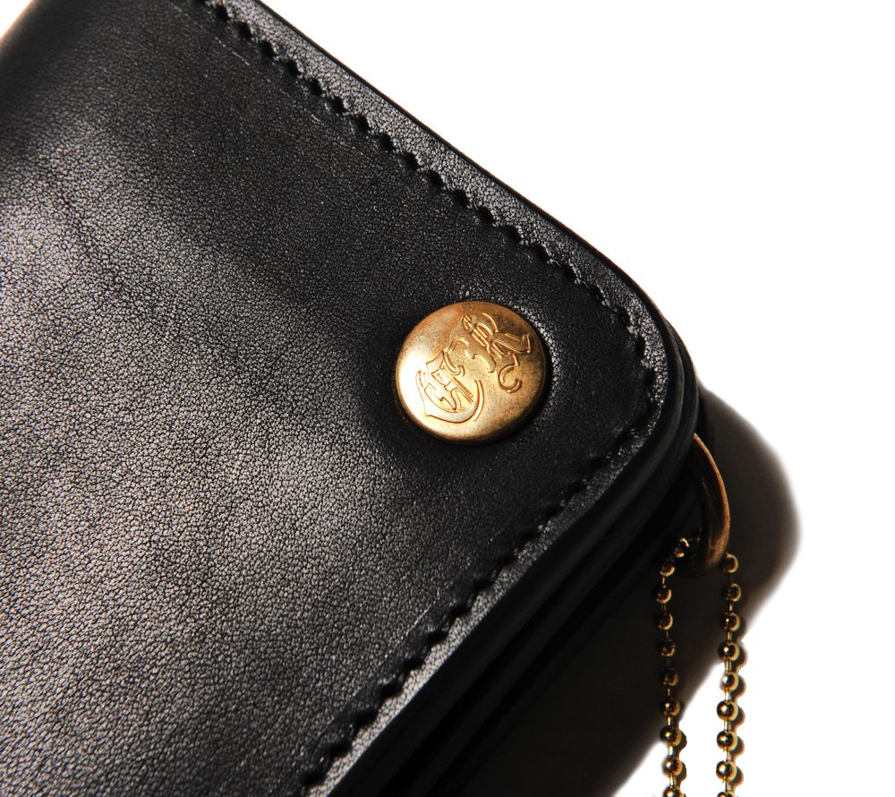 レザー職人によるハンドメイドで製作したプレーンレザーウォレット。バイカーウォレットタイプですが、インサイドにはカード入れを充実させています。シンプルながらもオリジナルのスナップボタンやインサイドのペイントでブランドらしさを表現。レザー部分とペイント部分の使い込んでいくうちの馴染みが楽しみです。