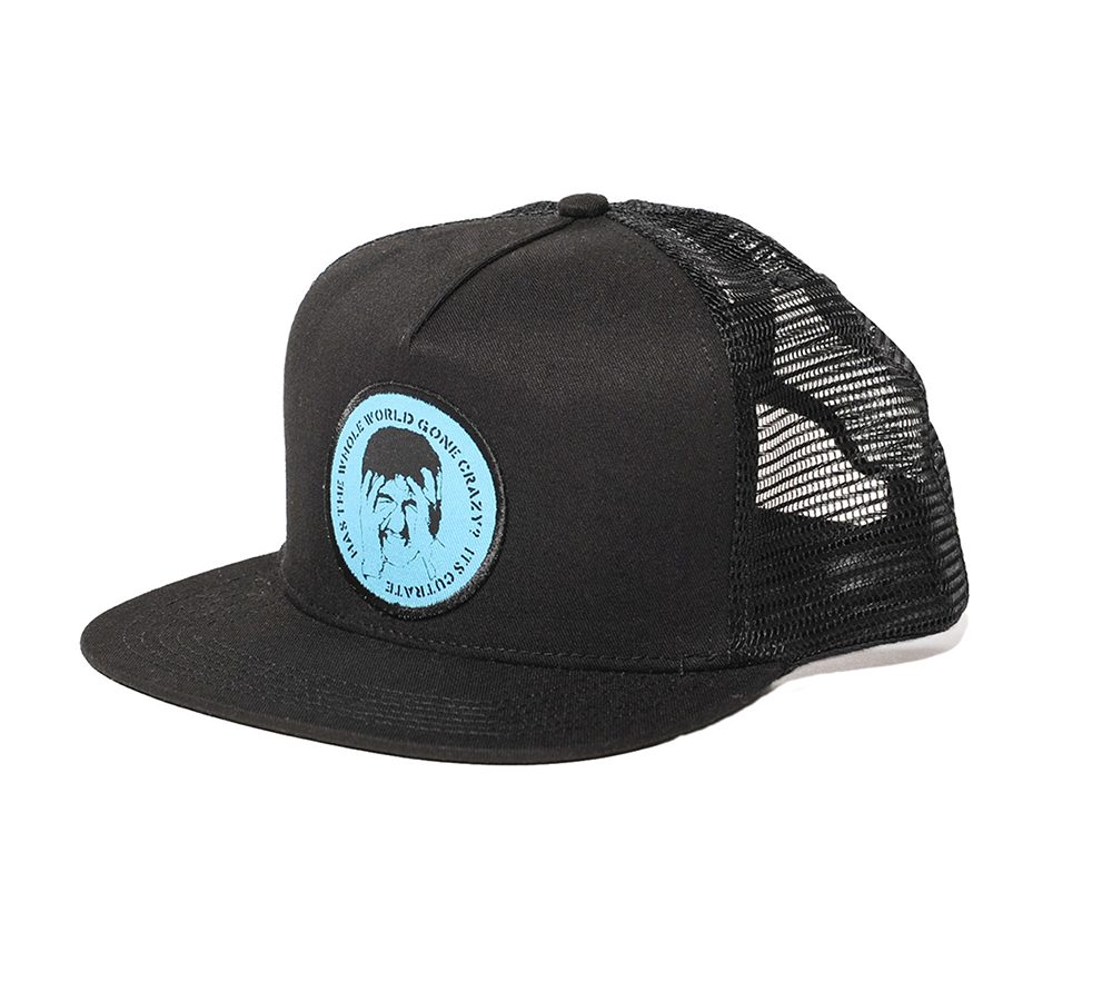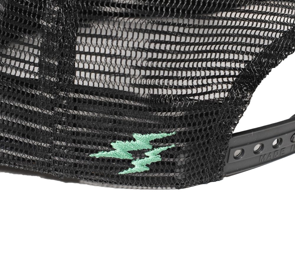 フロントパネルにプリントを配したメッシュCAP。スナップバック横にはライトニングボルトの刺繍が入ります。某メタルバンドのCDジャケットをサンプリングしたネタもののグラフィック。ブランドのアイデンティティーが表現されています。