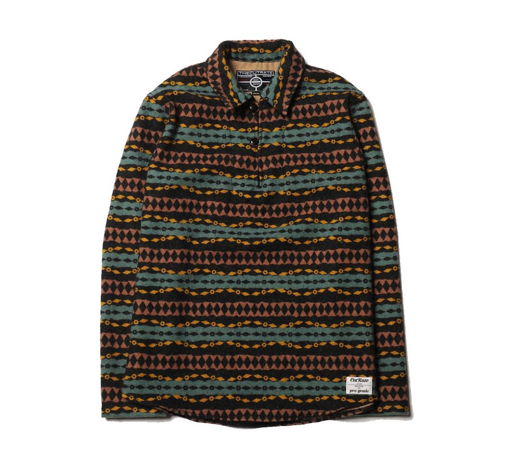 オリジナルで作製されたネイティブボーダー柄の生地を使用し、作製されたプルオーバータイプのL/Sシャツになります。生地はオリジナルで作製しており、保温性にも優れたシャツに仕上がっております。また、オリジナルのボーダー柄が一枚でもインナーでもスタイルのアクセントとして重宝出来るのではないでしょうか。