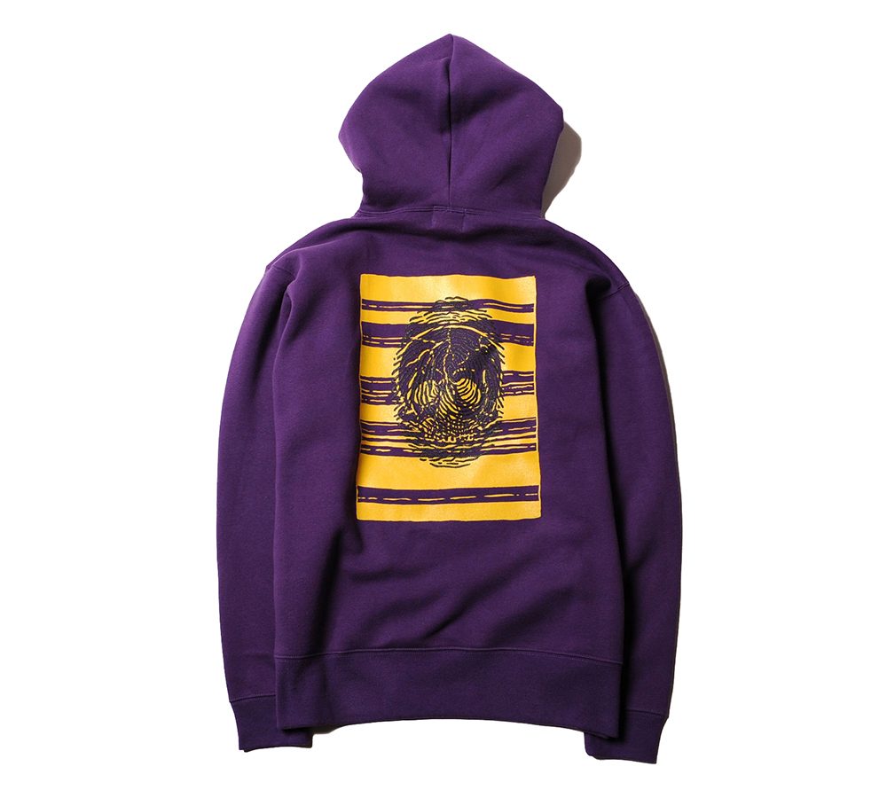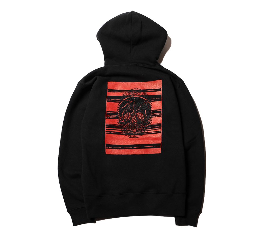 裏起毛のCUTTRATE定番ボディーを使用したプルオーバータイプのパーカー。フロント左胸にブランドロゴ、バックにはグラフィックがプリントされています。バックプリントのグラフィックはデザイナーと親交が深いL.A在住のアーティストBEAM氏のデザインによるものです。