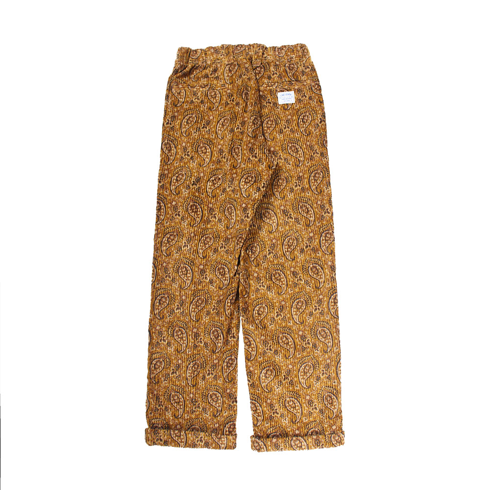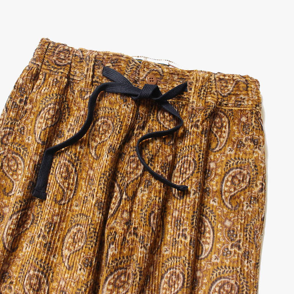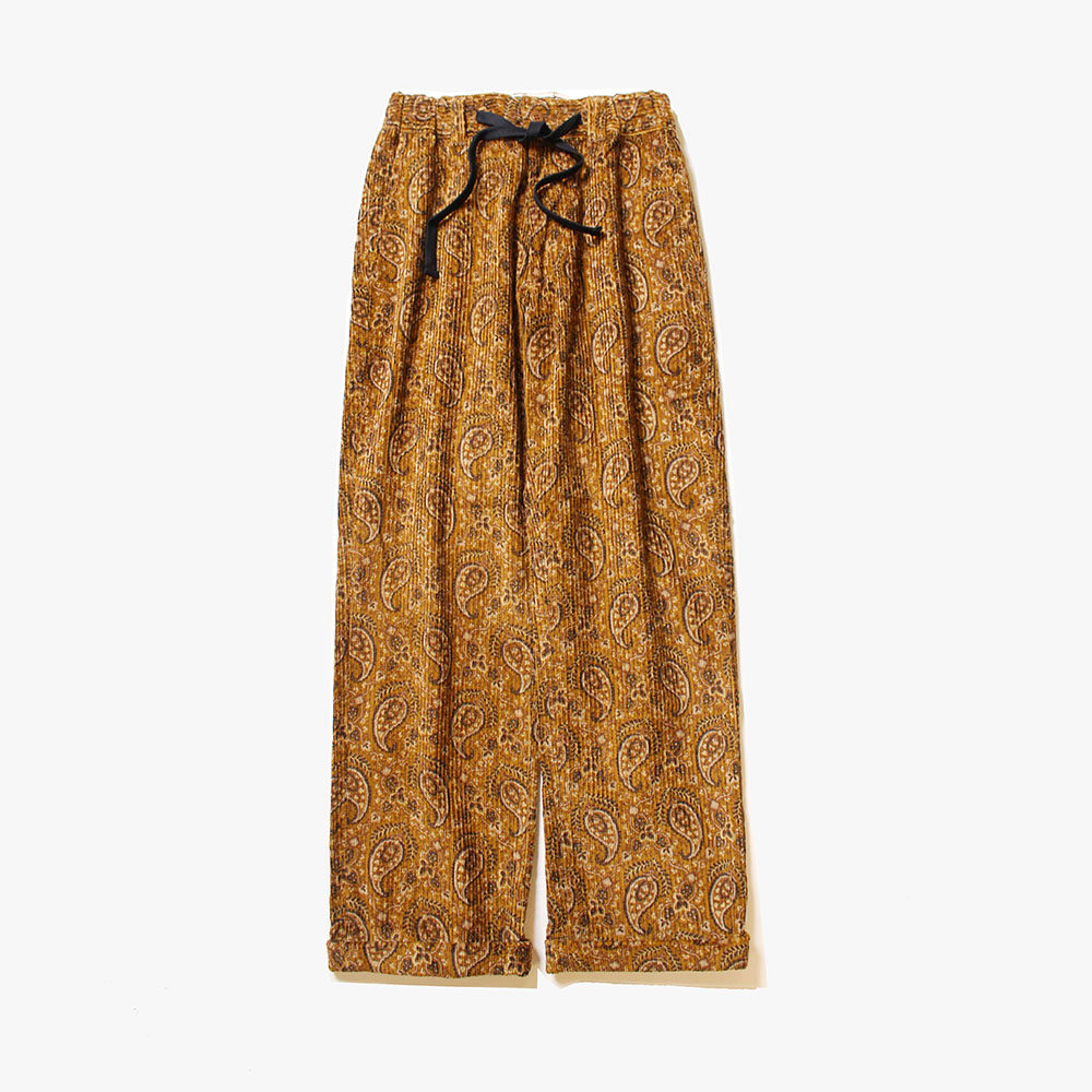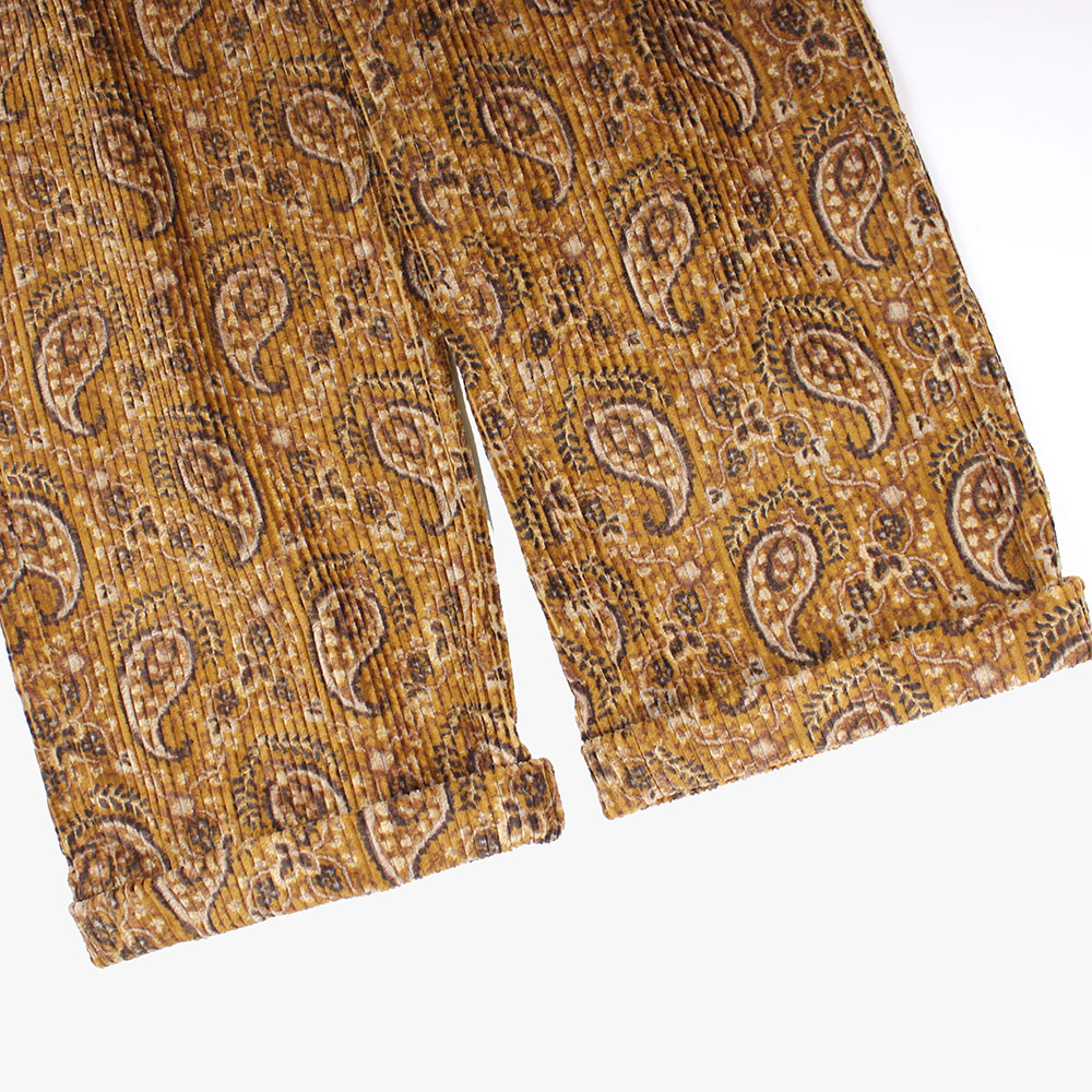 インディゴで染められたストライプのコールテン地とマズタードカラーのペイズリー柄のコールテン地を使用したイージートラウザーズパンツ。ウエスト周りに気軽に履けるよう、ゴムと紐を付け、裾はダブル仕様となった冬のリラックスパンツ。