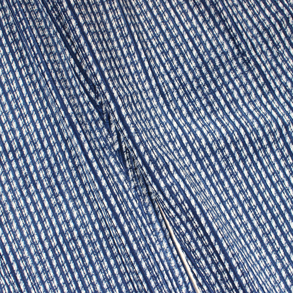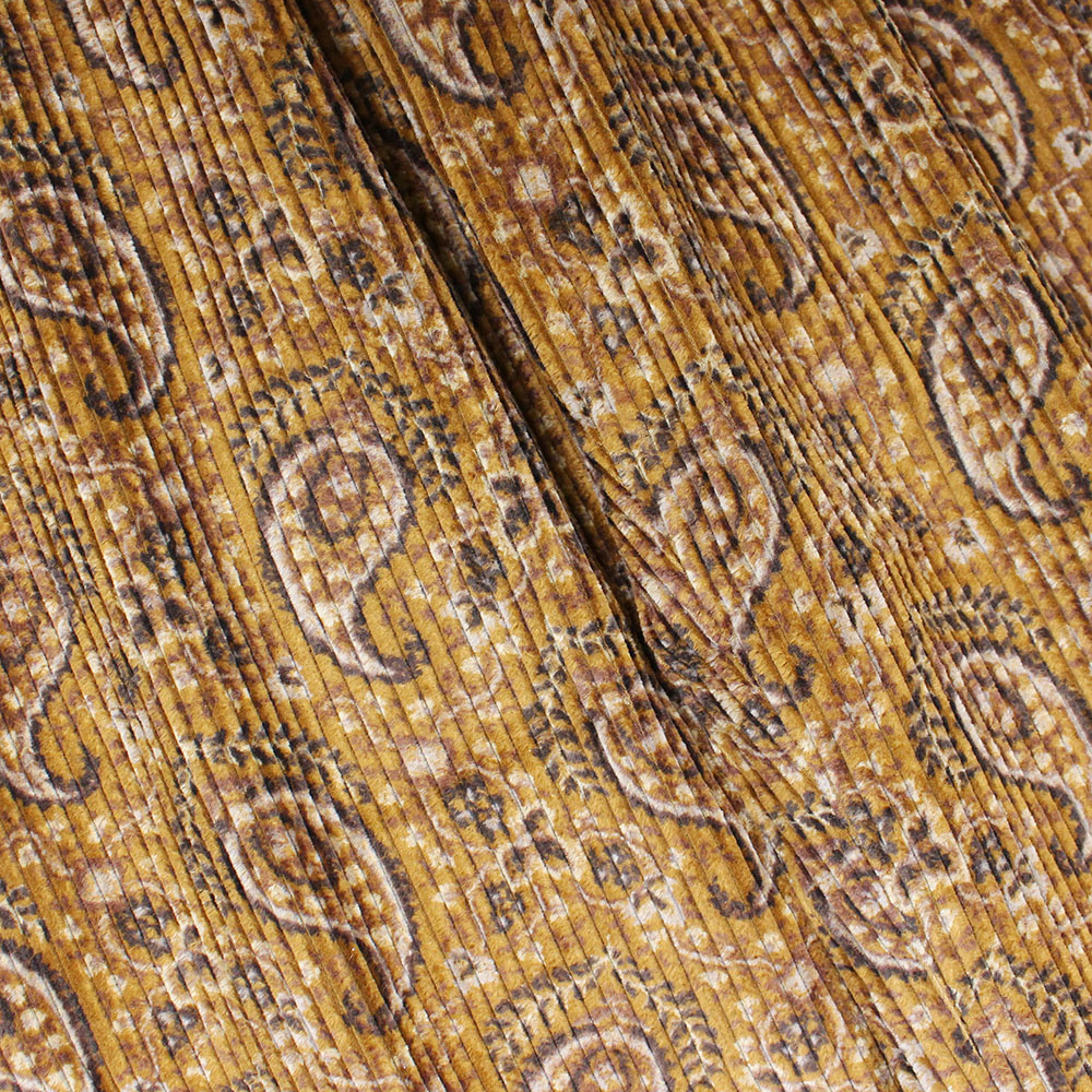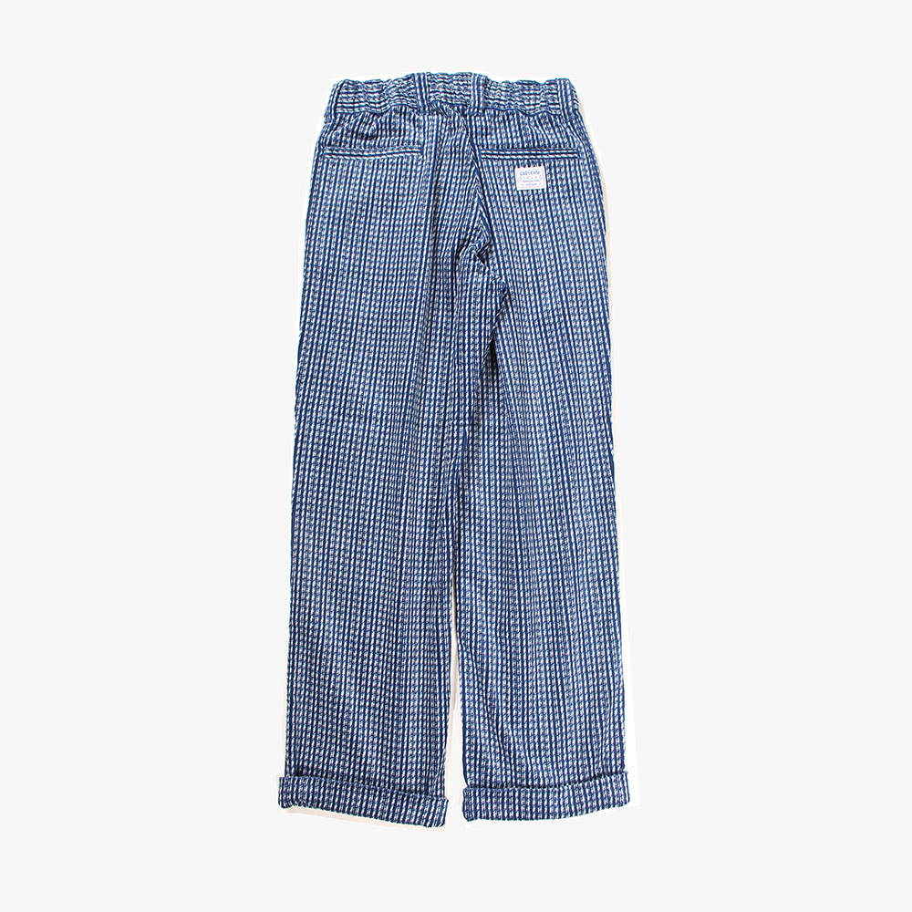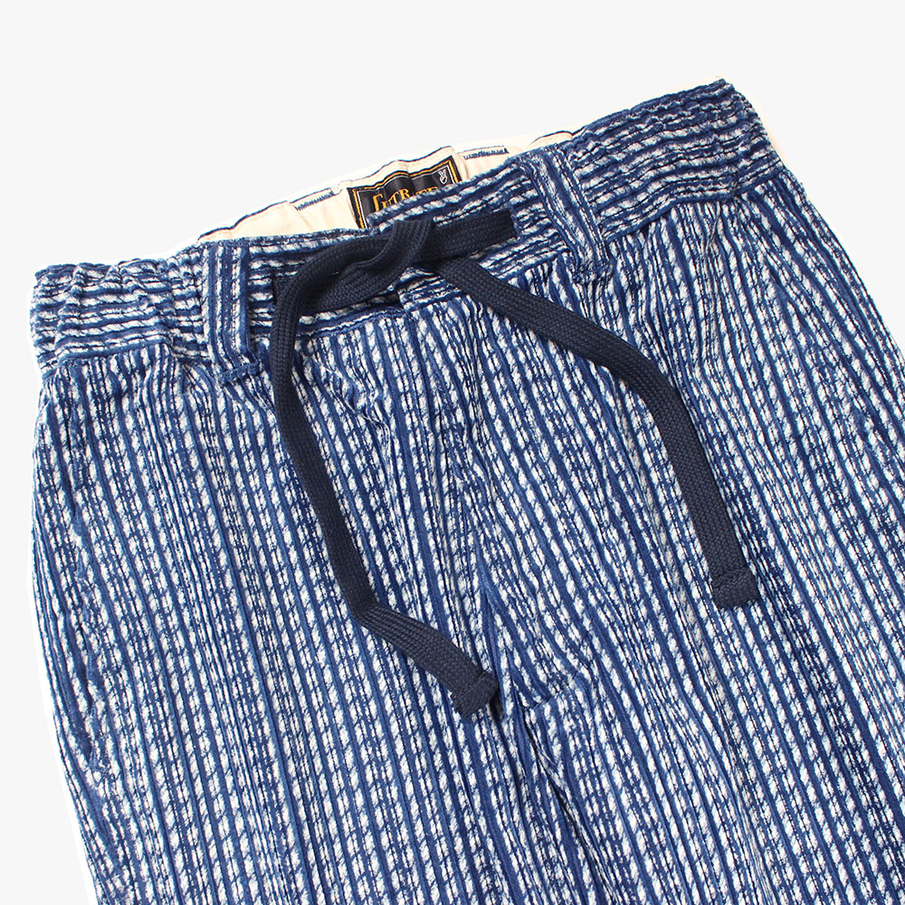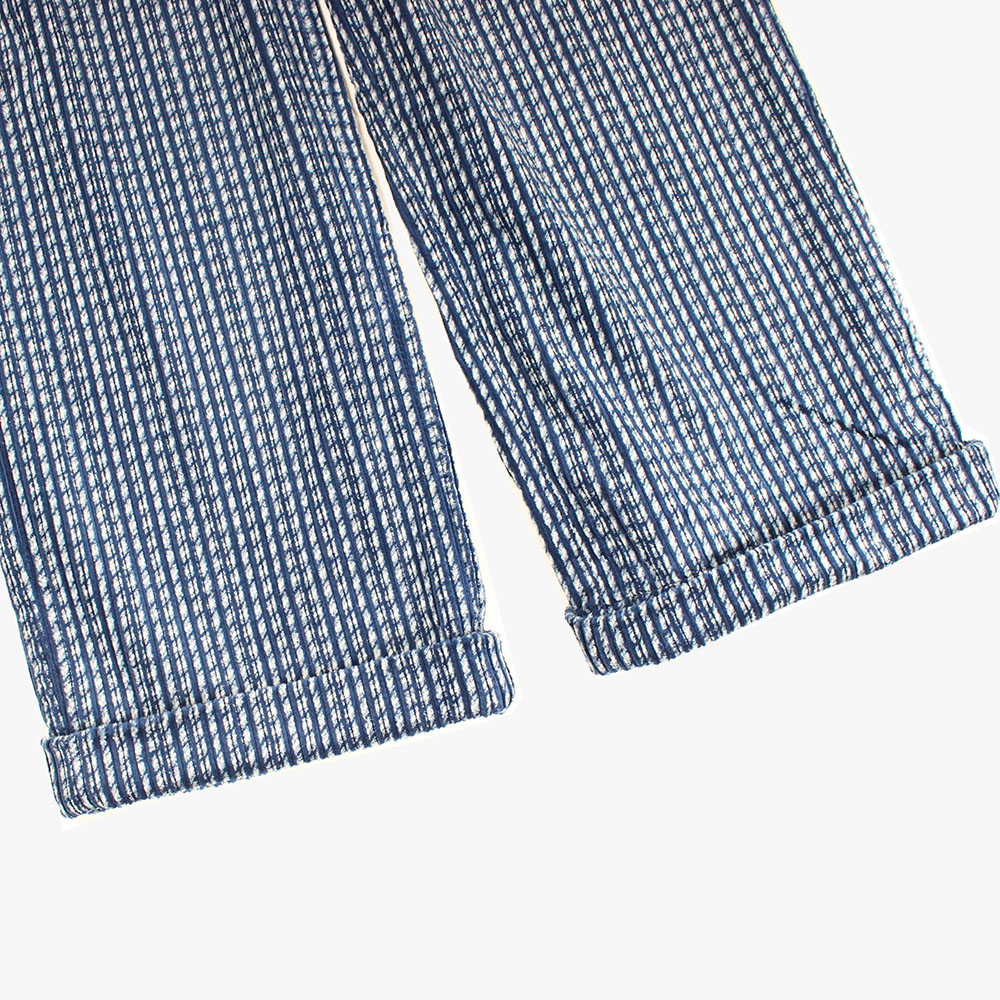 インディゴで染められたストライプのコールテン地とマズタードカラーのペイズリー柄のコールテン地を使用したイージートラウザーズパンツ。ウエスト周りに気軽に履けるよう、ゴムと紐を付け、裾はダブル仕様となった冬のリラックスパンツ。
