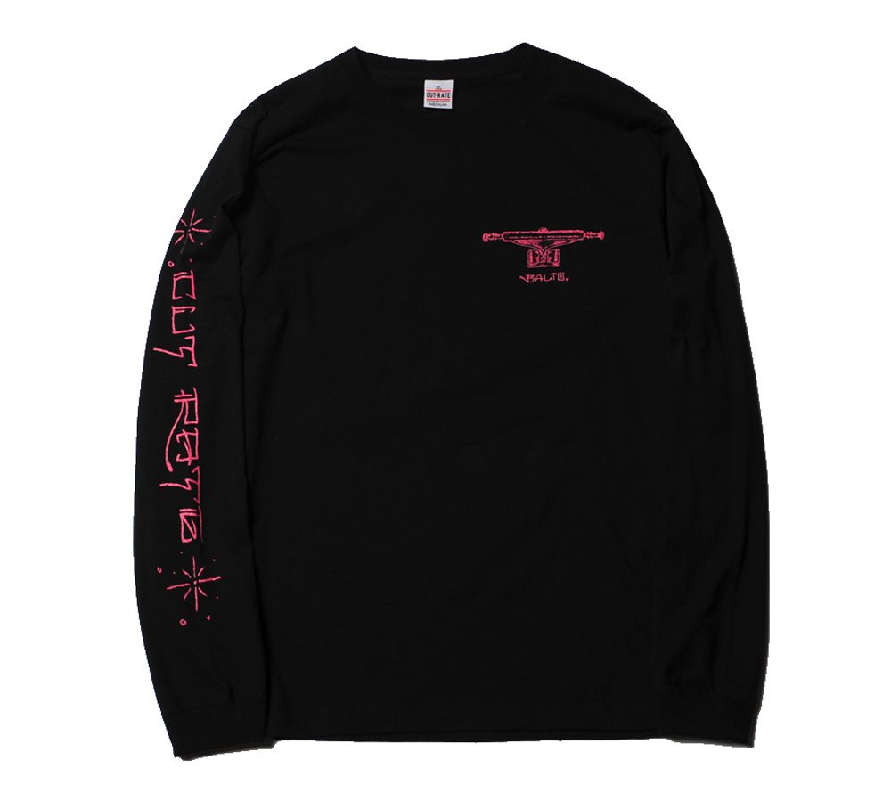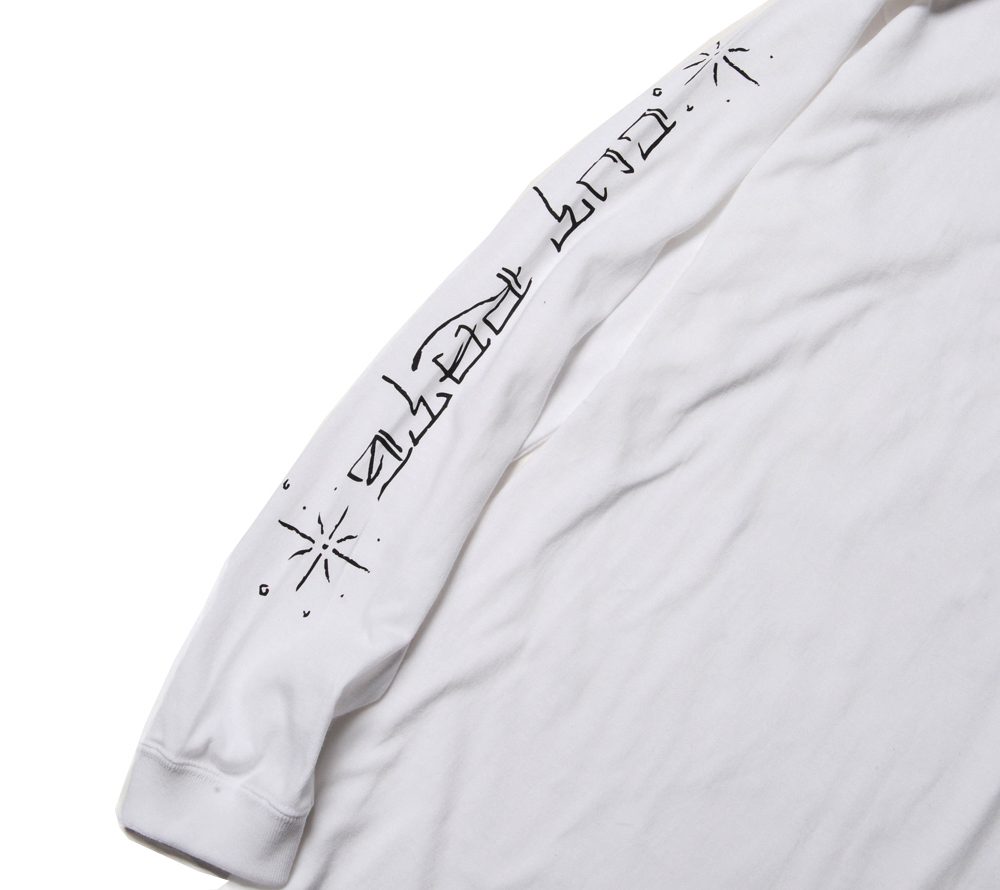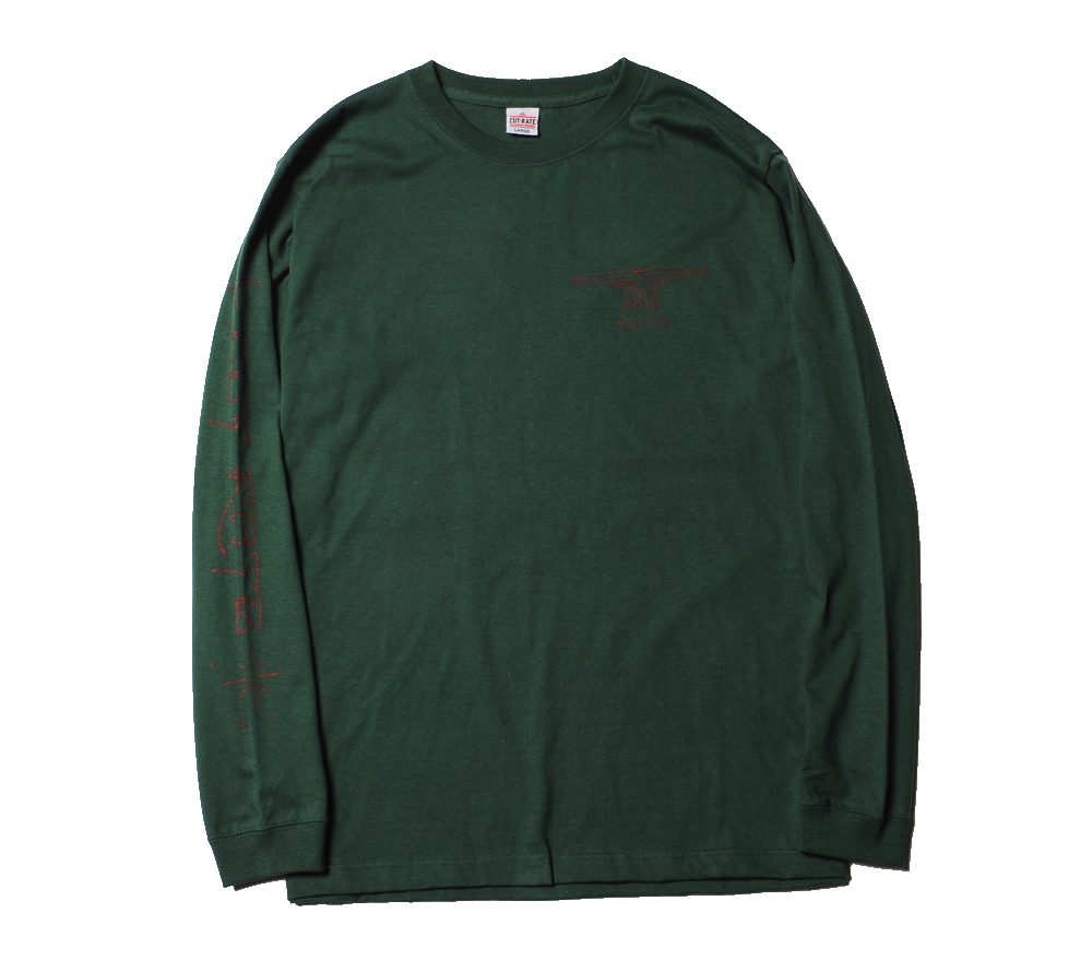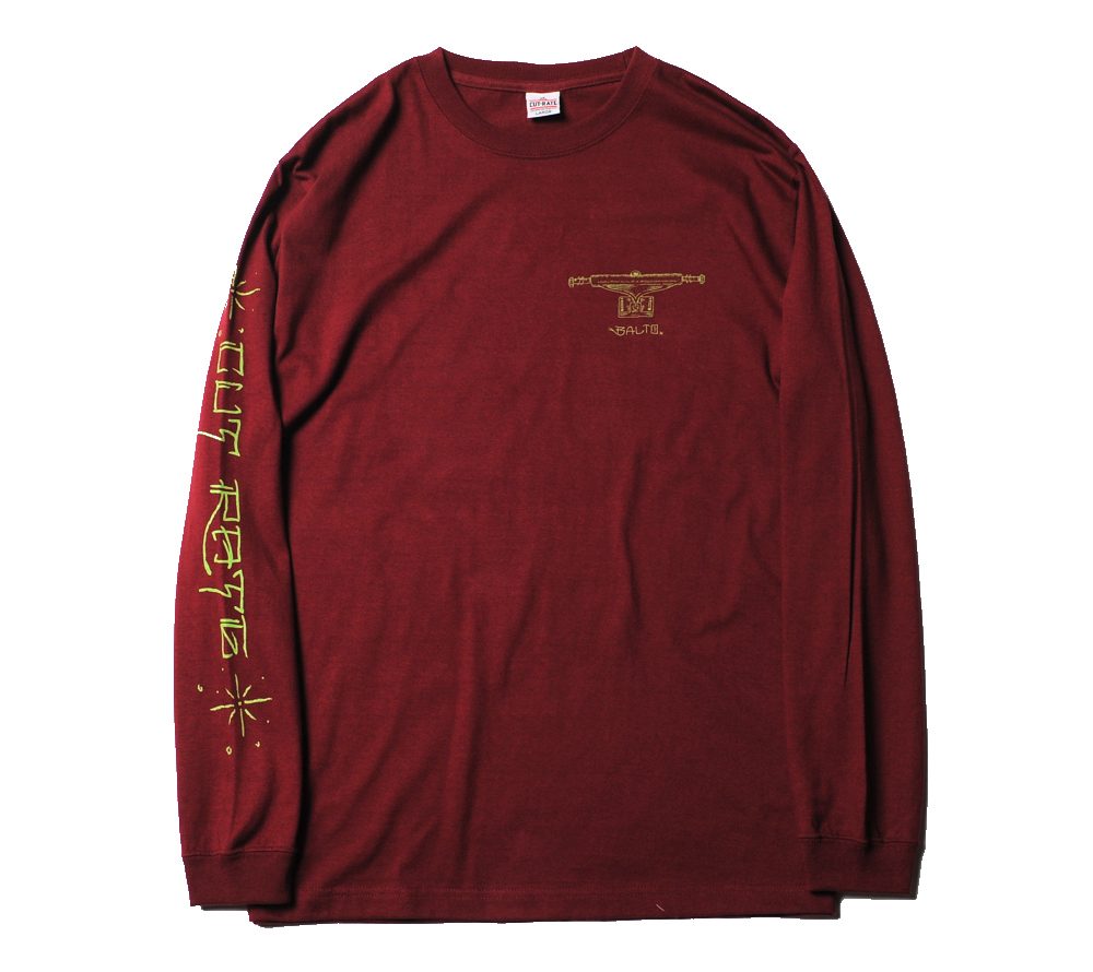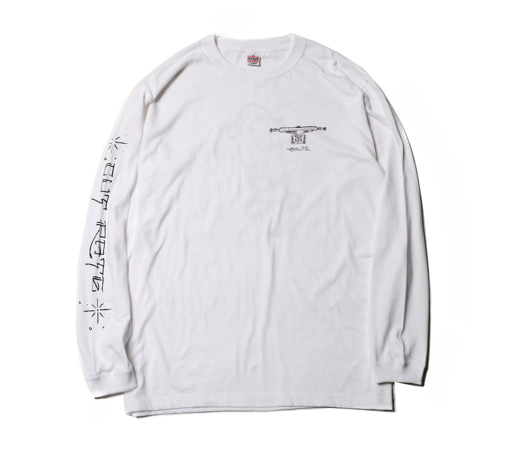 コットン100%ボディーで製作したL/S Tシャツです。フロント左胸、バック、右袖にプリントが入ります。CUTRATEのバックカルチャーの一つ、スケートカルチャーを反映させたオールドスケートな一枚。一枚でもレイヤードでも着用したいL/S Tシャツです。