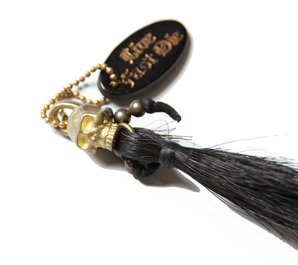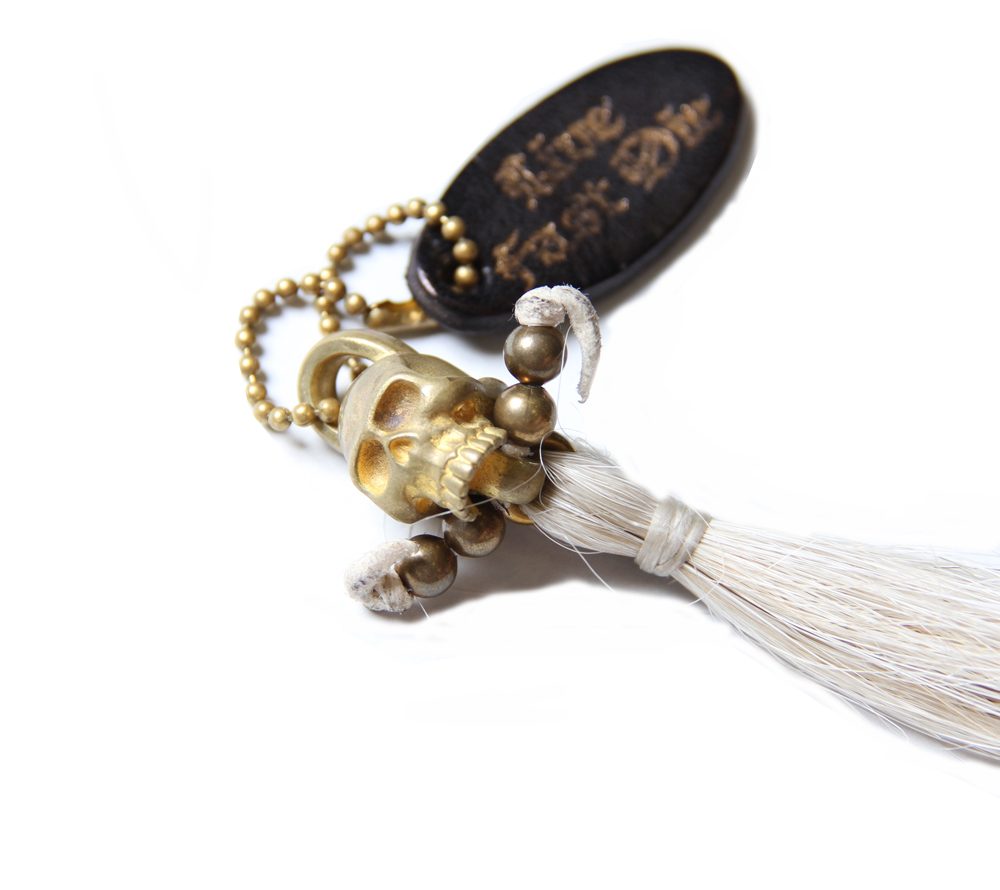 スカルパーツを使用し、作製されたスカルチャーム。ホースヘアのフリンジを使用しており、雰囲気良く仕上がっております。キーリングに付けてご使用頂くと腰回りのアクセントとして重宝するアイテムではないでしょうか。また、キーリングだけではなく、バック等の小物等にも付けたりと様々なアイテムのアクセントとしてご使用頂けます。