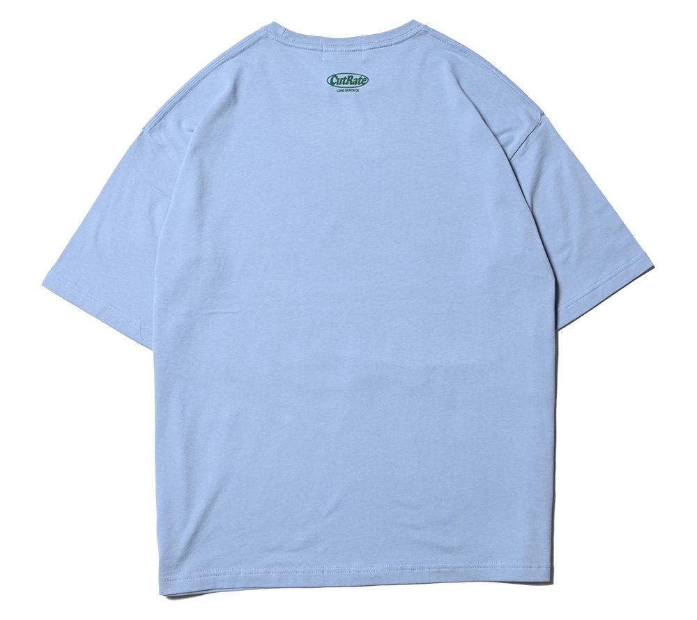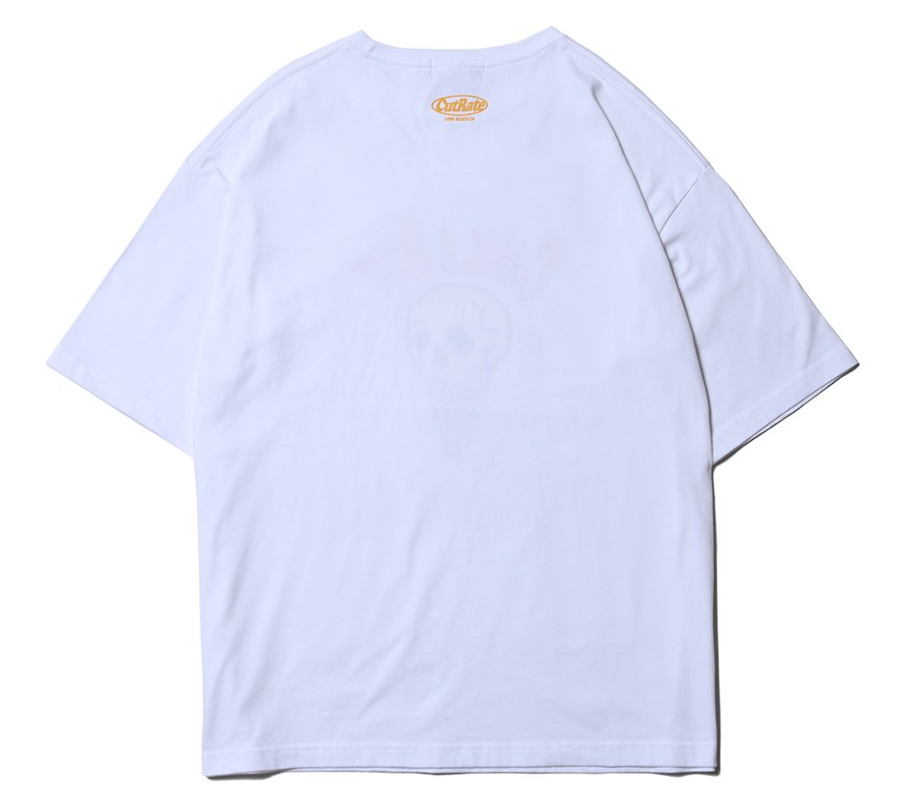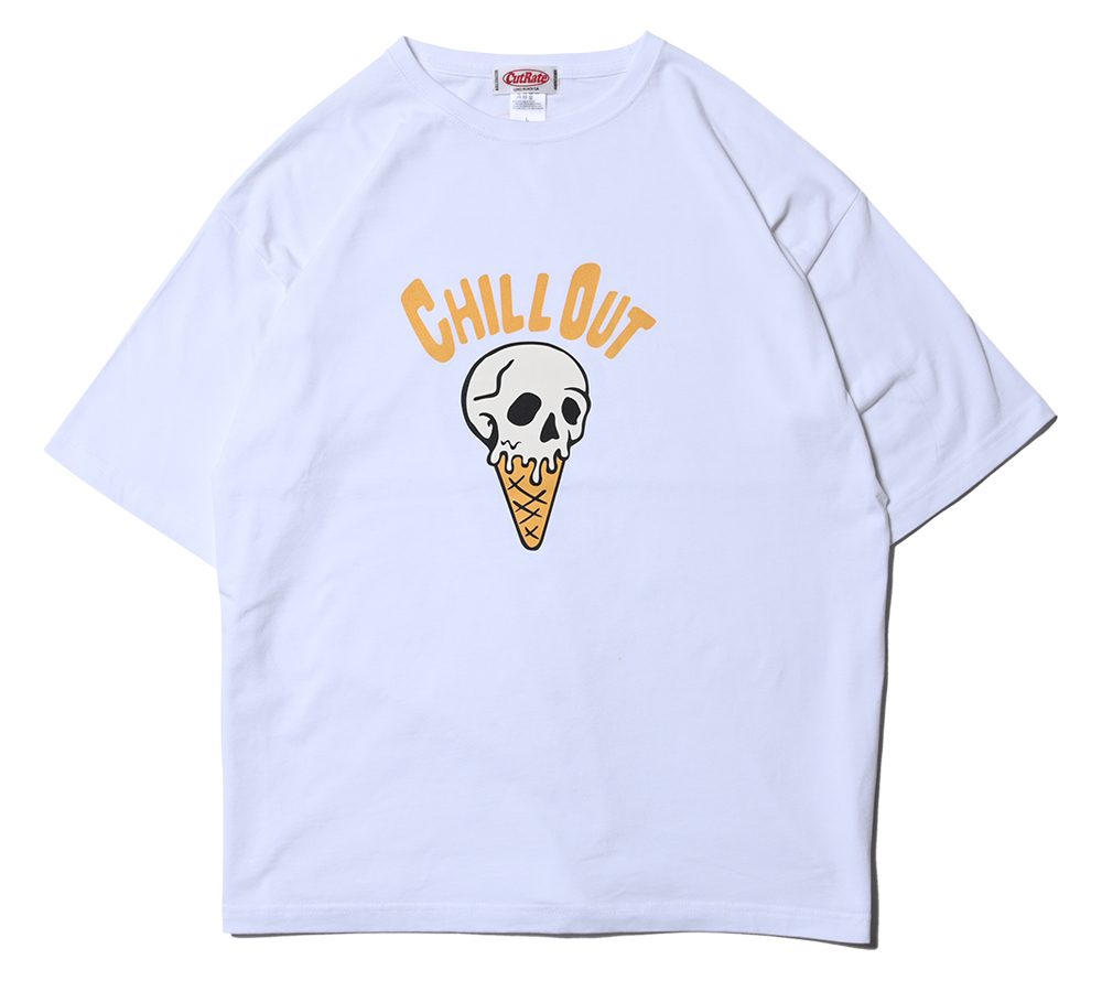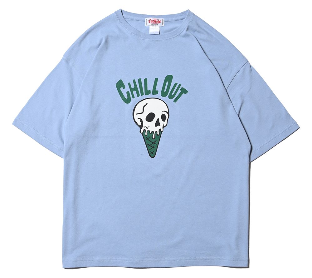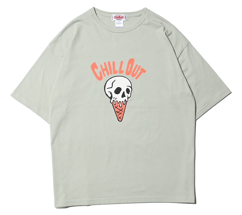 SKULLS CHILL OUTをアイスクリームのグラフィックに落とし込んだデザイン。バック首元にCUTRATEロゴがワンポイントで入る。シルエットはドロップショルダーで製作。